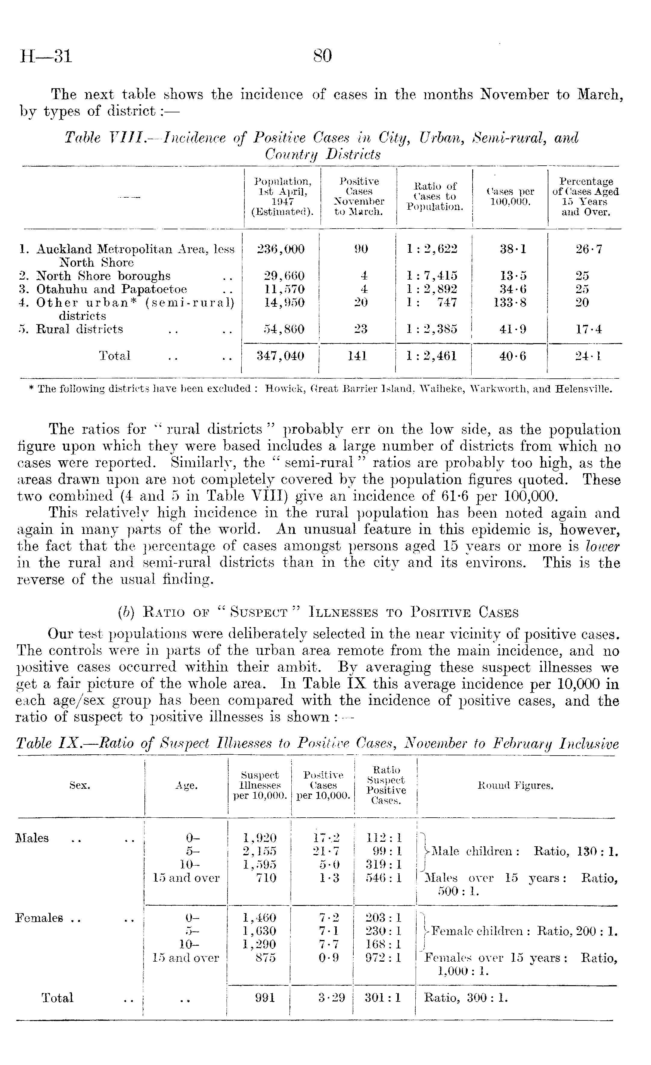 The ratios for " rural districts " probably err On tlie low side, as the population figure upon which they were based includes a large number of districts from which no cases were reported. Similarly, the " semi-rural" ratios are probably too high, as the areas drawn upon are not completely covered by the population figures quoted. These two combined (4 and 5 in Table VIII) give an incidence of 61-6 per 100,000. This relatively high incidence in the rural population has been noted again and again in many parts of the world. An unusual feature in this epidemic is, however, the fact that the percentage of cases amongst persons aged 15 years or more is loiver in the rural and semi-rural districts than in the city and its environs. This is the reverse of the usual finding. (b) Ratio of " Suspect " Illnesses to Positive Cases Our test populations were deliberately selected in the near vicinity of positive cases. The controls were in parts of the urban area remote from the main incidence, and no positive cases occurred within their ambit. By averaging these suspect illnesses we get a fair picture of the whole area. In Table IX this average incidence per 10,000 in each age/sex group has been compared with the incidence of positive cases, and the ratio of suspect to positive illnesses is shown :