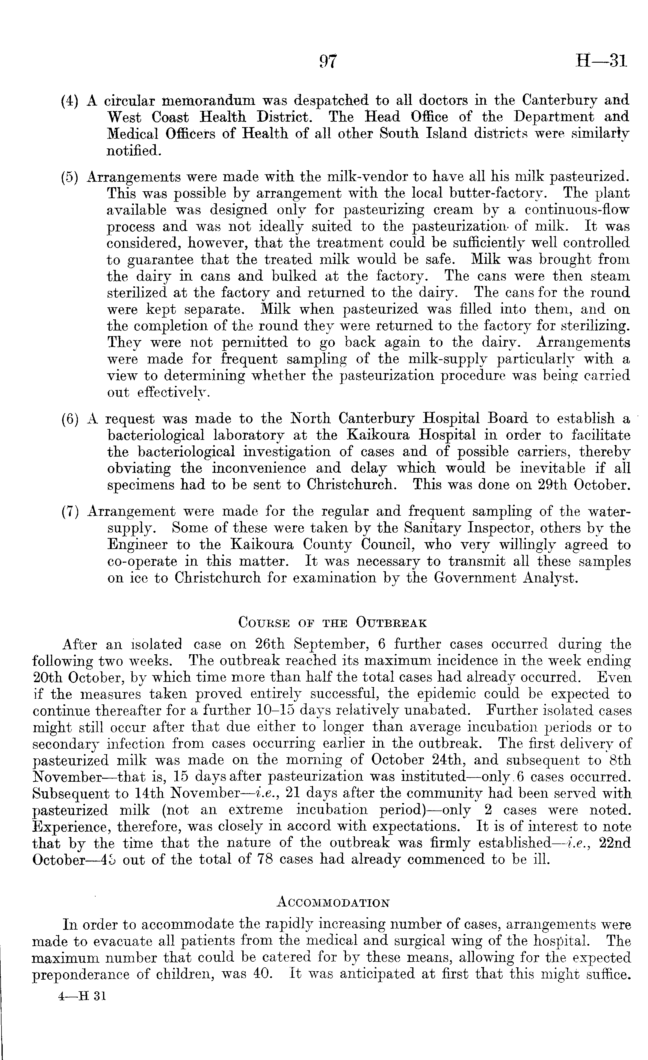 (4) A circular memorandum was despatched to all doctors in the Canterbury and West Coast Health District. The Head Office of the Department and Medical Officers of Health of all other South Island districts Were similarly notified. (5) Arrangements were made with the milk-vendor to have all his milk pasteurized. This was possible by arrangement with the local butter-factory. The plant available was designed only for pasteurizing cream by a continuous-flow process and was not ideally suited to the pasteurization- of milk. It was considered, however, that the treatment could be sufficiently well controlled to guarantee that the treated milk would be safe. Milk was brought from the dairy in cans and bulked at the factory. The cans were then steam sterilized at the factory and returned to the dairy. The cans for the round were kept separate. Milk when pasteurized was filled into them, and on the completion of the round they were returned to the factory for sterilizing. They were not permitted to go back again to the dairy. Arrangements were made for frequent sampling of the milk-supply particularly with a view to determining whether the pasteurization procedure was being carried out effectively. (6) A request was made to the North Canterbury Hospital Board to establish a bacteriological laboratory at the Kaikoura Hospital in order to facilitate the bacteriological investigation of cases and of possible carriers, thereby obviating the inconvenience and delay which would be inevitable if all specimens had to be sent to Christchurch. This was done on 29th October. (7) Arrangement were made for the regular and frequent sampling of the watersupply. Some of these were taken by the Sanitary Inspector, others by the Engineer to the Kaikoura County Council, who very willingly agreed to co-operate in this matter. It was necessary to transmit all these samples on ice to Christchurch for examination by the Government Analyst. Course of the Outbreak After an isolated case on 26th September, 6 further cases occurred during the following two weeks. The outbreak reached its maximum incidence in the week ending 20th October, by which time more than half the total cases had already occurred. Even if the measures taken proved entirely successful, the epidemic could be expected to continue thereafter for a further 10-15 days relatively unabated. Further isolated cases might still occur after that due either to longer than average incubation periods or to secondary infection from cases occurring earlier in the outbreak. The first delivery of pasteurized milk was made on the morning of October 24th, and subsequent to Bth November —that is, 15 days after pasteurization Was instituted —only . 6 cases occurred. Subsequent to 14th November —i.e., 21 days after the community had been served with pasteurized milk (not an extreme incubation period)—only 2 cases were noted. Experience, therefore, was closely in accord with expectations. It is of interest to note that by the time that the nature of the outbreak was firmly established—i.e., 22nd October —4 o out of the total of 78 cases had already commenced to be ill. Accommodation In order to accommodate the rapidly increasing number of cases, arrangements were made to evacuate all patients from the medical and surgical wing of the hospital. The ma,vimnm number that could be catered for by these means, allowing for the expected preponderance of children, was 40. It was anticipated at first that this might suffice.