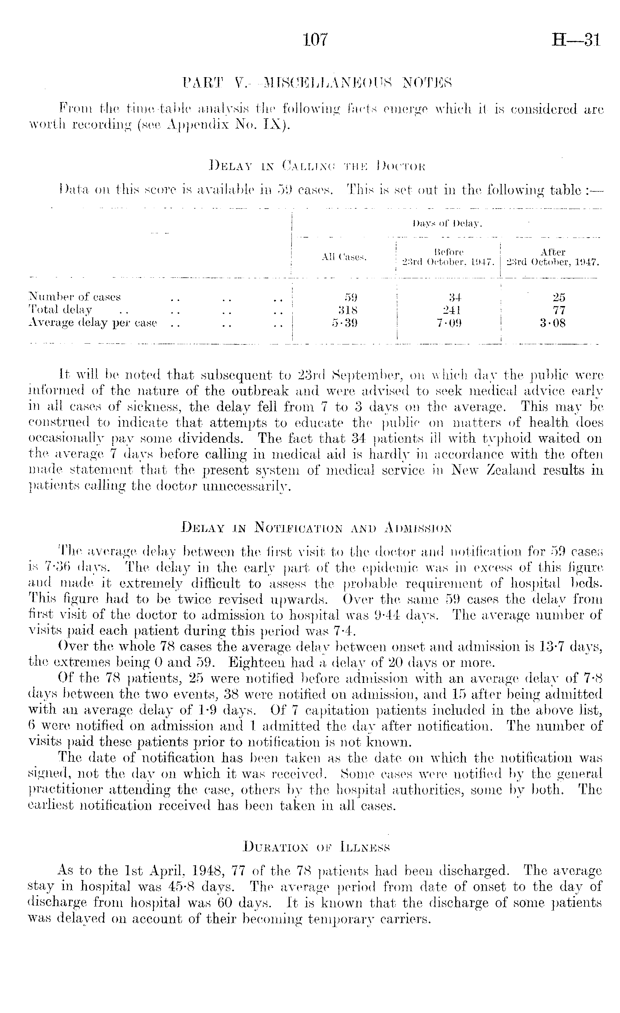 It will be noted that subsequent to '23 rd September, on which day the public were informed of the nature of the outbreak and were advised to seek medical advice early in all cases of sickness, the delay fell from 7to 3 days on the average. This may be construed to indicate that attempts to educate the public on matters of health does occasionally pay some dividends. The fact that 34 patients ill with typhoid waited on the average 7 days before calling in medical aid is hardly in accordance with the often made statement that the present system of medical service in New Zealand results in patients calling the doctor unnecessarily. Delay in Notification and Admission The average delay between the first visit to the doctor and notification for 59 cases is 7-36 days. The delay in the early part of the epidemic was in excess of this figure and made it extremely difficult to assess the probable requirement of hospital beds. This figure had to be twice revised upwards. Over the same 59 cases the delay from first visit of the doctor to admission to hospital was 944 days. The average number of visits paid each patient during this period was 7-4. Over the whole 78 cases the average delay between onset and admission is 13-7 days, the extremes being 0 and 59. Eighteen had a delay of 20 days or more. Of the 78 patients, 25 were notified before admission with an average delay of 7-8 days between the two events, 38 were notified on admission, and 15 after being admitted with an average delay of 1-9 days. Of 7 capitation patients included in the above list, 6 were notified on admission and 1 admitted the day after notification. The number of visits paid these patients prior to notification is not known. The date of notification has been taken as the date on which the notification was signed, not the day on which it was received. Some cases were notified by the general practitioner attending the case, others by the hospital authorities, some by both. The earliest notification received has been taken in all cases. Duration of Illness As to the Ist April, 1948, 77 of the 78 patients had been discharged. The average stay in hospital was 45-8 days. The average period from date of onset to the day of discharge from hospital was 60 days. It is known that the discharge of some patients was delayed on account of their becoming temporary carriers.