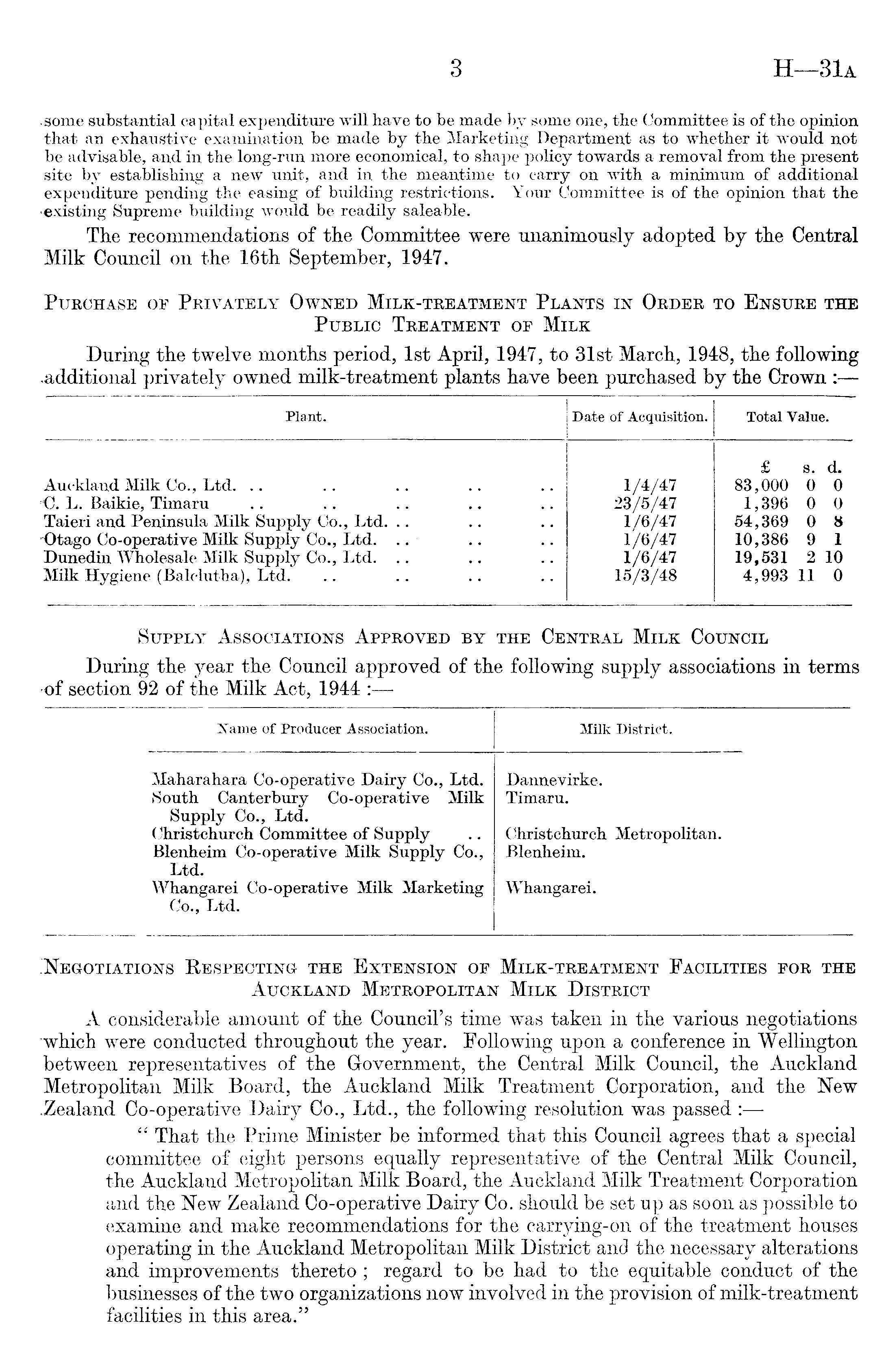 some substantial capital expenditure will have to be made by some one, the Committee is of the opinion that an exhaustive examination be made by the Marketing Department as to whether it would not be advisable, and in the long-run more economical, to shape policy towards a removal from the present site by establishing a new unit, and in the meantime to carry on with a minimum of additional expenditure pending the easing of building restrictions. Your Committee is of the opinion that the •existing Supreme building would be readily saleable. The recommendations of the Committee were unanimously adopted by the Central Milk Council on the 16th September, 1947. Purchase op Privately Owned Milk-treatment Plants in Order to Ensure the Public Treatment of Milk