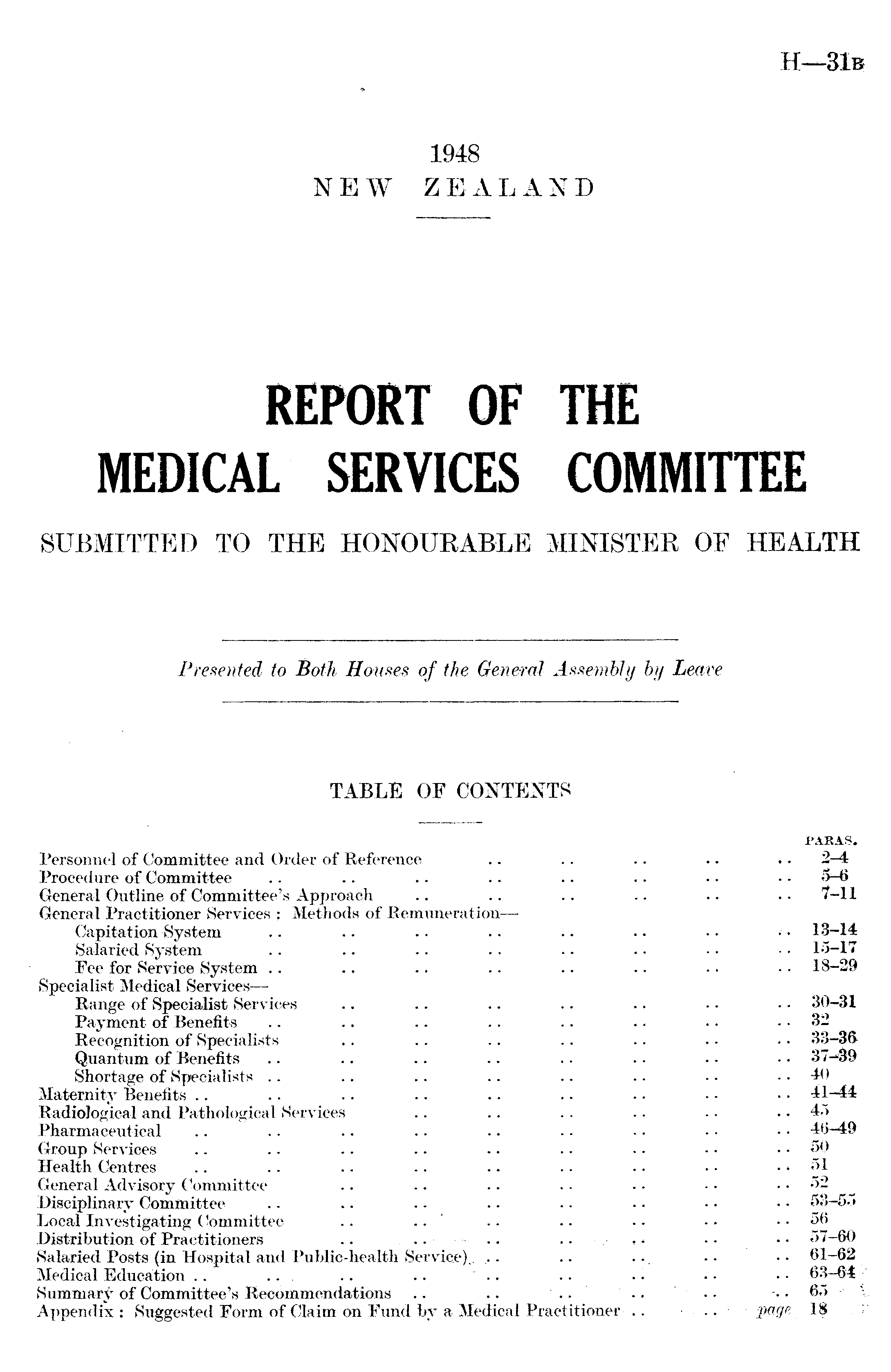 TABLE OF CONTENTS PARAS. Personnel of Committee and Order of Reference .. .. .. .. .. 2-4 Procedure of Committee .. .. .. .. .. . • • • • • 5-6 General Outline of Committee's Approach .. .. .. .. .. .. 7-11 General Practitioner Services ; Methods of Remuneration — Capitation System .. .. .. .. .. .. •• • • 13-14 Salaried System .. .. .. .. .. .. • • • • 15-17 Pee for Service System .. .. .. .. .. .. .. • • 18-29 Specialist Medical Services — Range of Specialist Services .. .. .. .. .. .. • • 30-31 Payment of Benefits .. .. .. .. .. .. • • 32 Recognition of Specialists .. .. .. .. .. . - • • 33-36 Quantum of Benefits .. .. .. .. .. .. . - • • 37-49 Shortage of Specialists .. .. .. .. .. .. .. .. -40 Maternity Benefits .. .. .. .. .. .. - • • • • • 41-44 Radiological and Pathological Services .. .. .. .. .. .. 45 Pharmaceutical .. .. .. .. .. .. .. • • - • 40-49 Group Services .. .. .. .. .. .. - • • - .. 50 Health Centres .. .. .. .. -. .. - • • • .» 51 General Advisory Committee .. .. -. .. • • • • 52 Disciplinary Committee .. .. .. .. . - •. ■ • • • 53-55 Local Investigating Committee .. .. ' .. .. - • • • .. 56 Distribution of Practitioners .. .. ... .. .. •• 57-60 Salaried Posts (in Hospital and Public-health Service).. .. .. .. .. •• 61-62 Medical Education .. .. . .. .. .. .. . • • • • - 63-64 Summary of Committee's Recommendations .. .. . . .. ..65 Appendix : Suggested Form of Claim on Fund by a Medical Practitioner .. .. page, 18