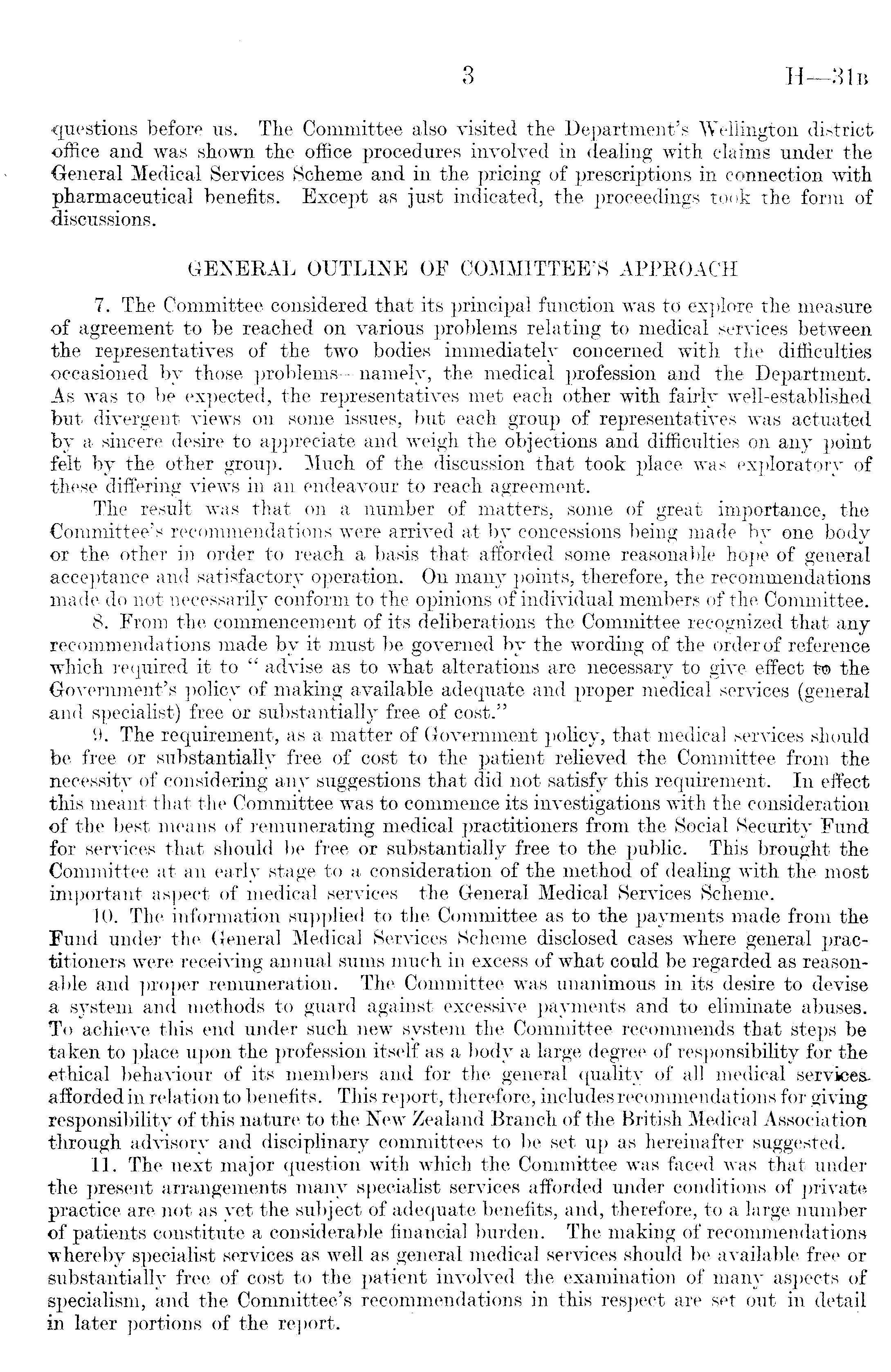 questions before us. The Committee also visited the Department's Weliington district office and was shown the office procedures involved in dealing with claims under the General Medical Services Scheme and in the pricing of prescriptions in connection with pharmaceutical benefits. Except as just indicated, the proceedings took the form of discussions. GENERAL OUTLINE OF COMMITTEE'S APPROACH 7. The Committee considered that its principal function was to explore the measure of agreement to be reached on various problems relating to medical services between the representatives of the two bodies immediately concerned with the difficulties occasioned by those problems—namely, the medical profession and the Department. As was to be expected, the representatives met each other with fairly well-established but divergent views on some issues, but each group of representatives was actuated by a sincere desire to appreciate and weigh the objections and difficulties on any point felt by the other group. Much of the discussion that took place was exploratory of these differing views in an endeavour to reach agreement. The result was that on a number of matters, some of great importance, the Committee's recommendations were arrived at by concessions being made by one body or the other in order to reach a basis that afforded some reasonable hope of general acceptance and satisfactory operation. On many points, therefore, the recommendations made do not necessarily conform to the opinions of individual members of the Committee. 8. From the commencement of its deliberations the Committee recognized that any recommendations made by it must be governed by the wording of the order of reference which required it to " advise as to what alterations are necessary to give effect t© the Government's policy of making available adequate and proper medical services (general and specialist) free or substantially free of cost." 9. The requirement, as a matter of Government policy, that medical services should be free or substantially free of cost to the patient relieved the Committee from the necessity of considering any suggestions that did not satisfy this requirement. In effect this meant that the Committee was to commence its investigations with the consideration of the best means of remunerating medical practitioners from the Social Security Fund for services that should be free or substantially free to the public. This brought the Committee at an early stage to a consideration of the method of dealing with the most important aspect of medical services—the General Medical Services Scheme. 10. The information supplied to the Committee as to the payments made from the Fund under the General Medical Services Scheme disclosed cases where general practitioners were receiving annual sums much in excess of what could be regarded as reasonable and proper remuneration. The Committee was unanimous in its desire to devise a system and methods to guard against excessive payments and to eliminate abuses. To achieve this end under such new system the Committee recommends that steps be taken to place upon the profession itself as a body a large degree of responsibility for the ethical behaviour of its members and for the general quality of all medical servicesafforded in relation to benefits. This report, therefore, includes recommendations for giving responsibility of this nature to the New Zealand Branch of the British Medical Association through advisory and disciplinary committees to be set up as hereinafter suggested. 11. The next major question with which the Committee was faced was that under the present arrangements many specialist services afforded under conditions of private practice are not as yet the subject of adequate benefits, and, therefore, to a large number of patients constitute a considerable financial burden. The making of recommendations whereby specialist services as well as general medical services should be available free or substantially free of cost to the patient involved the examination of many aspects of specialism, and the Committee's recommendations in this respect are set out in detail in later portions of the report.