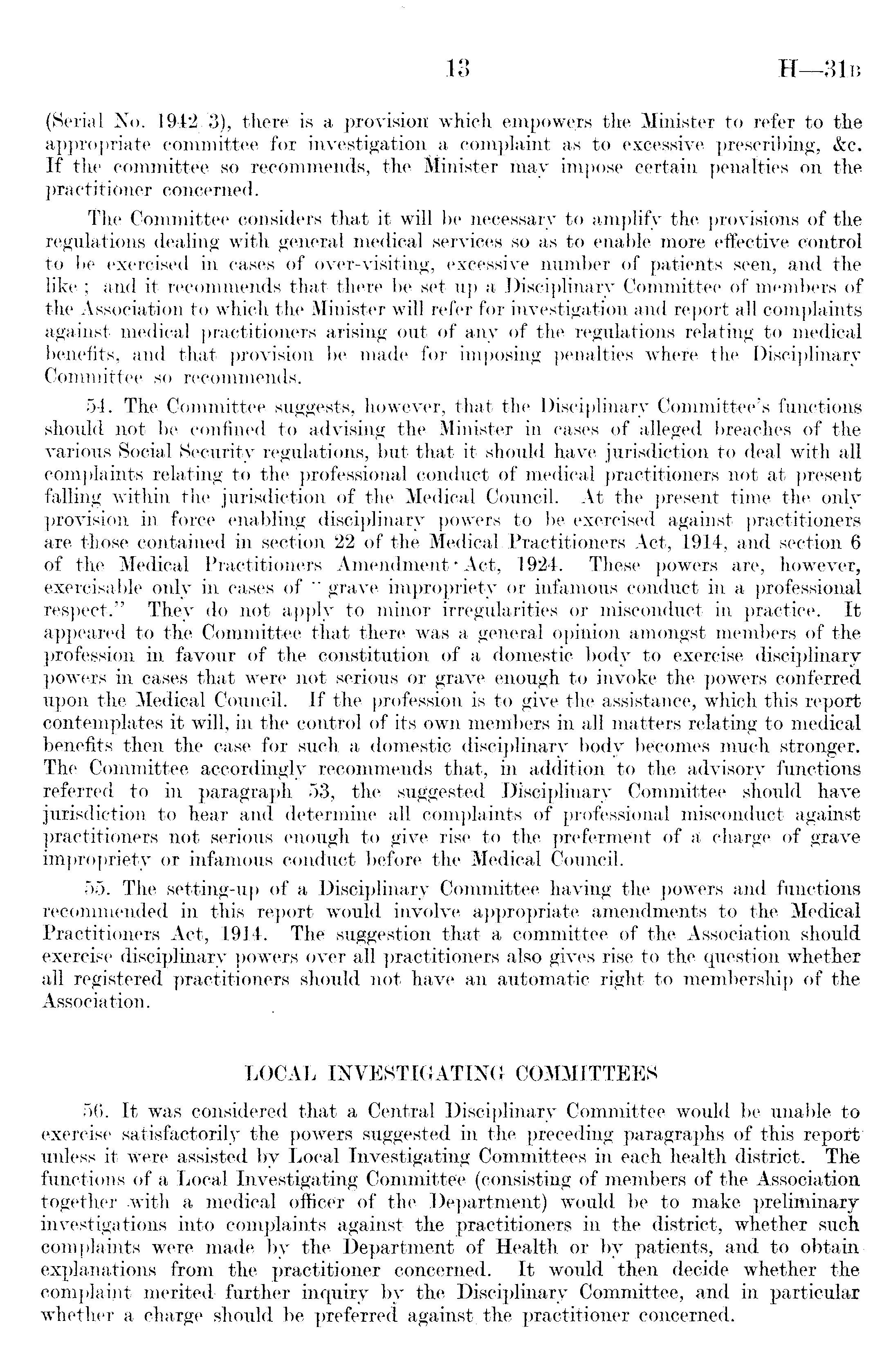 (Serial No. 1942/3), there is a provision which empowers the Minister to refer to the appropriate committee for investigation a complaint as to excessive prescribing, &c. If the committee so recommends, the Minister may impose certain penalties on the practitioner concerned. The Committee considers that it will be necessary to amplify the provisions of the regulations dealing with general medical services so as to enable more effective control to be exercised in cases of over-visiting, excessive number of patients seen, and the like ; and it recommends that there be set up a Disciplinary Committee of members of the Association to which the Minister will refer for investigation and report all complaints against medical practitioners arising out of any of the regulations relating to medical benefits, and that provision be made for imposing penalties where the Disciplinary Committee so recommends. 54. The Committee suggests, however, that the Disciplinary Committee's functions should not be confined to advising the Minister in cases of alleged breaches of the various Social Security regulations, but that it should have jurisdiction to deal with all complaints relating to the professional conduct of medical practitioners not at present falling within the jurisdiction of the Medical Council. At the present time the only provision in force enabling disciplinary powers to be exercised against practitioners are those contained in section 22 of the Medical. Practitioners Act, 1914, and section 6 of the Medical Practitioners Amendment • Act, 1924. These powers are, however, exercisable only in cases of " grave impropriety or infamous conduct in a professional respect." They do not apply to minor irregularities or misconduct in practice. It appeared to the Committee that there was a general opinion amongst members of the profession in favour of the constitution of a domestic body to exercise disciplinary powers in cases that were not serious or grave enough to invoke the powers conferred upon the Medical Council. If the profession is to give the assistance, which this report contemplates it will, in the control of its own members in all matters relating to medical benefits then the case for such a domestic disciplinary body becomes much stronger. The Committee accordingly recommends that, in addition to the advisory functions referred to in paragraph 53, the suggested Disciplinary Committee should have jurisdiction to hear and determine all complaints of professional misconduct agaiiist practitioners fiot serious enough to give rise to the preferment of a charge of grave impropriety or infamous conduct before the Medical Council. 55. The setting-up of a Disciplinary Committee having the powers and functions recommended in this report would involve appropriate amendments to the Medical Practitioners Act, 1914. The' suggestion that a committee of the Association should exercise disciplinary powers over all practitioners also gives rise to the question whether all registered practitioners should not have an automatic right to membership of the Association. LOCAL INVESTIGATING COMMITTEES 56. It was considered that a Central Disciplinary Committee would be unable to exercise satisfactorily the powers suggested in the preceding paragraphs of this report unless it Were assisted by Local Investigating Committees in each health district. The functions of a Local Investigating Committee (consisting of members of the Association together with a medical officer of the Department) would be to make preliminary investigations into complaints against the practitioners in the district, whether such complaints were made by the Department of Health or by patients, and to obtain explanations from the practitioner concerned. It would then decide whether the complaint merited further inquiry by the Disciplinary Committee, and in particular whether a charge should be preferred against, the practitioner concerned.