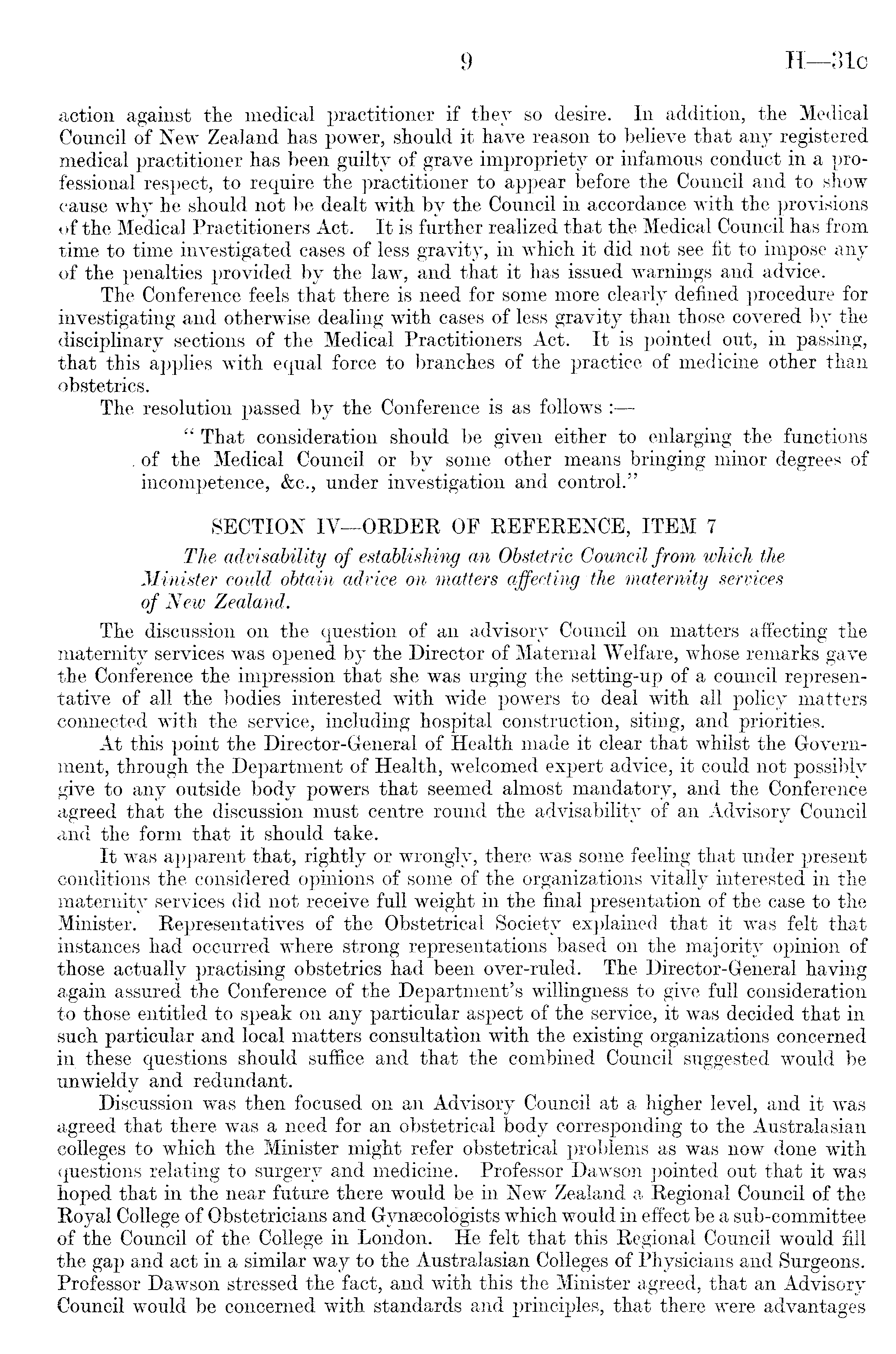 action against the medical practitioner if they so desire. In addition, the Medical Council of New Zealand has power, should it have reason to believe that any registered medical practitioner has been guilty of grave impropriety or infamous conduct in a professional respect, to require the practitioner to appear before the Council and to show cause why he should not be dealt with by the Council in accordance with the provisions of the Medical Practitioners Act. It is further realized that the Medical Council has from time to time investigated cases of less gravity, in which it did not see fit to impose any of the penalties provided by the law, and that it has issued warnings and advice. The Conference feels that there is need for some more clearly defined procedure for investigating and otherwise dealing with cases of less gravity than those covered by the disciplinary sections of the Medical Practitioners Act. It is pointed out, in passing, that this applies with equal force to branches of the practice of medicine other than obstetrics. The resolution passed by the Conference is as follows : " That consideration should be given either to enlarging the functions . of the Medical Council or by some other means bringing minor degrees of incompetence, &c., under investigation and control." SECTION IV—ORDER OF REFERENCE, ITEM 7 The advisability of establishing an Obstetric Council from which the Minister could obtain advice on matters affecting the maternity services of New Zealand. The discussion on the question of an advisory Council on matters affecting the maternity services was opened by the Director of Maternal Welfare, whose remarks gave the Conference the impression that she was urging the setting-up of a council representative of all the bodies interested with wide powers to deal with all policy matters connected with the service, including hospital construction, siting, and priorities. At this point the Director-General of Health made it clear that whilst the Government, through the Department of Health, welcomed expert advice, it could not possibly give to any outside body powers that seemed almost mandatory, and the Conference agreed that the discussion must centre round the advisability of an Advisory Council and the form that it should take. It was apparent that, rightly or wrongly, there was some feeling that under present conditions the considered opinions of some of the organizations vitally interested in the maternity services did not receive full weight in the final presentation of the case to the Minister. Representatives of the Obstetrical Society explained that it was felt that instances had occurred where strong representations based on the majority opinion of those actually practising obstetrics had been over-ruled. The Director-General having again assured the Conference of the Department's willingness to give full consideration to those entitled to speak on any particular aspect of the service, it was decided that in such particular and local matters consultation with the existing organizations concerned in these questions should suffice and that the combined Council suggested would be unwieldy and redundant. Discussion was then focused on an Advisory Council at a higher level, and it was agreed that there was a need for an obstetrical body corresponding to the Australasian colleges to which the Minister might refer obstetrical problems as was now done with questions relating to surgery and medicine. Professor Dawson pointed out that it was hoped that in the near future there would be in New Zealand a Regional Council of the Royal College of Obstetricians and Gynaecologists which would in effect be a sub-committee of the Council of the College in London. He felt that this Regional Council would fill the gap and act in a similar way to the Australasian Colleges of Physicians and Surgeons. Professor Dawson stressed the fact, and with this the Minister agreed, that an Advisory Council would be concerned with standards and principles, that there were advantages