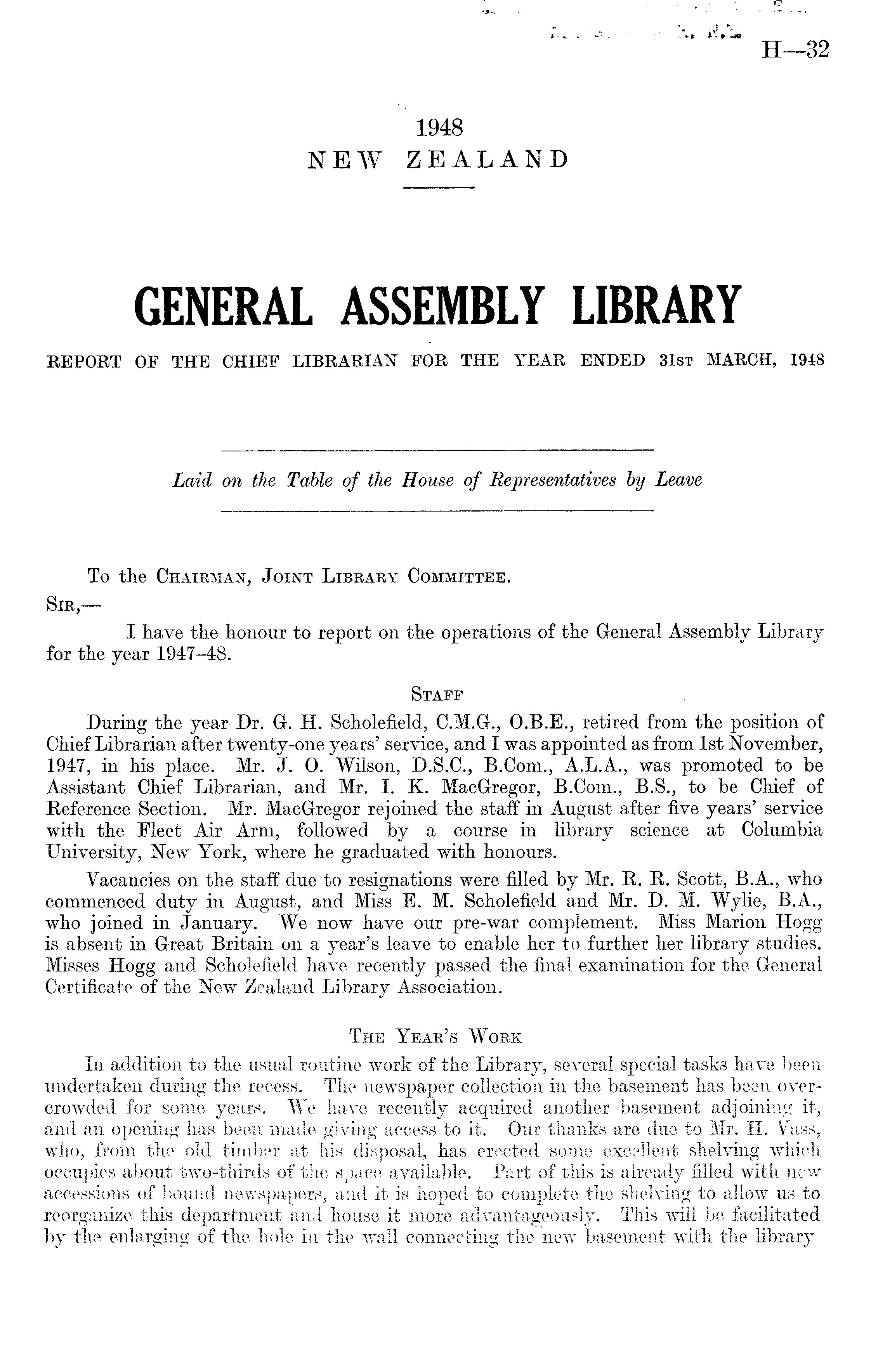 To the Chairman, Joint Library Committee. Sir, — I have the honour to report on the operations of the General Assembly Library for the year 1947-48. Staff During the year Dr. G. H. Scholefield, C.M.G., 0.8. E., retired from the position of Chief Librarian after twenty-one years' service, and I was appointed as from Ist November, 1947, in his place. Mr. J. 0. Wilson, D.S.C., 8.C0m., A.L.A., was promoted to be Assistant Chief Librarian, and Mr. I. K. MacGregor, 8.C0m., 8.5., to be Chief of Reference Section. Mr. MacGregor rejoined the staff in August after five years' service with the Fleet Air Arm, followed by a course in library science at Columbia University, New York, where he graduated with honours. Vacancies on the staff due to resignations were filled by Mr. R. R. Scott, 8.A., who commenced duty in August, and Miss E. M. Scholefield and Mr. D. M. Wylie, 8.A., who joined in January. We now have our pre-war complement. Miss Marion Hogg is absent in Great Britain on a year's leave to enable her to further her library studies. Misses Hogg and Scholefield have recently passed the final examination for the General Certificate of the New Zealand Library Association. The Year's Work In addition to the usual routine work of the Library, several special tasks have been undertaken during the recess. The newspaper collection in the basement has been overcrowded for some years. We have recently acquired another basement adjoining it, and an opening has been made giving access to it. Our thanks are due to Mr. H. Vass, who, from the old timber at his disposal, has erected some excellent shelving which occupies about two-thirds of the space available. Part of this is already filled with new accessions of bound newspapers, and it is hoped to complete the shelving to allow us to reorganize this department and house it more advantageously. This will be facilitated by the enlarging of the hole in the wall connecting the new basement with the library