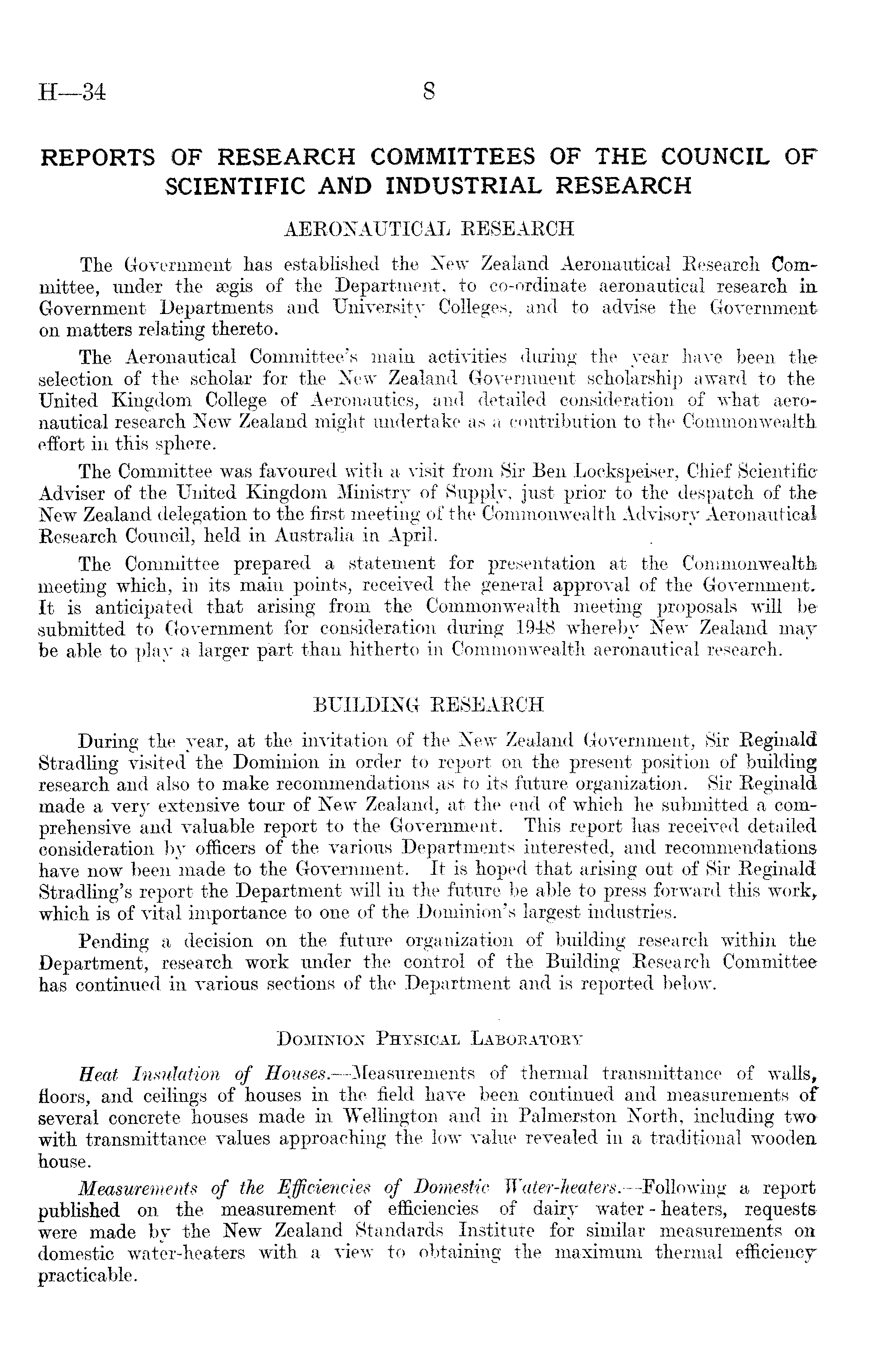 REPORTS OF RESEARCH COMMITTEES OF THE COUNCIL OF SCIENTIFIC AND INDUSTRIAL RESEARCH AERONAUTICAL RESEARCH The Government has established the New Zealand Aeronautical Research Committee, under the aegis of the Department, to co-ordinate aeronautical research in Government Departments and University Colleges, and to advise the Government on matters relating thereto. The Aeronautical Committee's main activities during the year have been the selection of the scholar for the New Zealand Government scholarship award to the United Kingdom College of Aeronautics, and detailed consideration of what aeronautical research New Zealand might undertake as a contribution to the Commonwealth effort in this sphere. The Committee was favoured with a visit from Sir Ben Lockspeiser, Chief Scientific Adviser of the United Kingdom Ministry of Supply, just prior to the despatch of the New Zealand delegation to the first meeting of the Commonwealth Advisory Aeronautical Research Council, held in Australia in April. The Committee prepared a statement for presentation at the Commonwealth meeting which, in its main points, received the general approval of the Government, It is anticipated that arising from the Commonwealth meeting proposals will be submitted to Government for consideration during 1948 whereby New Zealand may be able to play a larger part than hitherto in Commonwealth aeronautical research. BUILDING RESEARCH During the year, at the invitation of the New Zealand Government, Sir Reginald Stradling visited the Dominion in order to report on the present position of building research and also to make recommendations as to its future organization. Sir Reginald made a very extensive tour of New Zealand, at the end of which he submitted a comprehensive and valuable report to the Government. This report has received detailed consideration by officers of the various Departments interested, and recommendations have now been made to the Government. It is hoped that arising out of Sir Reginald Stradling's report the Department will in the future be able to press forward this work,, which is of vital importance to one of the Dominion's largest industries. Pending a decision on the future organization of building research within the Department, research work under the control of the Building Research Committee has continued in various sections of the Department and is reported below. Dominion Physical Laboratory Heat Insulation of bowses.—Measurements of thermal transmittance of walls, floors, and ceilings of houses in the field have been continued and measurements of several concrete houses made in Wellington and in Palmerston North, including twc with transmittance values approaching the low value revealed in a traditional wooden house. Measurements of the Efficiencies of Domestic Water-heaters.—Following a report published on the measurement of efficiencies of dairy water - heaters, requests were made by the New Zealand Standards Institute for similar measurements on domestic water-heaters with a view to obtaining the maximum thermal efficiency practicable.