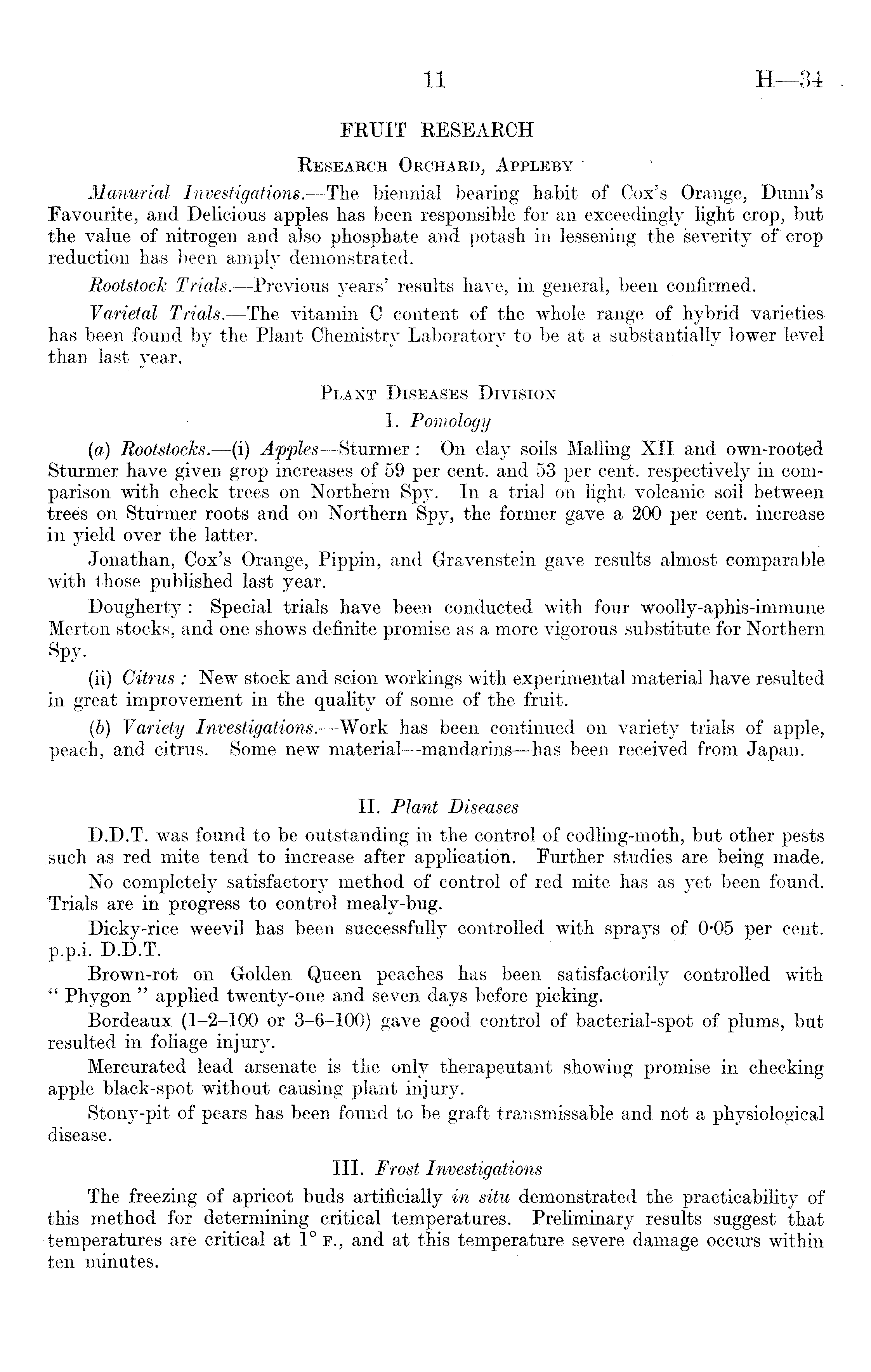 FRUIT RESEARCH Research Orchard, Appleby Manurial Investigations.—The biennial bearing habit of Cox's Orange, Dunn's Favourite, and Delicious apples has been responsible for an exceedingly light crop, but the value of nitrogen and also phosphate and potash in lessening the severity of crop reduction has been amply demonstrated. RootstocJc Trials.—Previous years' results have, in general, been confirmed. Varietal Trials.—The vitamin C content of the whole range of hybrid varieties has been found by the Plant Chemistry Laboratory to be at a substantially lower level than last year. Plant Diseases Division I. Pomology {a) RootstocJcs. —(i) A*p<ples—Sturmer: On clay soils Mailing XII and own-rooted Sturmer have given grop increases of 59 per cent, and 53 per cent, respectively in comparison with check trees on Northern Spy. In a trial on light volcanic soil between trees on Sturmer roots and on Northern Spy, the former gave a 200 per cent, increase in yield over the latter. Jonathan, Cox's Orange, Pippin, and Gravenstein gave results almost comparable with those published last year. Dougherty : Special trials have been conducted with four woolly-aphis-immune Merton stocks, and one shows definite promise as a more vigorous substitute for Northern Spy. (ii) Citrus : New stock and scion workings with experimental material have resulted in great improvement in the quality of some of the fruit. (b) Variety Investigations.—Work has been continued on variety trials of apple, peach, and citrus. Some new material—mandarins—has been received from Japan. 11. Plant Diseases D.D.T. was found to be outstanding in the control of codling-moth, but other pests such as red mite tend to increase after application. Further studies are being made. No completely satisfactory method of control of red mite has as yet been found. Trials are in progress to control mealy-bug. Dicky-rice weevil has been successfully controlled with sprays of o*os per cent, p.p.i. D.D.T. Brown-rot on Golden Queen peaches has been satisfactorily controlled with " Phygon " applied twenty-one and seven days before picking. Bordeaux (1-2-100 or 3-6-100) gave good control of bacterial-spot of plums, but resulted in foliage injury. Mercurated lead arsenate is the only therapeutant showing promise in checking apple black-spot without causing plant injury. Stony-pit of pears has been found to be graft transmissable and not a physiological disease. 111. Frost Investigations The freezing of apricot buds artificially in situ demonstrated the practicability of this method for determining critical temperatures. Preliminary results suggest that temperatures are critical at 1° f., and at this temperature severe damage occurs within -ten minutes.