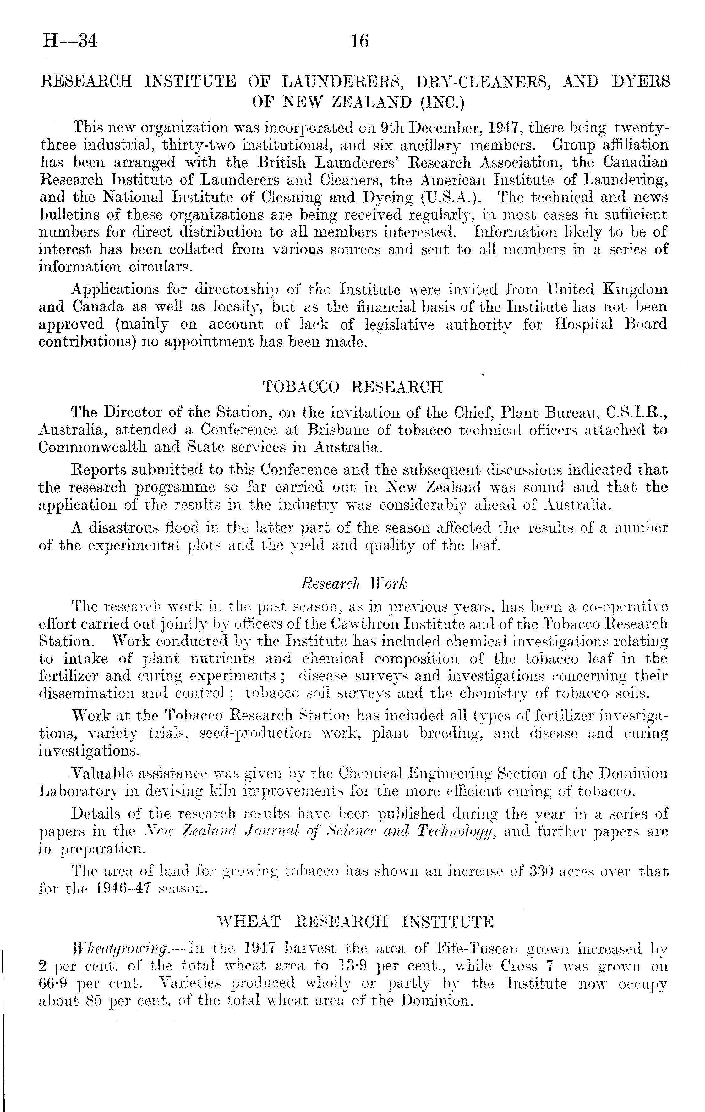 RESEARCH INSTITUTE OF LAUNDERERS, DRY-CLEANERS, AND DYERS OF NEW ZEALAND (INC.) This new organization was incorporated on 9th December, 1947, there being twentythree industrial, thirty-two institutional, and six ancillary members. Group affiliation has been arranged with the British Launderers' Research Association, the Canadian Research Institute of Launderers and Cleaners, the American Institute of Laundering, and the National Institute of Cleaning and Dyeing (U.S.A.). The technical and news bulletins of these organizations are being received regularly, in most cases in sufficient numbers for direct distribution to all members interested. Information likely to be of interest has been collated from various sources and sent to all members in a series of information circulars. Applications for directorship of the Institute were invited from United Kingdom and Canada as well as locally, but as the financial basis of the Institute has not been approved (mainly on account of lack of legislative authority for Hospital Board contributions) no appointment has been made. TOBACCO RESEARCH The Director of the Station, on the invitation of the Chief, Plant Bureau, C.5.1.R., Australia, attended a Conference at Brisbane of tobacco technical officers attached to Commonwealth and State services in Australia. Reports submitted to this Conference and the subsequent discussions indicated that the research programme so far carried out in New Zealand was sound and that the application of the results in the industry was considerably ahead of Australia. A disastrous flood in the latter part of the season affected the results of a number of the experimental plots and the yield and quality of the leaf. Research Work The research work in the past season, as in previous years, has been a co-operative effort carried out jointly by officers of the Cawthron Institute and of the Tobacco Research Station. Work conducted by the Institute has included chemical investigations relating to intake of plant nutrients and chemical composition of the tobacco leaf in the fertilizer and curing experiments ; disease surveys and investigations concerning their dissemination and control; tobacco soil surveys and the chemistry of tobacco soils. Work at the Tobacco Research Station has included all types of fertilizer investigations, variety trials, seed-production work, plant breeding, and disease and curing investigations. Valuable assistance was given by the Chemical Engineering Section of the Dominion Laboratory in devising kiln improvements for the more efficient curing of tobacco. Details of the research results have been published during the year in a series of papers in the New Zealand Journal of Science and Technology, and further papers are in preparation. The area of land for growing tobacco has shown an increase of 330 acres over that for the 1946-47 season. WHEAT RESEARCH INSTITUTE Wheatgrowing.—ln the 1947 harvest the area of Fife-Tuscan grown increased by 2 per cent, of the total wheat area to 13-9 per cent., while Cross 7 was grown on 66-9 per cent. Varieties produced wholly or partly by the Institute now occupy about 85 per cent, of the total wheat area of the Dominion.