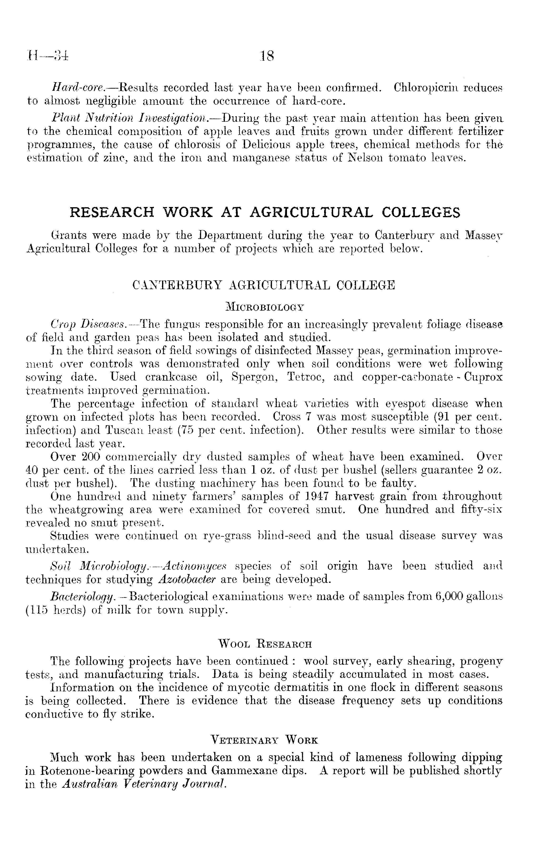 Hard-core. —Results recorded last year have been confirmed. Chloropicrin reduces to almost negligible amount the occurrence of hard-core. Plant Nutrition Investigation.—During the past year main attention has been given to the chemical composition of apple leaves and fruits grown under different fertilizer programmes, the cause of chlorosis of Delicious apple trees, chemical methods for the estimation of zinc, and the iron and manganese status of Nelson tomato leaves. RESEARCH WORK AT AGRICULTURAL COLLEGES Grants were made by the Department during the year to Canterbury and Massey Agricultural Colleges for a number of projects which are reported below. CANTERBURY AGRICULTURAL COLLEGE Microbiology Crop Diseases.— The fungus responsible for an increasingly prevalent foliage disease of field and garden peas has been isolated and studied. In the third season of field sowings of disinfected Massey peas, germination improvement over controls was demonstrated only when soil conditions were wet following sowing date. Used crankcase oil, Spergon, Tetroc, and copper-carbonate - Cuprox treatments improved germination. The percentage infection of standard wheat varieties with eyespot disease when grown on infected plots has been recorded. Cross 7 was most susceptible (91 per cent, infection) and Tuscan least ('75 per cent, infection). Other results were similar to those recorded last year. Over 200 commercially dry dusted samples of wheat have been examined. Over 40 per cent, of the lines carried less than 1 oz. of dust per bushel (sellers guarantee 2 oz. dust per bushel). The dusting machinery has been found to be faulty. One hundred and ninety farmers' samples of 1947 harvest grain from throughout the wheatgrowing area were examined for covered smut. One hundred and fifty-six revealed no smut present. Studies were continued on rye-grass blind-seed and the usual disease survey was undertaken. Soil Microbiology .—Actinomyces species of soil origin have been studied and techniques for studying Azotobacter are being developed. Bacteriology. —Bacteriological examinations were made of samples from 6,000 gallons (115 herds) of milk for town supply. Wool Research The following projects have been continued : wool survey, early shearing, progeny tests, and manufacturing trials. Data is being steadily accumulated in most cases. Information on the incidence of mycotic dermatitis in one flock in different seasons is being collected. There is evidence that the disease frequency sets up conditions conductive to fly strike. Veterinary Work Much work has been undertaken on a special kind of lameness following dipping in Rotenone-bearing powders and Gammexane dips. A report will be published shortly in the Australian Veterinary Journal.