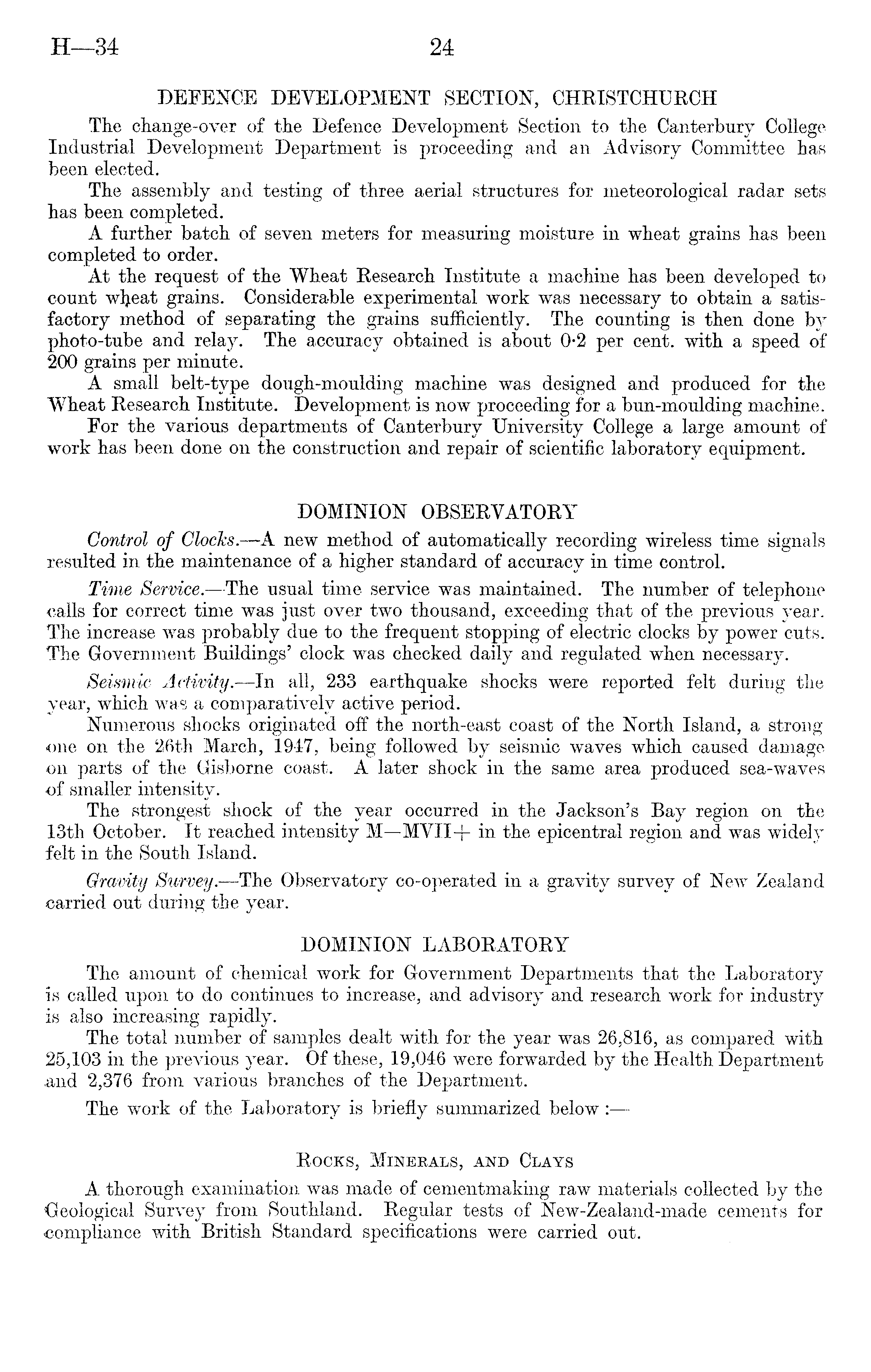 DEFENCE DEVELOPMENT SECTION, CHRISTCHURCH The change-over of the Defence Development Section to the Canterbury College Industrial Development Department is proceeding and an Advisory Committee has been elected. The assembly and testing of three aerial structures for meteorological radar sets has been completed. A further batch of seven meters for measuring moisture in wheat grains has been completed to order. At the request of the Wheat Research Institute a machine has been developed to count wljeat grains. Considerable experimental work was necessary to obtain a satisfactory method of separating the grains sufficiently. The counting is then done by photo-tube and relay. The accuracy obtained is about o*2 per cent, with a speed of 200 grains per minute. A small belt-type dough-moulding machine was designed and produced for the Wheat Research Institute. Development is now proceeding for a bun-moulding machine. For the various departments of Canterbury University College a large amount of work has been done on the construction and repair of scientific laboratory equipment. DOMINION OBSERVATORY Control of Clocks. —A new method of automatically recording wireless time signals resulted in the maintenance of a higher standard of accuracy in time control. Time Service— The usual time service was maintained. The number of telephone calls for correct time was just over two thousand, exceeding that of the previous year. The increase was probably due to the frequent stopping of electric clocks by power cuts. The Government Buildings' clock was checked daily and regulated when necessary. Seismic Activity. —In all, 233 earthquake shocks were reported felt during the year, which was a comparatively active period. Numerous shocks originated off the north-east coast of the North Island, a strong one on the 26th March, 1947, being followed by seismic waves which caused damage on parts of the Gisborne coast. A later shock in the same area produced sea-waves of smaller intensity. The strongest shock of the year occurred in the Jackson's Bay region on the 13th October. It reached intensity M—MVII-j- in the epicentral region and was widely felt in the South Island. Gravity Survey.—The Observatory co-operated in a gravity survey of New Zealand carried out during the year. DOMINION LABORATORY The amount of chemical work for Government Departments that the Laboratory is called upon to do continues to increase, and advisory and research work for industry is also increasing rapidly. The total number of samples dealt with for the year was 26,816, as compared with 25,103 in the previous year. Of these, 19,046 were forwarded by the Health Department .and 2,376 from various branches of the Department. The work of the Laboratory is briefly summarized below Rocks, Minerals, and Clays A thorough examination was made of cementmaking raw materials collected by the Geological Survey from Southland. Regular tests of New-Zealand-made cements for compliance with British Standard specifications were carried out.
