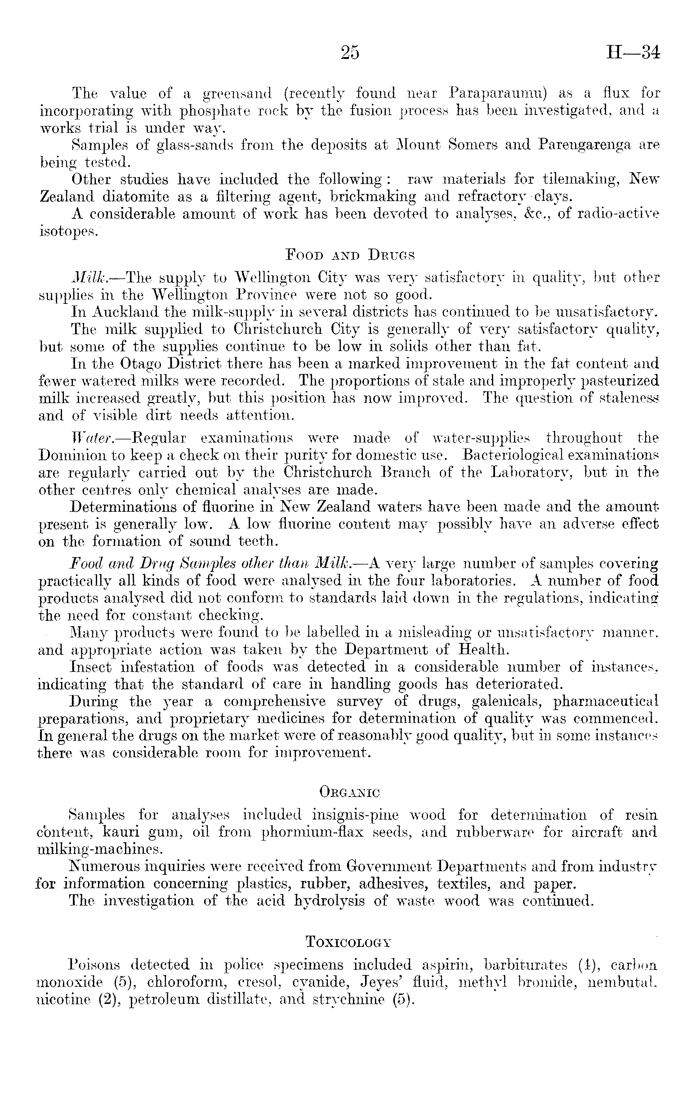 The value of a greensand (recently found near Paraparaumu) as a flux for incorporating with phosphate rock by the fusion process has been investigated, and a works trial is under way. Samples of glass-sands from the deposits at Mount Somers and Parengarenga are being tested. Other studies have included the following : raw materials for tilemaking, New Zealand diatomite as a filtering agent, brickmaking and refractory clays. A considerable amount of work has been devoted to analyses, &c., of radio-active isotopes. Food and Drugs Milk. —The supply to Wellington City was very satisfactory in quality, but other supplies in the Wellington Province were not so good. In Auckland the milk-supply in several districts has continued to be unsatisfactory. The milk supplied to Christchurch City is generally of very satisfactory quality, but some of the supplies continue to be low in solids other than fat. In the Otago District there has been a marked improvement in the fat content and fewer watered milks were recorded. The proportions of stale and improperly pasteurized milk increased greatly, but this position has now improved. The question of staleness and of visible dirt needs attention. Water. —Regular examinations were made of water-supplies throughout the Dominion to keep a check on their purity for domestic use. Bacteriological examinations are regularly carried out by the Christchurch Branch of the Laboratory, but in the other centres only chemical analyses are made. Determinations of fluorine in New Zealand waters have been made and the amount present is generally low. A low fluorine content may possibly have an adverse effect on the formation of sound teeth. Food and Drug Samples other than Milk.—A very large number of samples covering practically all kinds of food were analysed in the four laboratories. A number of food products analysed did not conform to standards laid down in the regulations, indicating the need for constant checking. Many products were found to be labelled in a misleading or unsatisfactory manner, and appropriate action was taken by the Department of Health. Insect infestation of foods was detected in a considerable number of instances, indicating that the standard of care in handling goods has deteriorated. During the year a comprehensive survey of drugs, galenicals, pharmaceutical preparations, and proprietary medicines for determination of quality was commenced. In general the drugs on the market were of reasonably good quality, but in some instances there was considerable room for improvement. Organic Samples for analyses included insignis-pine wood for determination of resin content, kauri gum, oil from phormium-flax seeds, and rubberware for aircraft and milking-machines. Numerous inquiries were received from Government Departments and from industry for information concerning plastics, rubber, adhesives, textiles, and paper. The investigation of the acid hydrolysis of waste wood was continued. Toxicology Poisons detected in police specimens included aspirin, barbiturates (4), carbon monoxide (5), chloroform, cresol, cyanide, Jeyes' fluid, methyl bromide, nembutal, nicotine (2), petroleum distillate, and strychnine (5).