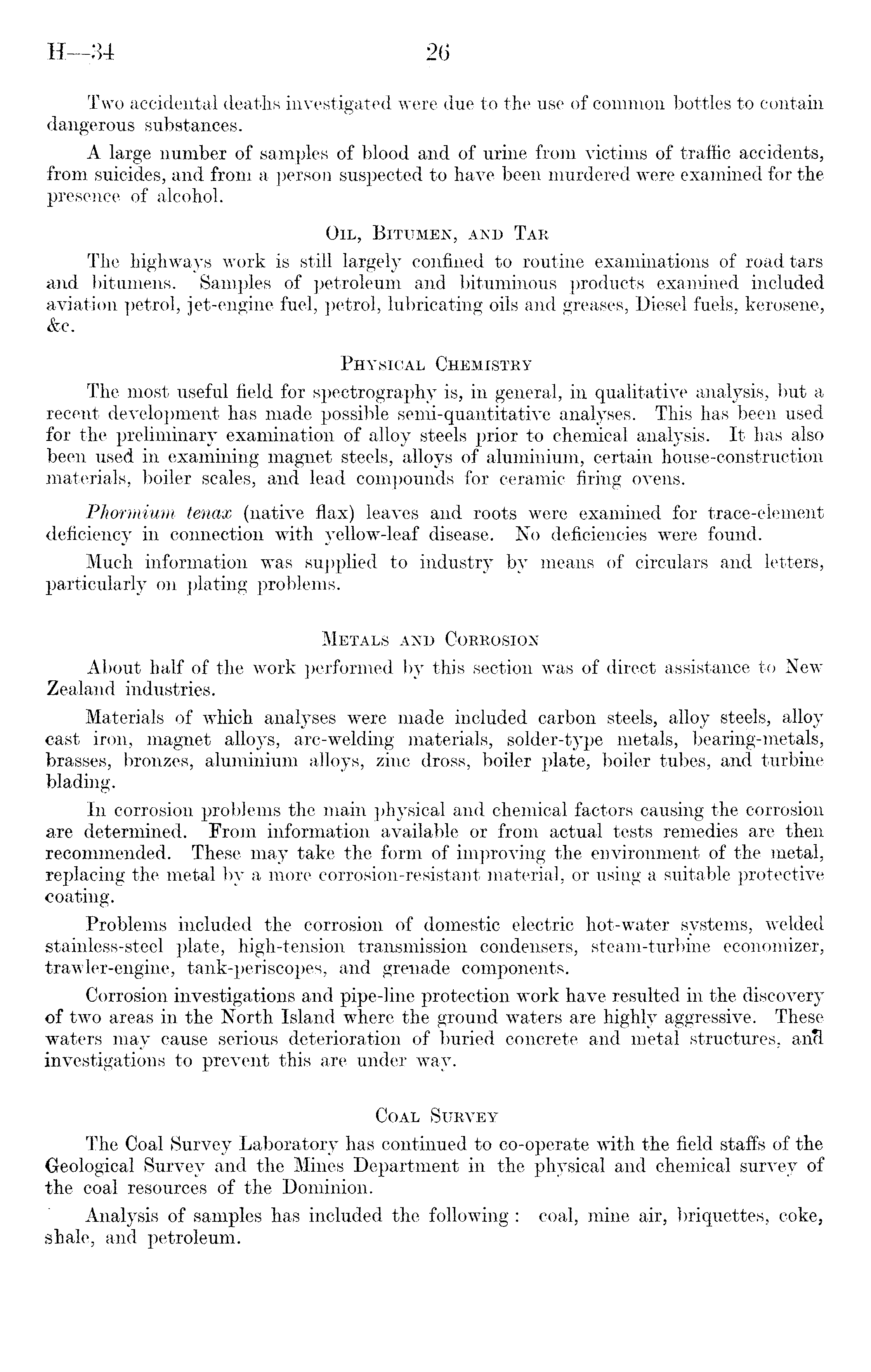 Two accidental deaths investigated were due to the use of common bottles to contain dangerous substances. A large number of samples of blood and of urine from victims of traffic accidents, from suicides, and from a person suspected to have been murdered were examined for the presence of alcohol. Oil, Bitumen, and Tar The highways work is still largely confined to routine examinations of road tars and bitumens. Samples of petroleum and bituminous products examined included aviation petrol, jet-engine fuel, petrol, lubricating oils and greases, Diesel fuels, kerosene, &c. Physical Chemistry The most useful field for spectrography is, in general, in qualitative analysis, but a recent development has made possible semi-quantitative analyses. This has been used for the preliminary examination of alloy steels prior to chemical analysis. It has also been used in examining magnet steels, alloys of aluminium, certain house-construction materials, boiler scales, and lead compounds for ceramic firing ovens. Phormium tenax (native flax) leaves and roots were examined for trace-element deficiency in connection with yellow-leaf disease. No deficiencies were found. Much information was supplied to industry by means of circulars and letters, particularly on plating problems. Metals and Corrosion About half of the work performed by this section was of direct assistance to New Zealand industries. Materials of which analyses were made included carbon steels, alloy steels, alloy cast iron, magnet alloys, arc-welding materials, solder-type metals, bearing-metals, brasses, bronzes, aluminium alloys, zinc dross, boiler plate, boiler tubes, and turbine blading. In corrosion problems the main physical and chemical factors causing the corrosion are determined. From information available or from actual tests remedies are then recommended. These may take the form of improving the environment of the metal, replacing the metal by a more corrosion-resistant material, or using a suitable protective coating. Problems included the corrosion of domestic electric hot-water systems, welded stainless-steel plate, high-tension transmission condensers, steam-turbine economizer, trawler-engine, tank-periscopes, and grenade components. Corrosion investigations and pipe-line protection work have resulted in the discovery of two areas in the North Island where the ground waters are highly aggressive. These waters may cause serious deterioration of buried concrete and metal structures, ancl investigations to prevent this are under way. Coal Survey The Coal Survey Laboratory has continued to co-operate with the field staffs of the Geological Survey and the Mines Department in the physical and chemical survey of the coal resources of the Dominion. Analysis of samples has included the following : coal, mine air, briquettes, coke, shale, and petroleum.