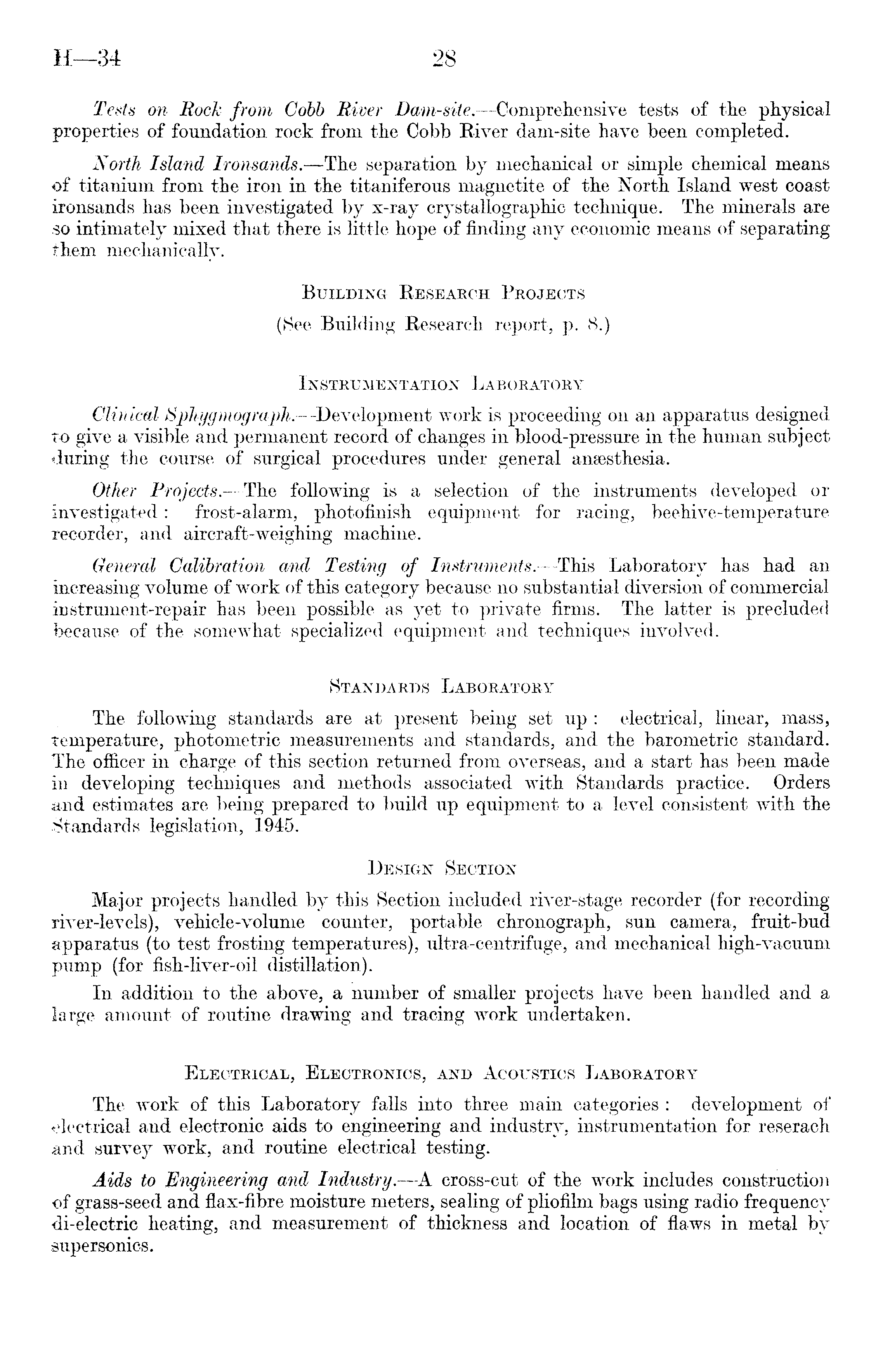 Tests on Rock from Cobb River Dam-site. —Comprehensive tests of the physical properties of foundation rock from the Cobb River dam-site have been completed. North Island Ironsands.—The separation by mechanical or simple chemical means of titanium from the iron in the titaniferous magnetite of the North Island west coast ironsands has been investigated by x-ray crystallographic technique. The minerals are so intimately mixed that there is little hope of finding any economic means of separating them mechanically. Building Research Projects (See Building Research report, p. 8.) Instrumentation Laboratory Clinical Sphygmograph.—Development work is proceeding on an apparatus designed to give a visible and permanent record of changes in blood-pressure in the human subject during the course of surgical procedures under general anaesthesia. Other Projects.—The following is a selection of the instruments developed or investigated: frost-alarm, photofinish equipment for racing, beehive-temperature recorder, and aircraft-weighing machine. General Calibration and Testing of Instruments. —This Laboratory has had an increasing volume of work of this category because no substantial diversion of commercial instrument-repair has been possible as yet to private firms. The latter is precluded because of the somewhat specialized equipment and techniques involved. Standards Laboratory The following standards are at present being set up : electrical, linear, mass, temperature, photometric measurements and standards, and the barometric standard. The officer in charge of this section returned from overseas, and a start has been made in developing techniques and methods associated with Standards practice. Orders and estimates are being prepared to build up equipment to a level consistent with the Standards legislation, 1945. Design Section Major projects handled by this Section included river-stage recorder (for recording river-levels), vehicle-volume counter, portable chronograph, sun camera, fruit-bud apparatus (to test frosting temperatures), ultra-centrifuge, and mechanical high-vacuum pump (for fish-liver-oil distillation). In addition to the above, a number of smaller projects have been handled and a large amount of routine drawing and tracing work undertaken. Electrical, Electronics, and Acoustics Laboratory The work of this Laboratory falls into three main categories : development of electrical and electronic aids to engineering and industry, instrumentation for reserach and survey work, and routine electrical testing. Aids to Engineering and Industry. —A cross-cut of the work includes construction of grass-seed and flax-fibre moisture meters, sealing of pliofilm bags using radio frequency di-electric heating, and measurement of thickness and location of flaws in metal by supersonics.