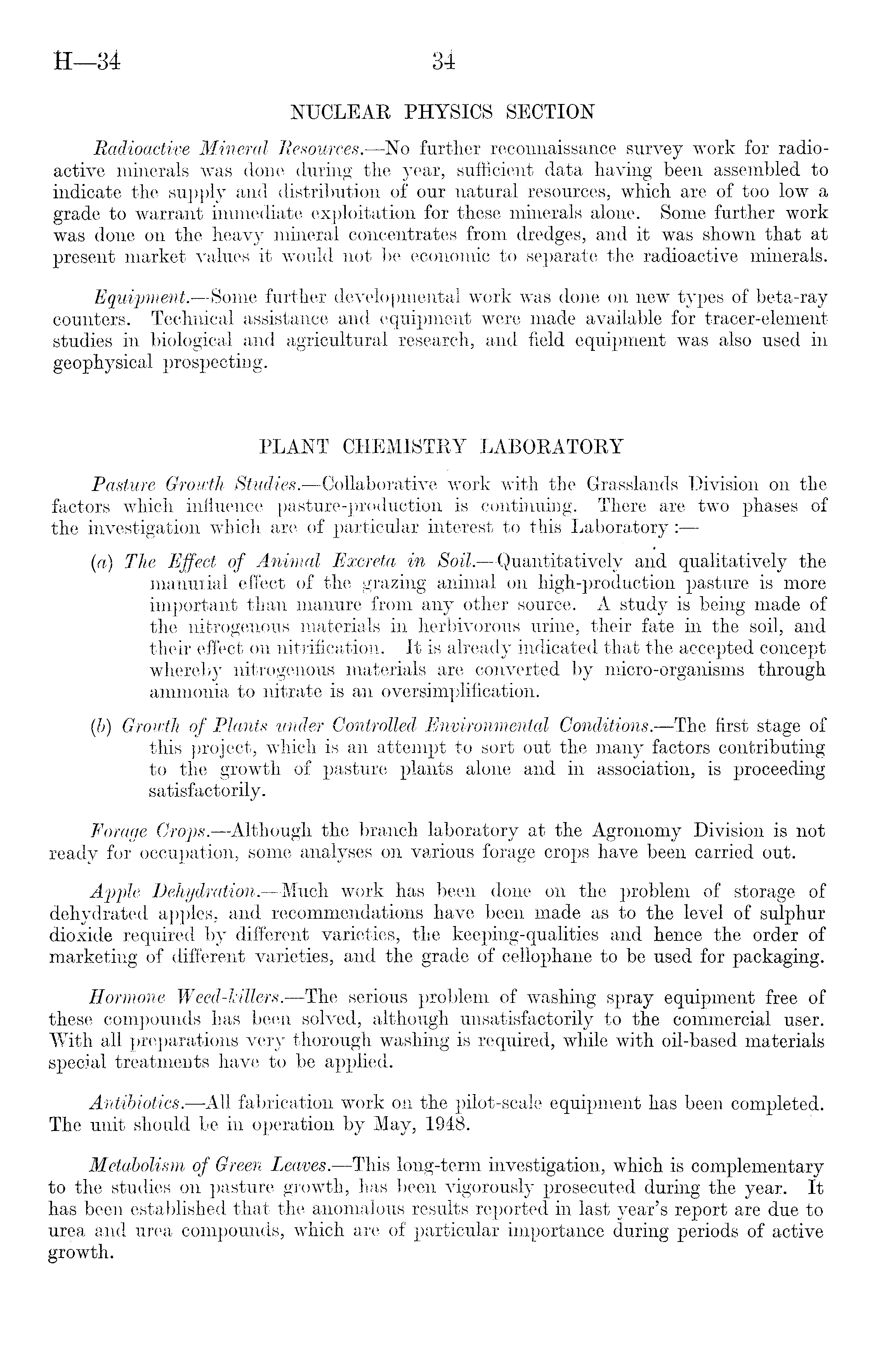 NUCLEAR PHYSICS SECTION Radioactive Mineral Resources. —No further reconnaissance survey work for radioactive minerals was done during the year, sufficient data having been assembled to indicate the supply and distribution of our natural resources, which are of too low a grade to warrant immediate exploitation for these minerals alone. Some further work was done on the heavy mineral concentrates from dredges, and it was shown that at present market values it would not be economic to separate the radioactive minerals. Equipment.—Some further developmental work was done on new types of beta-ray counters. Technical assistance and equipment were made available for tracer-element studies in biological and agricultural research, and field equipment was also used in geophysical prospecting. PLANT CHEMISTRY LABORATORY Pasture Growth Studies.—Collaborative work with the Grasslands Division on the factors which influence pasture-production is continuing. There are two phases of the investigation which are of particular interest to this Laboratory: — (a) The Effect of Animal Excreta in Soil. —Quantitatively and qualitatively the manurial effect of the grazing animal on high-production pasture is more important than manure from any other source. A study is being made of the nitrogenous materials in herbivorous urine, their fate in the soil, and their effect on nitrification. It is already indicated that the accepted concept whereby nitrogenous materials are converted by micro-organisms through ammonia to nitrate is an oversimplification. (b) Growth of Plants under Controlled Environmental Conditions. —The first stage of this project, which is an attempt to sort out the many factors contributing to the growth of pasture plants alone and in association, is proceeding satisfactorily. Forage Crops. —Although the branch laboratory at the Agronomy Division is not ready for occupation, some analyses on various forage crops have been carried out. Apple Dehydration. —Much work has been done on the problem of storage of dehydrated apples, and recommendations have been made as to the level of sulphur dioxide required by different varieties, the keeping-qualities and hence the order of marketing of different varieties, and the grade of cellophane to be used for packaging. Hormone Weed-lcillers. —The serious problem of washing spray equipment free of these compounds has been solved, although unsatisfactorily to the commercial user. With all preparations very thorough washing is required, while with oil-based materials special treatments have to be applied. Antibiotics.- —All fabrication work on the pilot-scale equipment has been completed. The unit should be in operation by May, 1948. Metabolism of Green Leaves.—This long-term investigation, which is complementary to the studies on pasture growth, has been vigorously prosecuted during the year. It has been established that the anomalous results reported in last year's report are due to urea and urea compounds, which are of particular importance during periods of active growth.