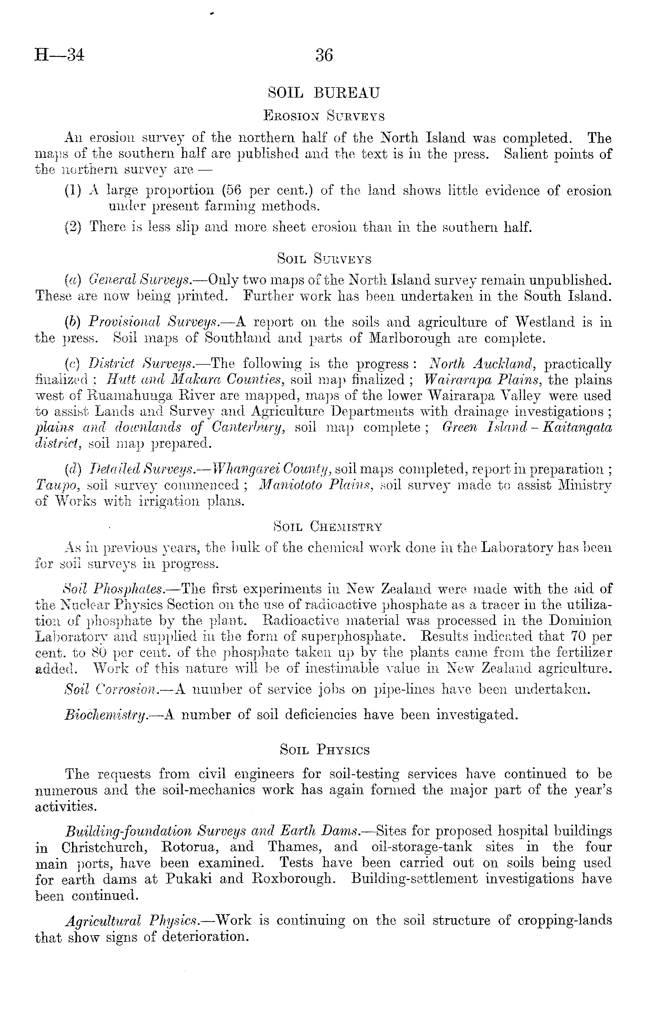 SOIL BUREAU Erosion Surveys An erosion survey of the northern half of the North Island was completed. The maps of the southern half are published and the text is in the press. Salient points of the northern survey are (1) A large proportion (56 per cent.) of the land shows little evidence of erosion under present farming methods. (2) There is less slip and more sheet erosion than in the southern half. Soil Surveys (a) General Surveys.—Only two maps of the North Island survey remain unpublished. These are now being printed. Further work has been undertaken in the South Island. (b) Provisional Surveys.—A report on the soils and agriculture of Westland is in the press. Soil maps of Southland and parts of Marlborough are complete. (c) District Surveys.—The following is the progress : North Auckland, practically finalized ; Hutt and Makara Counties, soil map finalized ; Wairarapa Plains, the plains west of Ruamahunga River are mapped, maps of the lower Wairarapa Valley were used to assist Lands and Survey and Agriculture Departments with drainage investigations ; plains and downlands of Canterbury, soil map complete ; Green Island - Kaitangata district, soil map prepared. (d) Detailed Surveys.—Whangarei County, soil maps completed, report in preparation ; Taupo,, soil survey commenced; Maniototo Plains, soil survey made to assist Ministry of Works with irrigation plans. Soil Chemistry As in previous years, the bulk of the chemical work done in the Laboratory has been for soil surveys in progress. Soil Phosphates. —The first experiments in New Zealand were made with the aid of the Nuclear Physics Section on the use of radioactive phosphate as a tracer in the utilization of phosphate by the plant. Radioactive material was processed in the Dominion Laboratory and supplied in the form of superphosphate. Results indicated that 70 per cent, to 80 per cent, of the phosphate taken up by the plants came from the fertilizer added. Work of this nature will be of inestimable value in New Zealand agriculture. Soil Corrosion. —A number of service jobs on pipe-lines have been undertaken. Biochemistry .-—A- number of soil deficiencies have been investigated. Soil Physics The requests from civil engineers for soil-testing services have continued to be numerous and the soil-mechanics work has again formed the major part of the year's activities. Building-foundation Surveys and Earth Dams. —Sites for proposed hospital buildings in Christchurch, Rotorua, and Thames, and oil-storage-tank sites in the four rnain ports, have been examined. Tests have been carried out on soils being used for earth dams at Pukaki and Roxborough. Building-settlement investigations have been continued. Agricultural Physics.—Work is continuing on the soil structure of cropping-lands that show signs of deterioration.