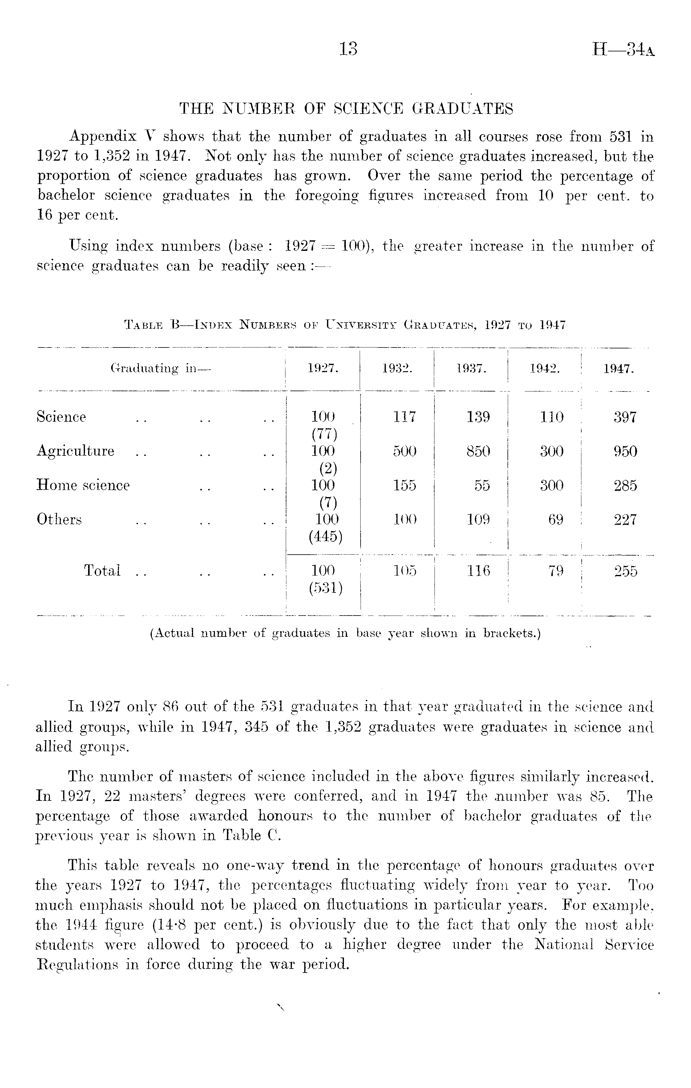 THE NUMBER OF SCIENCE GRADUATES Appendix V shows that the number of graduates in all courses rose from 531 in 1927 to 1,352 in 1947. Not only has the number of science graduates increased, but the proportion of science graduates has grown. Over the same period the percentage of bachelor science graduates in the foregoing figures increased from 10 per cent, to 16 per cent. Using index numbers (base : 1927 = 100), the greater increase in the number of science graduates can be readily seen :