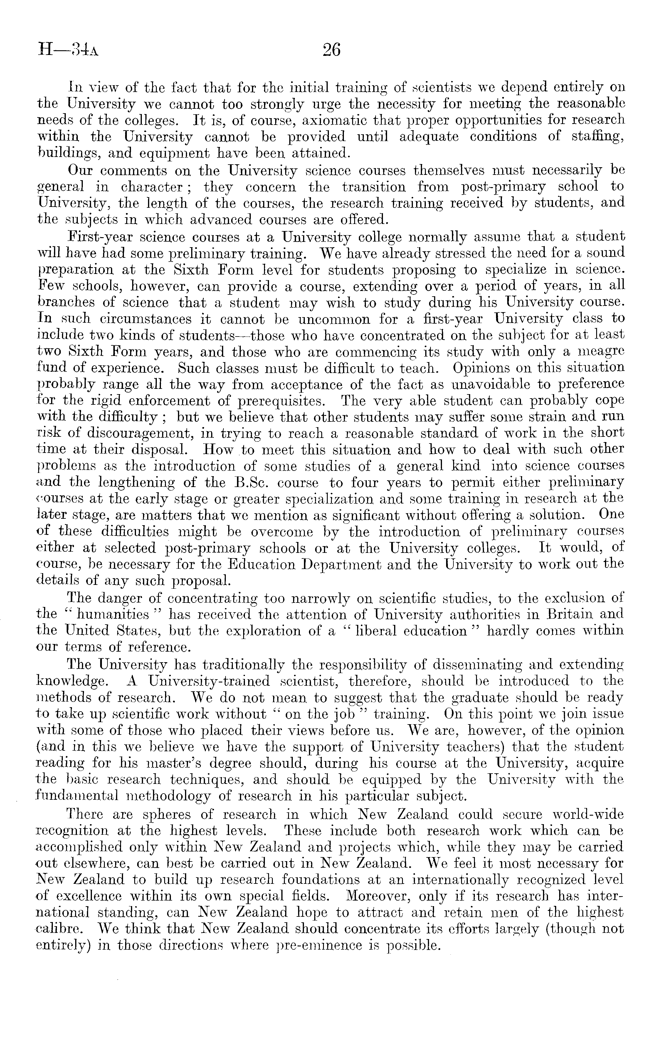 In view of the fact that for the initial training of scientists we depend entirely on the University we cannot too strongly urge the necessity for meeting the reasonable needs of the colleges. It is, of course, axiomatic that proper opportunities for research within the University cannot be provided until adequate conditions of staffing, buildings, and equipment have been attained. Our comments on the University science courses themselves must necessarily be general in character; they concern the transition from post-primary school to University, the length of the courses, the research training received by students, and the subjects in which advanced courses are offered. First-year science courses at a University college normally assume that a student will have had some preliminary training. We have already stressed the need for a sound preparation at the Sixth Form level for students proposing to specialize in science. Few schools, however, can provide a course, extending over a period of years, in all branches of science that a student may wish to study during his University course. In such circumstances it cannot be uncommon for a first-year University class to include two kinds of students —those who have concentrated on the subject for at least two Sixth Form years, and those who are commencing its study with only a meagre fund of experience. Such classes must be difficult to teach. Opinions on this situation probably range all the way from acceptance of the fact as unavoidable to preference for the rigid enforcement of prerequisites. The very able student can probably cope with the difficulty; but we believe that other students may suffer some strain and run risk of discouragement, in trying to reach a reasonable standard of work in the short time at their disposal. How to meet this situation and how to deal with such other problems as the introduction of some studies of a general kind into science courses and the lengthening of the B.Sc. course to four years to permit either preliminary courses at the early stage or greater specialization and some training in research at the later stage, are matters that we mention as significant without offering a solution. One of these difficulties might be overcome by the introduction of preliminary courses either at selected post-primary schools or at the University colleges. It would, of course, be necessary for the Education Department and the University to work out the details of any such proposal. The danger of concentrating too narrowly on scientific studies, to the exclusion of the " humanities " has received the attention of University authorities in Britain and the United States, but the exploration of a " liberal education " hardly comes within our terms of reference. The University has traditionally the responsibility of disseminating, and extending knowledge. A University-trained scientist, therefore, should be introduced -to the methods of research. We do not mean to suggest that the graduate should be ready to take up scientific work without "on the job " training. On this point we join issue with some of those who placed their views before us. We are, however, of the opinion (and in this we believe we have the support of University teachers) that the student reading for his master's degree should, during his course at the University, acquire the basic research techniques, and should be equipped by the University with the fundamental methodology of research in his particular subject. 'There are spheres of research in which New Zealand could secure world-wide recognition at the highest levels. These include both research work which can be accomplished only within New Zealand and projects which, while they may be carried out elsewhere, can best be carried out in New Zealand. We feel it most necessary for New Zealand to build up research foundations at an internationally recognized level of excellence within its own special fields. Moreover, only if its research has international standing, can New Zealand hope to attract and retain men of the highest calibre. We think that New Zealand should concentrate its efforts largely (though not entirely) in those directions where pre-eminence is possible.