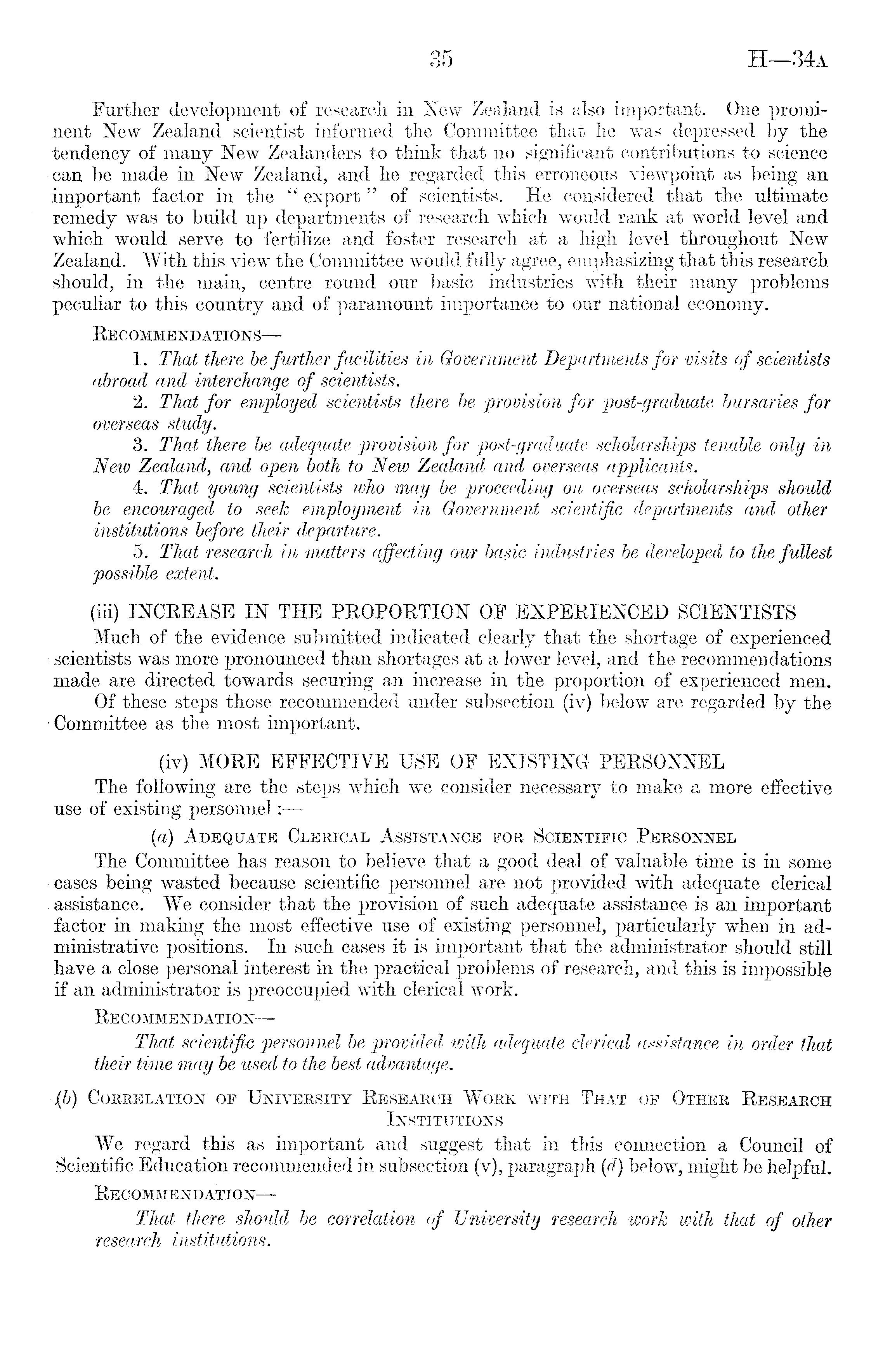 Further development of research in New Zealand is also important. One prominent New Zealand scientist informed the Committee that he was depressed by the tendency of many New Zealanders to think that no significant contributions to science can be made in New Zealand, and he regarded this erroneous viewpoint as being an important factor in the " export" of scientists. He considered that the ultimate remedy was to build up departments of research which would rank at world level and which would serve to fertilize and foster research at a high level throughout New Zealand. With this view the Committee would fully agree, emphasizing that this research should, in the main, centre round our basic industries with their many problems peculiar to this country and of paramount importance to our national economy. Recommendations—1. That there be further facilities in Government Departments for visits of scientists abroad and interchange of scientists. 2. That for employed scientists there be provision for post-graduate bursaries for overseas study. 3. That there be adequate provision for post-graduate scholarships tenable only in New Zealand, and open both to New Zealand and overseas applicants. 4. That young scientists who may be proceeding on overseas scholarships should be encouraged to seek employment in Government scientific departments and other institutions before their departure. 5. That research in matters affecting our basic industries be developed to the fullest possible extent. (iii) INCREASE IN THE PROPORTION OF EXPERIENCED SCIENTISTS Much of the evidence submitted indicated clearly that the shortage of experienced ; scientists was more pronounced than shortages at a lower level, and the recommendations made are directed towards securing an increase in the proportion of experienced men. Of these steps those recommended under subsection (iv) below are regarded by the •Committee as the most important. (iv) MORE EFFECTIVE USE OF EXISTING PERSONNEL The following are the steps which we consider necessary to make a more effective use of existing personnel: — (a) Adequate Clerical Assistance for Scientific Personnel The Committee has reason to believe that a good deal of valuable time is in some cases being wasted because scientific personnel are not provided with adequate clerical assistance. We consider that the provision of such adequate assistance is an important factor in making the most effective use of existing personnel, particularly when in administrative positions. In such cases it is important that the administrator should still have a close personal interest in the practical problems of research, and this is impossible if an administrator is preoccupied with clerical work. Recommendation— That scientific personnel be provided with adequate clerical assistance in order that their time may be used to the best advantage. ■(b) Correlation of University Research Work with That of Other Research Institutions We regard this as important and suggest that in this connection a Council of Scientific Education recommended in subsection (v), paragraph (d) below, might be helpful. Recommendation — That there should be correlation of University research work with that of other research institutions.