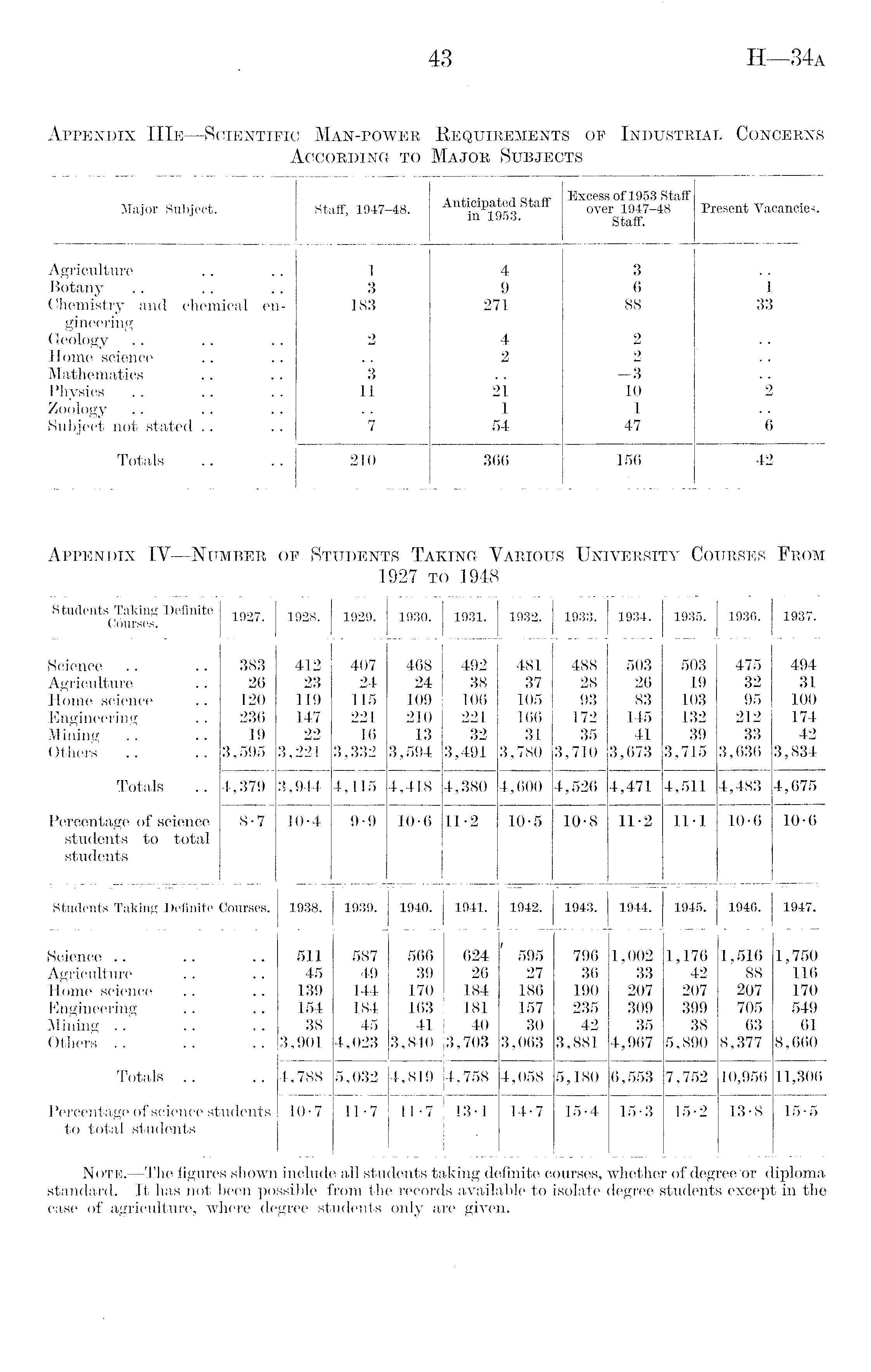 Students Taking Definite Courses. 1927. 1928. 1929. 1930. 1931. 1932. 1933. 1934. 1935. 1936. 1937. Science Agriculture Home science Engineering Mining Others 383 26 120 236 19 3,595 412 23 119 147 22 3,221 407 24 115 221 16 3,332 468 24 109 210 13 3,594 492 38 106 221 32 3,491 481 37 105 166 31 3,780 488 28 93 172 35 3,710 503 26 83 145 41 3,673 503 19 103 132 39 3,715 475 32 95 212 33 3,636 494 31 100 174 42 3,834 Totals 4,379 3,944 4,115 4,418 4,380 . 4,600 4,526 4,471 4,511 4,483 4,675 Percentage of science students to total students 8-7 10-4 9-9 10-6 11-2 10-5 10-8 11-2 11-1 10-6 10-6 Students Taking Definite Courses. 1938. 1939. 1940. 1941. 1942. 1943. 1944. 1945. 1946. 1947. Science Agriculture Home science Engineering Mining Others 511 45 139 154 38 3,901 587 49 144 184 45 4,023 566 39 170 163 41 3,840 624 26 184 181 40 3,703 595 27 186 157 30 3,063 796 36 190 235 42 3,881 1,002 33 207 309 35 4,967 1,176 42 207 399 38 5,890 1,516 88 207 705 63 8,377 1,750 116 170 549 61 8,660 Totals .. 4,788 5,032 4,819 4,758 4,058 5,180 6,553 7,752 10,956 11,306 Percentage of science students to total students 10-7 11-7 11-7 131 14-7 15-4 15-3 15-2 13-8 15-5