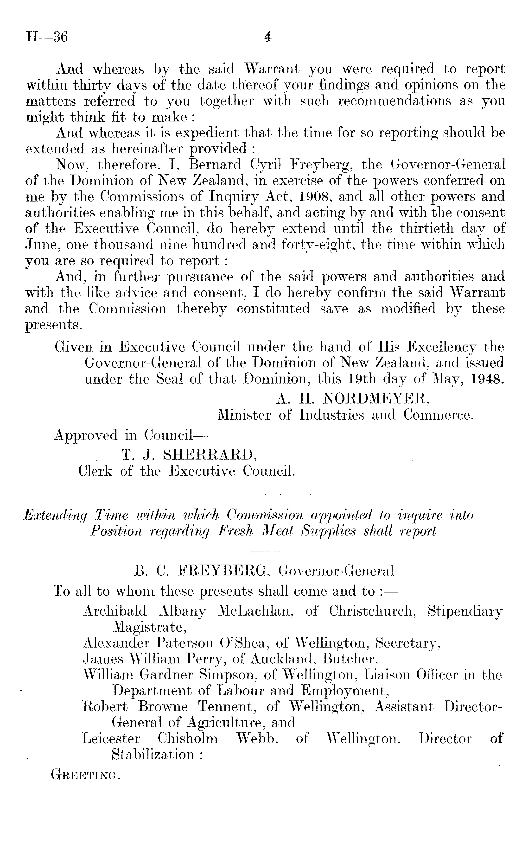 And whereas by the said Warrant you were required to report within thirty days of the date thereof your findings and opinions on the matters referred to you together with such recommendations as you might think fit to make : And whereas it is expedient that the time for so reporting should be extended as hereinafter provided : Now, therefore, I, Bernard Cyril Freyberg, the Governor-General of the Dominion of New Zealand, in exercise of the powers conferred on me by the Commissions of Inquiry Act, 1908, and all other powers and authorities enabling me in this behalf, and acting by and with the consent of the Executive Council, do hereby extend until the thirtieth day of June, one thousand nine hundred and forty-eight, the time within which you are so required to report: And, in further pursuance of the said powers and authorities and with the like advice and consent, I do hereby confirm the said Warrant and the Commission thereby constituted save as modified by these presents. Given in Executive Council under the hand of His Excellency the Governor-General of the Dominion of New Zealand, and issued under the Seal of that Dominion, this 19th day of May, 1948. A. H. NORDMEYER, Minister of Industries and Commerce. Approved in Council — T. J. SHERRARD, Clerk of the Executive Council.