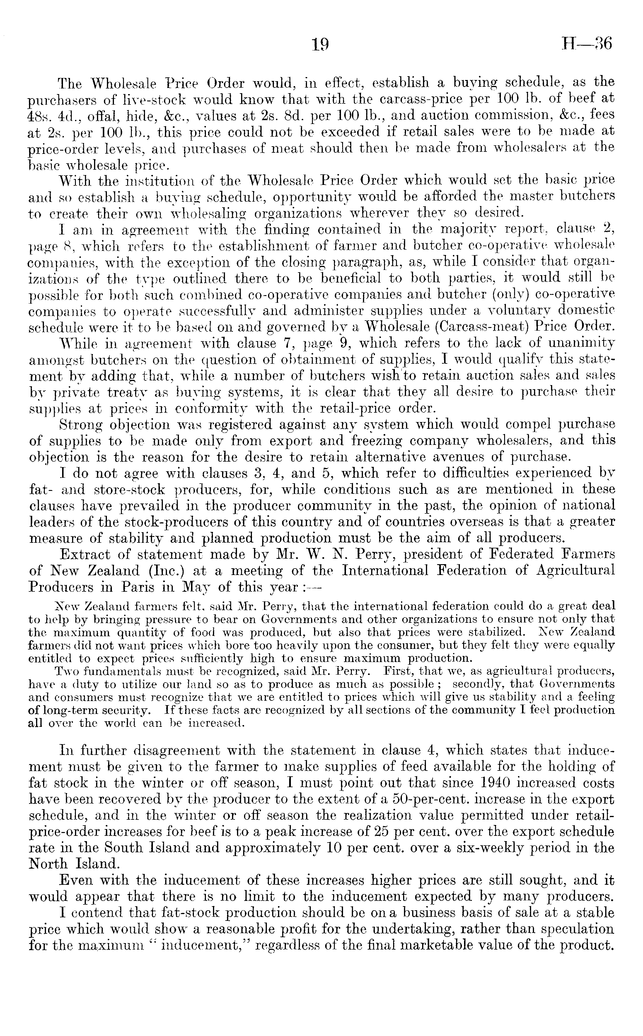The Wholesale Price Order would, in effect, establish a buying schedule, as the purchasers of live-stock would know that with the carcass-price per 100 lb. of beef at 48s. 4d., offal, hide, &c., values at 2s. Bd. per 100 lb., and auction commission, &c., fees at 2s. per 100 lb., this price could not be exceeded if retail sales were to be made at price-order levels, and purchases of meat should then be made from wholesalers at the basic wholesale price. With the institution of the Wholesale Price Order which would set the basic price and so establish a buying schedule, opportunity would be afforded the master butchers to create their own wholesaling organizations wherever they so desired. I am in agreement with the finding contained in the majority report, clause 2, page 8, which refers to the establishment of farmer and butcher co-operative wholesale companies, with the exception of the closing paragraph, as, while I consider that organizations of the type outlined there to be beneficial to both parties, it would still be possible for both such combined co-operative companies and butcher (only) co-operative companies to operate successfully and administer supplies under a voluntary domestic schedule were it to be based on and governed by a Wholesale (Carcass-meat) Price Order. While in agreement with clause 7, page 9, which refers to the lack of unanimity amongst butchers on the question of obtainment of supplies, I would qualify this statement by adding that, while a number of butchers wish to retain auction sales and sales by private treaty as buying systems, it is clear that they all desire to purchase their supplies at prices in conformity with the retail-price order. Strong objection was registered against any system which would compel purchase of supplies to be made only from export and freezing company wholesalers, and this objection is the reason for the desire to retain alternative avenues of purchase. I do not agree with clauses 3, 4, and 5, which refer to difficulties experienced by fat- and store-stock producers, for, while conditions such as are mentioned in these clauses have prevailed in the producer community in the past, the opinion of national leaders of the stock-producers of this country and of countries overseas is that a greater measure of stability and planned production must be the aim of all producers. Extract of statement made by Mr. W. N. Perry, president of Federated Farmers of New Zealand (Inc.) at a meeting of the International Federation of Agricultural Producers in Paris in May of this year : New Zealand farmers felt, said Mr. Perry, that the international federation could do a great deal to help by bringing pressure to bear on Governments and other organizations to ensure not only that the maximum quantity of food was produced, but also that prices were stabilized. New Zealand farmers did not want prices which bore too heavily upon the consumer, but they felt they were equally entitled to expect prices sufficiently high to ensure maximum production. Two fundamentals must be recognized, said Mr. Perry. First, that we, as agricultural producers, have a duty to utilize our land so as to produce as much as possible; secondly, that Governments and consumers must recognize that we are entitled to prices which will give us stability and a feeling of long-term security. If these facts are recognized by all sections of the community I feel production all over the world can be increased. In further disagreement with the statement in clause 4, which states that inducement must be given to the farmer to make supplies of feed available for the holding of fat stock in the winter or off season, I must point out that since 1940 increased costs have been recovered by the producer to the extent of a 50-per-cent. increase in the export schedule, and in the winter or off season the realization value permitted under retail-price-order increases for beef is to a peak increase of 25 per cent, over the export schedule rate in the South Island and approximately 10 per cent, over a six-weekly period in the North Island. Even with the inducement of these increases higher prices are still sought, and it would appear that there is no limit to the inducement expected by many producers. I contend that fat-stock production should be on a business basis of sale at a stable price which would show a reasonable profit for the undertaking, rather than speculation for the maximum " inducement," regardless of the final marketable value of the product.
