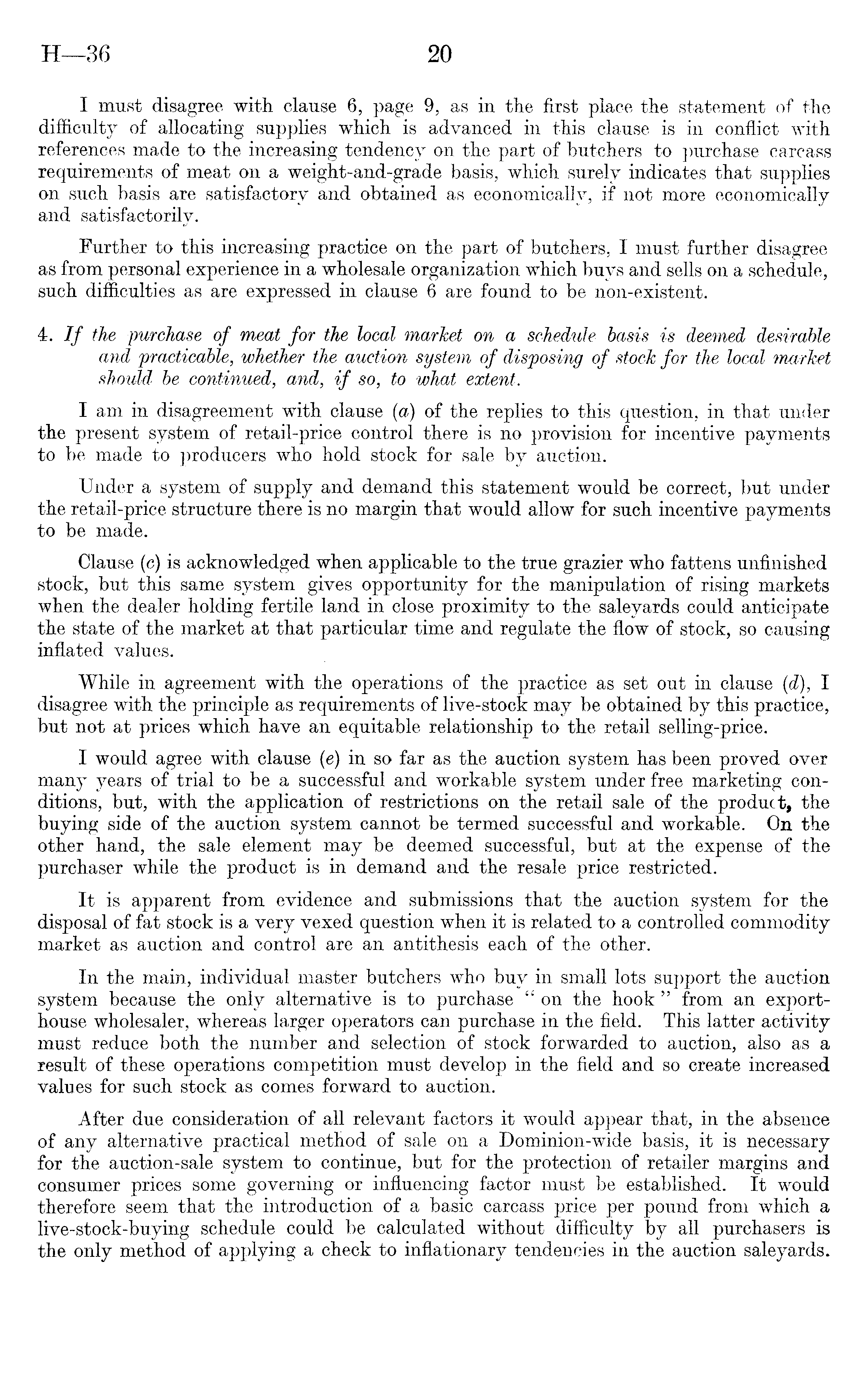 I must disagree with, clause 6, page 9, as in the first place the statement of the difficulty of allocating supplies which is advanced in this clause is in conflict with references made to the increasing tendency on the part of butchers to purchase carcass requirements of meat on a weight-and-grade basis, which surely indicates that supplies on such basis are satisfactory and obtained as economically, if not more economically and satisfactorily. Further to this increasing practice on the part of butchers, I must further disagree as from personal experience in a wholesale organization which buys and sells on a schedule, such difficulties as are expressed in clause 6 are found to be non-existent. 4. If the purchase of meat for the local market on a schedule basis is deemed desirable and practicable, whether the auction system of disposing of stock for the local market should be continued, and, if so, to what extent. I am in disagreement with clause (a) of the replies to this question, in that under the present system of retail-price control there is no provision for incentive payments to be made to producers who hold stock for sale by auction. Under a system of supply and demand this statement would be correct, but under the retail-price structure there is no margin that would allow for such incentive payments to be made. Clause (c) is acknowledged when applicable to the true grazier who fattens unfinished stock, but this same system gives opportunity for the manipulation of rising markets when the dealer holding fertile land in close proximity to the saleyards could anticipate the state of the market at that particular time and regulate the flow of stock, so causing inflated values. While in agreement with the operations of the practice as set out in clause (d), I disagree with the principle as requirements of live-stock may be obtained by this practice, but not at prices which have an equitable relationship to the retail selling-price. I would agree with clause (e) in so far as the auction system has been proved over many years of trial to be a successful and workable system under free marketing conditions, but, with the application of restrictions on the retail sale of the product, the buying side of the auction system cannot be termed successful and workable. On the other hand, the sale element may be deemed successful, but at the expense of the purchaser while the product is in demand and the resale price restricted. It is apparent from evidence and submissions that the auction system for the disposal of fat stock is a very vexed question when it is related to a controlled commodity market as auction and control are an antithesis each of the other. In the main, individual master butchers who buy in small lots support the auction system because the only alternative is to purchase " on the hook " from an exporthouse wholesaler, whereas larger operators can purchase in the field. This latter activity must reduce both the number and selection of stock forwarded to auction, also as a result of these operations competition must develop in the field and so create increased values for such stock as comes forward to auction. After due consideration of all relevant factors it would appear that, in the absence of any alternative practical method of sale on a Dominion-wide basis, it is necessary for the auction-sale system to continue, but for the protection of retailer margins and consumer prices some governing or influencing factor must be established. It would therefore seem that the introduction of a basic carcass price per pound from which a live-stock-buying schedule could be calculated without difficulty by all purchasers is the only method of applying a check to inflationary tendencies in the auction saleyards.