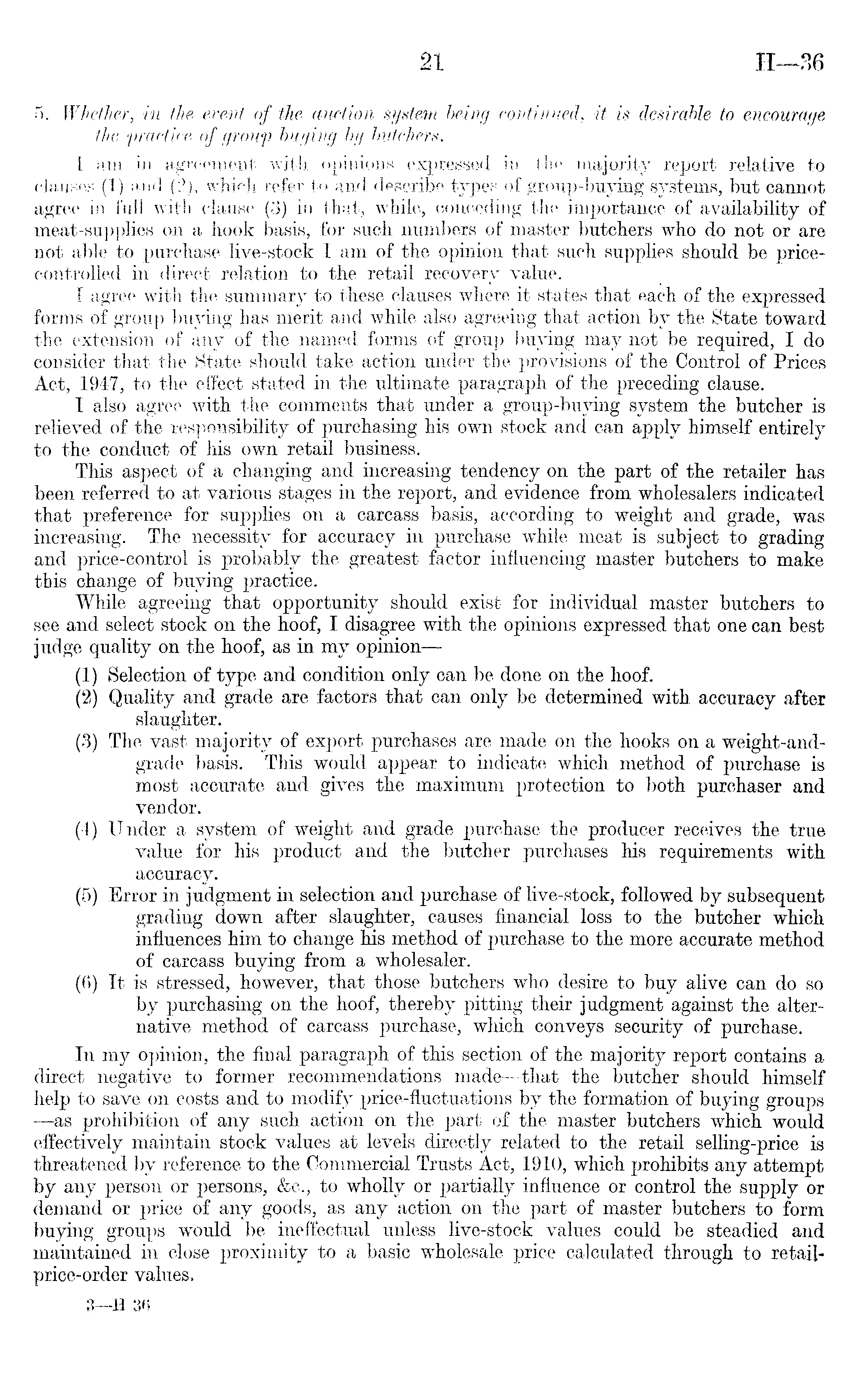 5. Whether, in the event of the auction system being continued, it is desirable to encourage the 'practice of group buying by butchers. I am in agreement with, opinions expressed in the majority report relative to clauses (1) and (2), which refer to and describe types of group-buying systems, but cannot agree in full with clause (3) in that, while, conceding the importance of availability of meat-supplies on a hook basis, for such numbers of master butchers who do not or are not able to purchase live-stock I am of the opinion that such supplies should be pricecontrolled in direct relation to the retail recovery value. I agree with the summary to these clauses where it states that each of the expressed forms of group buying has merit and while also agreeing that action by the State toward the extension of any of the named forms of group buying may not be required, I do consider that the State should take action under the provisions of the Control of Prices Act, 1947, to the effect stated in the ultimate paragraph of the preceding clause. I also agree with the comments that under a group-buying system the butcher is relieved of the responsibility of purchasing his own stock and can apply himself entirely to the conduct of his own retail business. This aspect of a changing and increasing tendency on the part of the retailer has been referred to at various stages in the report, and evidence from wholesalers indicated that preference for supplies on a carcass basis, according to weight and grade, was increasing. The necessity for accuracy in purchase while meat is subject to grading and price-control is probably the greatest factor influencing master butchers to make this change of buying practice. While agreeing that opportunity should exist for individual master butchers to see and select stock on the hoof, I disagree with the opinions expressed that one can best judge quality on the hoof, as in my opinion—(l) Selection of type and condition only can be done on the hoof. (2) Quality and grade are factors that can only be determined with accuracy after slaughter. (3) The vast majority of export purchases are made on the hooks on a weight-and-grade basis. This would appear to indicate which method of purchase is most accurate and gives the maximum protection to both purchaser and vendor. (4) Under a system of weight and grade purchase the producer receives the true value for his product and the butcher purchases his requirements with accuracy. (5) Error in judgment in selection and purchase of live-stock, followed by subsequent grading down after slaughter, causes financial loss to the butcher which influences him to change his method of purchase to the more accurate method of carcass buying from a wholesaler. (6) It is stressed, however, that those butchers who desire to buy alive can do so by purchasing on the hoof, thereby pitting their judgment against the alternative method of carcass purchase, which conveys security of purchase. In my opinion, the final paragraph of this section of the majority report contains a direct negative to former recommendations made—that the butcher should himself help to save on costs and to modify price-fluctuations by the formation of buying groups —as prohibition of any such action on the part of the master butchers which would effectively maintain stock values at levels directly related to the retail selling-price is threatened by reference to the Commercial Trusts Act, 1910, which prohibits any attempt by any person or persons, &c., to wholly or partially influence or control the supply or demand or price of any goods, as any action on the part of master butchers to form buying groups would be ineffectual unless live-stock values could be steadied and maintained in close proximity to a basic wholesale price calculated through to retail-price-order values.