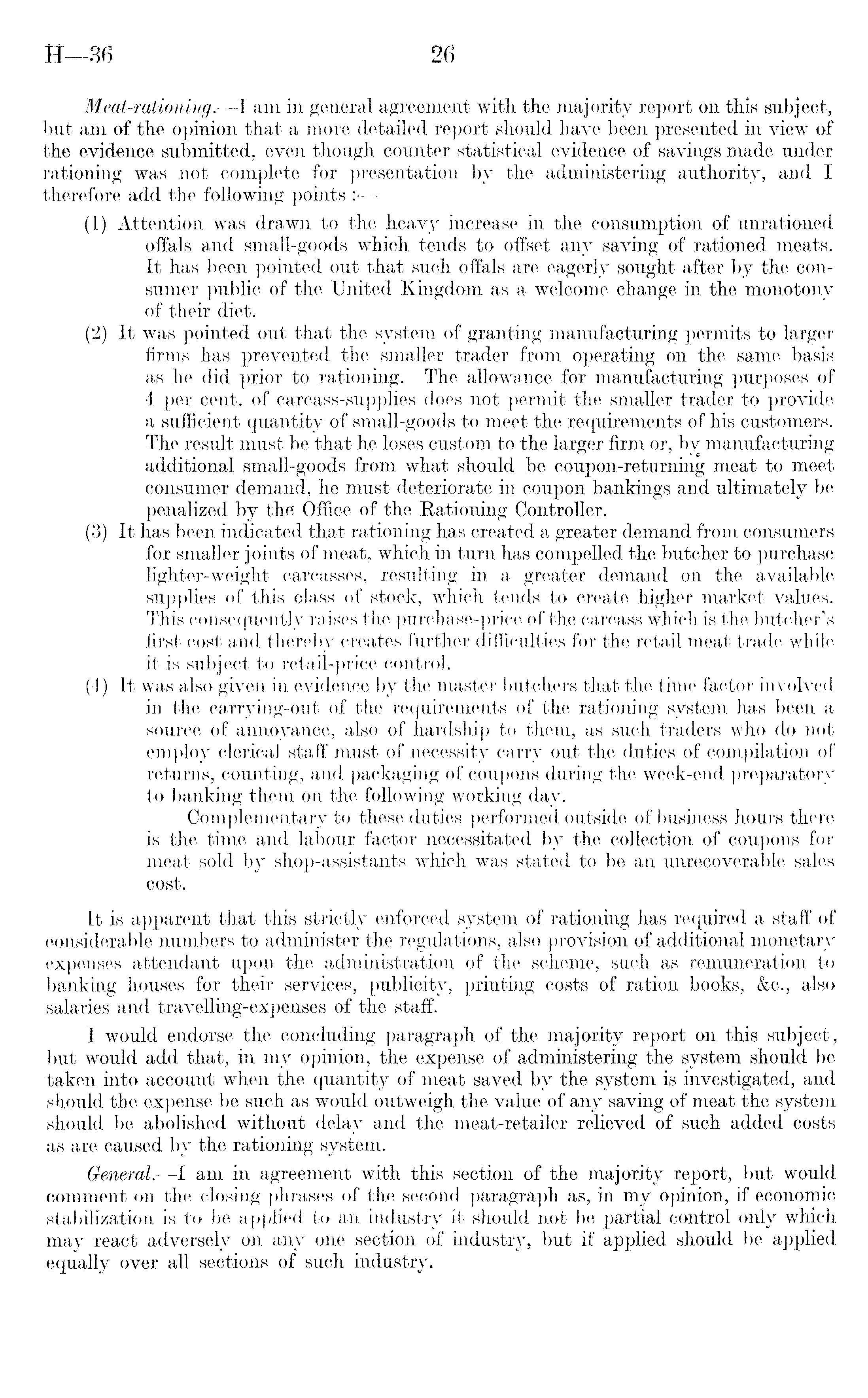 Meat-rationing. —I am in general agreement with the majority report on this subject, but am of the opinion that a more detailed report should have been presented in view of the evidence submitted, even though counter statistical evidence of savings made under rationing was not complete for presentation by the administering authority, and I therefore add the following points (1) Attention was drawn to the heavy increase in the consumption of unrationed offals and small-goods which tends to offset any saving of rationed meats. It has been pointed out that such offals are eagerly sought after by the consumer public of the United Kingdom as a welcome change in the monotony of their diet. (2) It was pointed out that the system of granting manufacturing permits to larger firms has prevented the smaller trader from operating on the same basis as he did prior to rationing. The allowance for manufacturing purposes of 4 per cent, of carcass-supplies does not permit the smaller trader to provide a sufficient quantity of small-goods to meet the requirements of his customers. The result must be that he loses custom to the larger firm or, by manufacturing additional small-goods from what should be coupon-returning meat to meet consumer demand, he must deteriorate in coupon bankings and ultimately be penalized by the Office of the Rationing Controller. (3) It has been indicated that rationing has created a greater demand from consumers for smaller joints of meat, which in turn has compelled the butcher to purchase lighter-weight carcasses, resulting in a greater demand on the available supplies of this class of stock, which tends to create higher market values. This consequently raises the purchase-price of the carcass which is the butcher's first cost and thereby creates further difficulties for the retail meat trade while it is subject to retail-price control. (1) It was also given in evidence by the master butchers that the time factor involved in the carrying-out of the requirements of the rationing system has been a source of annoyance, also of hardship to them, as such traders who do not employ clerical staff must of necessity carry out the duties of compilation of returns, counting, and packaging of coupons during the week-end preparatory to banking them on the following working day. Complementary to these duties performed outside of business hours there is the time and labour factor necessitated by the collection of coupons for meat sold by shop-assistants which was stated to be an unrecoverable sales cost. It is apparent that this strictly enforced system of rationing has required a staff of considerable numbers to administer the regulations, also provision of additional monetary expenses attendant upon the administration of the scheme, such as remuneration to banking houses for their services, publicity, printing costs of ration books, &c., also salaries and travelling-expenses of the staff. I would endorse the concluding paragraph of the majority report on this subject, but would add that, in my opinion, the expense of administering the system should be taken into account when the quantity of meat saved by the system is investigated, and should the expense be such as would outweigh the value of any saving of meat the system should be abolished without delay and the meat-retailer relieved of such added costs as are caused by the rationing system. General. —I am in agreement with this section of the majority report, but would comment on the closing phrases of the second paragraph as, in my opinion, if economic stabilization is to be applied to an industry it should not be partial control only which may react adversely on any one section of industry, but if applied should be applied equally over all sections of such industry.