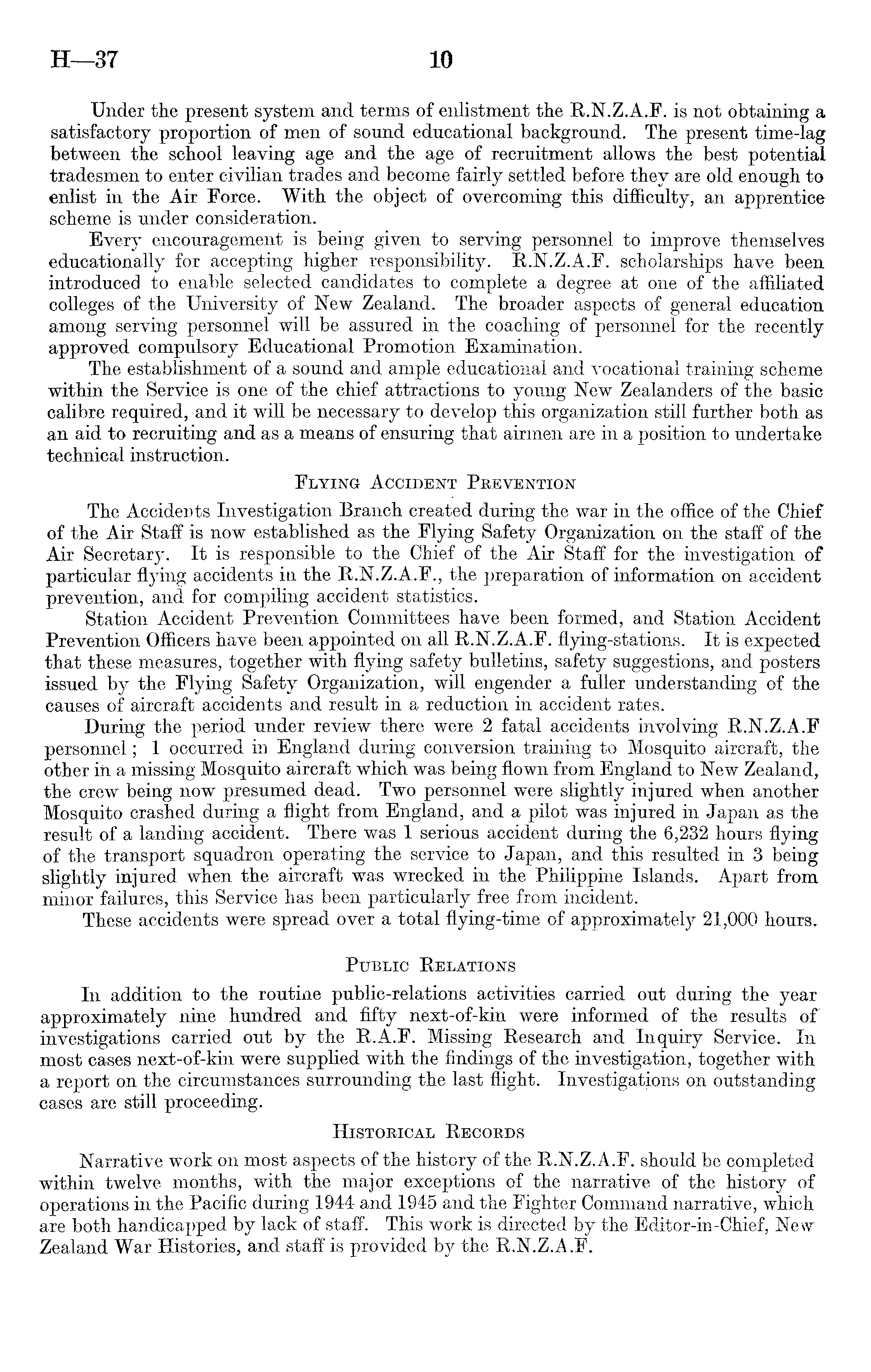 Under the present system and terms of enlistment the E.N.Z.A.F. is not obtaining a satisfactory proportion of men of sound educational background. The present time-lag between the school leaving age and the age of recruitment allows the best potential tradesmen to enter civilian trades and become fairly settled before they are old enough to enlist in the Air Force. With the object of overcoming this difficulty, an apprentice scheme is under consideration. Every encouragement is being given to serving personnel to improve themselves educationally for accepting higher responsibility. R.N.Z.A.F. scholarships have been introduced to enable selected candidates to complete a degree at one of the affiliated colleges of the University of New Zealand. The broader aspects of general education among serving personnel will be assured in the coaching of personnel for the recently approved compulsory Educational Promotion Examination. The establishment of a sound and ample educational and vocational training scheme within the Service is one of the chief attractions to young New Zealanders of the basic calibre required, and it will be necessary to develop this organization still further both as an aid to recruiting and as a means of ensuring that airmen are in a position to undertake technical instruction. Flying Accident Prevention The Accidents Investigation Branch created during the war in the office of the Chief of the Air Staff is now established as the Flying Safety Organization on the staff of the Air Secretary. It is responsible to the Chief of the Air Staff for the investigation of particular flying accidents in the R.N.Z.A.F., the preparation of information on accident prevention, and for compiling accident statistics. Station Accident Prevention Committees have been formed, and Station Accident Prevention Officers have been appointed on all R.N.Z.A.F. flying-stations. It is expected that these measures, together with flying safety bulletins, safety suggestions, and posters issued by the Flying Safety Organization, will engender a fuller understanding of the causes of aircraft accidents and result in a reduction in accident rates. During the period under review there were 2 fatal accidents involving R.N.Z.A.F personnel; 1 occurred in England during conversion training to Mosquito aircraft, the other in a missing Mosquito aircraft which was being flown from England to New Zealand, the crew being now presumed dead. Two personnel were slightly injured when another Mosquito crashed during a flight from England, and a pilot was injured in Japan as the result of a landing accident. There was 1 serious accident during the 6,232 hours flying of the transport squadron operating the service to Japan, and this resulted in 3 being slightly injured when the aircraft was wrecked in the Philippine Islands. Apart from minor failures, this Service has been particularly free from incident. These accidents were spread over a total flying-time of approximately 21,000 hours. Public Relations In addition to the routine public-relations activities carried out during the year approximately nine hundred and fifty next-of-kin were informed of the results of investigations carried out by the R.A.F. Missing Research and Inquiry Service. In most cases next-of-kin were supplied with the findings of the investigation, together with a report on the circumstances surrounding the last flight. Investigations on outstanding cases are still proceeding. Historical Records Narrative work on most aspects of the history of the R.N.Z.A.F. should be completed within twelve months, with the major exceptions of the narrative of the history of operations in the Pacific during 1944 and 1945 and the Fighter Command narrative, which are both handicapped by lack of staff. This work is directed by the Editor-in-Chief, NewZealand War Histories, and staff is provided by the R.N.Z.A.F.