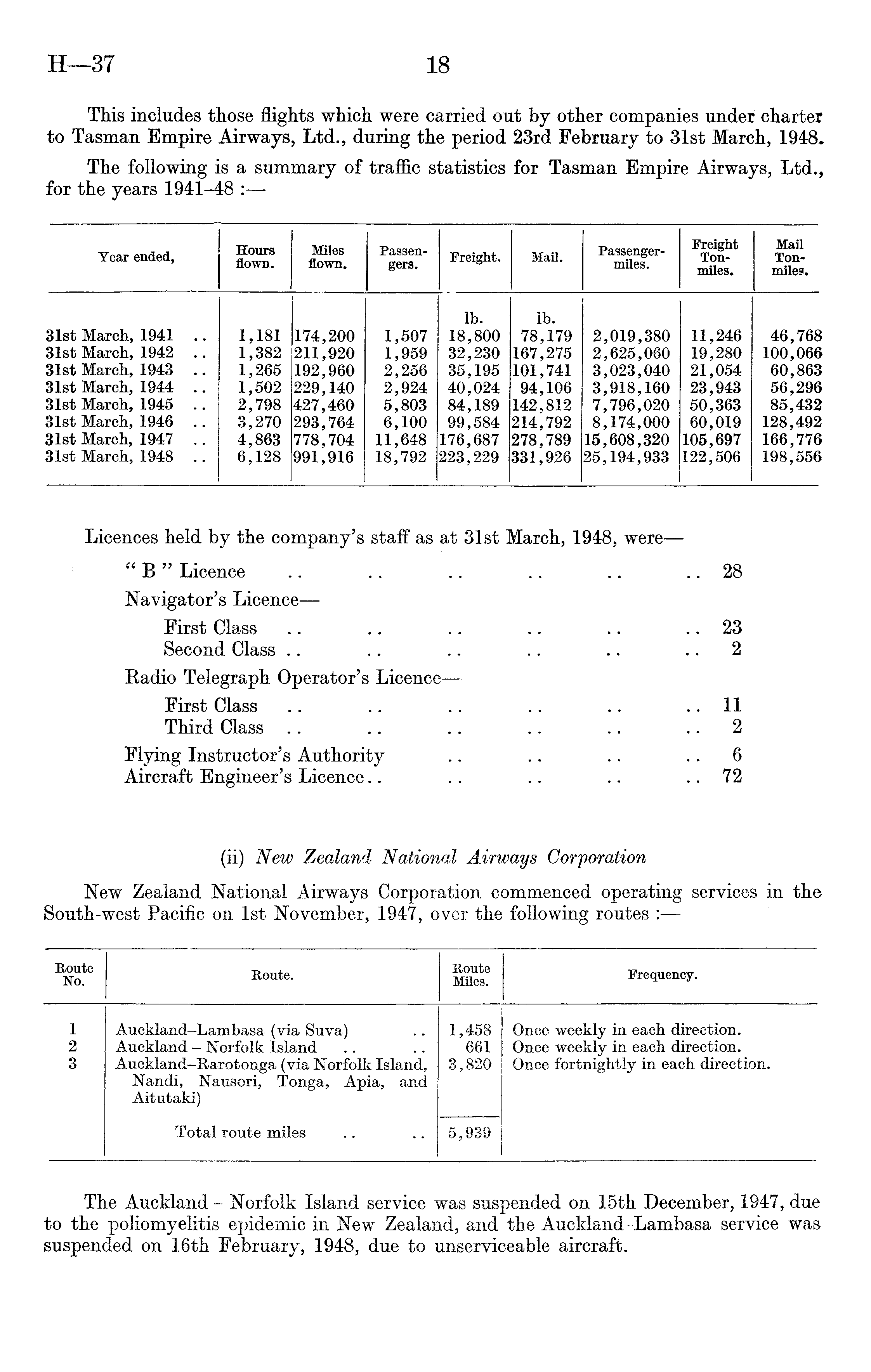 This includes those flights which were carried out by other companies under charter to Tasman Empire Airways, Ltd., during the period 23rd February to 31st March, 1948. The following is a summary of traffic statistics for Tasman Empire Airways, Ltd., for the years 1941-48 :