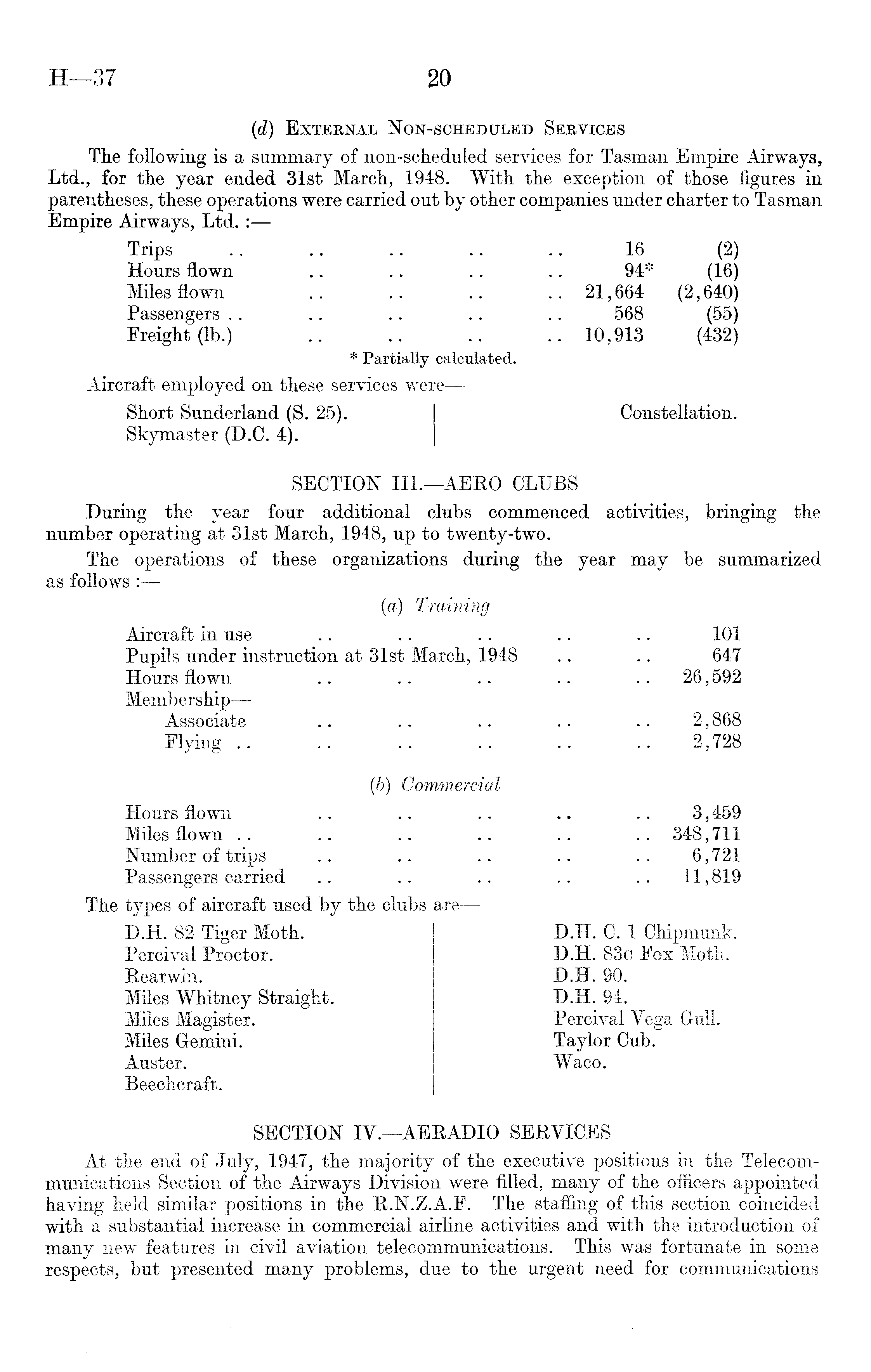 (d) External Non-scheduled Services The following is a summary of non-scheduled services for Tasman Empire Airways, Ltd., for the year ended 31st March, 1948. With the exception of those figures in parentheses, these operations were carried out by other companies under charter to Tasman Empire Airways, Ltd.: — Trips .. .. .. .. .. 16 (2) Hours flown .. .. .. .. 94* (16) Miles flown .. .. .. ..21,664 (2,640) Passengers .. .. .. .. .. 568 (55) Freight (lb.) .. .. .. ..10,913 (432) * Partially calculated. Aircraft employed on these services were — Short Sunderland (S. 25). Constellation. Skymaster (D.C. 4). SECTION lII.—AEEO CLUBS During the year four additional clubs commenced activities, bringing the number operating at 31st March, 1948, up to twenty-two. The operations of these organizations during the year may be summarized as follows : (a) Training Aircraft in use .. .. .. .. .. 101 Pupils under instruction at 31st March, 1948 .. .. 647 Hours flown .. .. .. .. .. 26,592 Membership— Associate .. .. .. .. .. 2,868 Flying 2,728 (b) Commercial Hours flown .. .. .. .. .. 3,459 Miles flown .. .. .. .. .. .. 348,711 Number of trips .. .. .. .. .. 6, 721 Passengers carried .. .. .. .. .. 11,819 The types of aircraft used by the clubs are— D.H. 82 Tiger Moth. D.H. C. 1 Chipmunk. . Percival Proctor. D.H. 83c Fox Moth. Eearwin. D.H. 90. Miles Whitney Straight. D.H. 94, Miles Magister. Percival Vega Gull. Miles Gemini. Taylor Cub. Auster. Waco. Beechcraft. V SECTION IV.—AERADIO SERVICES At the end of July, 1947, the majority of the executive positions in the Telecommunications Section of the Airways Division were filled, many of the officers appointed having held similar positions in the R.N.Z.A.F. The staffing of this section coincided with a substantial increase in commercial airline activities and with the introduction of many new features in civil aviation telecommunications. This was fortunate in some respects, but presented many problems, due to the urgent need for communications