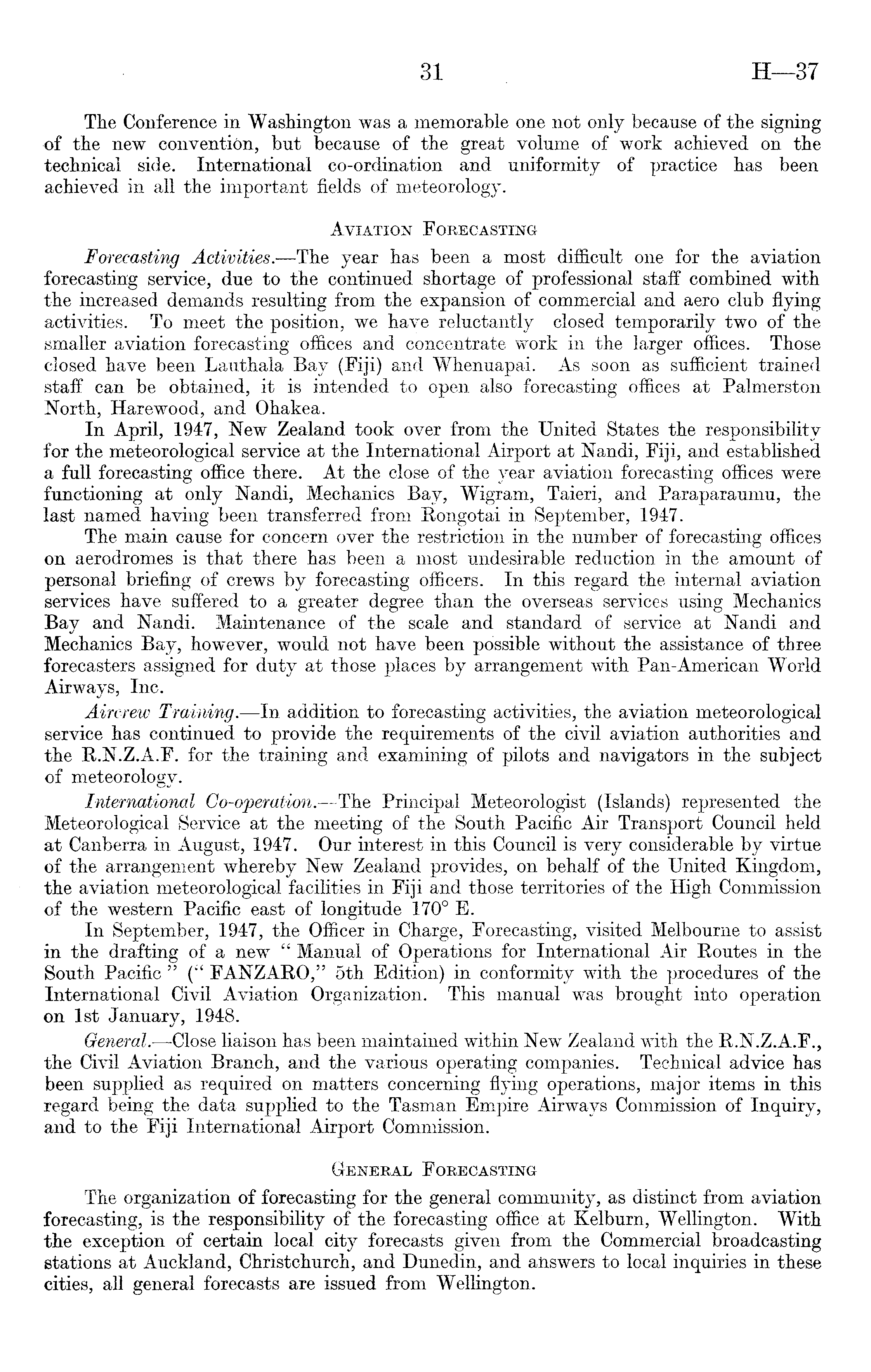 The Conference in Washington was a memorable one not only because of the signing of the new convention, but because of the great volume of work achieved on the technical side. International co-ordination and uniformity of practice has been achieved in all the important fields of meteorology. Aviation Forecasting Forecasting Activities. —The year has been a most difficult one for the aviation forecasting service, due to the continued shortage of professional staff combined with the increased demands resulting from the expansion of commercial and aero club flying activities. To meet the position, we have reluctantly closed temporarily two of the smaller aviation forecasting offices and concentrate work in the larger offices. Those closed have been Lauthala Bay (Fiji) and Whenuapai. As soon as sufficient trained staff can be obtained, it is intended to open also forecasting offices at Palmerston North, Harewood, and Ohakea. In April, 1947, New Zealand took over from the United States the responsibility for the meteorological service at the International Airport at Nandi, Fiji, and established a full forecasting office there. At the close of the year aviation forecasting offices were functioning at only Nandi, Mechanics Bay, Wigram, Taieri, and Paraparaumu, the last named having been transferred from Rongotai in September, 1947. The main cause for concern over the restriction in the number of forecasting offices on aerodromes is that there has been a most undesirable reduction in the amount of personal briefing of crews by forecasting officers. In this regard the internal aviation services have suffered to a greater degree than the overseas services using Mechanics Bay and Nandi. Maintenance of the scale and standard of service at Nandi and Mechanics Bay, however, would not have been possible without the assistance of three forecasters assigned for duty at those places by arrangement with Pan-American World Airways, Inc. Aircrew Training. —ln addition to forecasting activities, the aviation meteorological service has continued to provide the requirements of the civil aviation authorities and the R.N.Z.A.F. for the training and examining of pilots and navigators in the subject of meteorology. International Co-operation. —The Principal Meteorologist (Islands) represented the Meteorological Service at the meeting of the South Pacific Air Transport Council held at Canberra in August, 1947. Our interest in this Council is very considerable by virtue of the arrangement whereby New Zealand provides, on behalf of the United Kingdom, the aviation meteorological facilities in Fiji and those territories of the High Commission of the western Pacific east of longitude 170° E. In September, 1947, the Officer in Charge, Forecasting, visited Melbourne to assist in the drafting of a new " Manual of Operations for International Air Routes in the South Pacific " (" FANZARO," sth Edition) in conformity with the procedures of the International Civil Aviation Organization. This manual was brought into operation on Ist January, 1948. General. —Close liaison has been maintained within New Zealand with the R.N.Z.A.F., the Civil Aviation Branch, and the various operating companies. Technical advice has been supplied as required on matters concerning flying operations, major items in this regard being the data supplied to the Tasman Empire Airways Commission of Inquiry, and to the Fiji International Airport Commission. General Forecasting The organization of forecasting for the general community, as distinct from aviation forecasting, is the responsibility of the forecasting office at Kelburn, Wellington. With the exception of certain local city forecasts given from the Commercial broadcasting stations at Auckland, Christchurch, and Dunedin, and answers to local inquiries in these cities, all general forecasts are issued from Wellington.