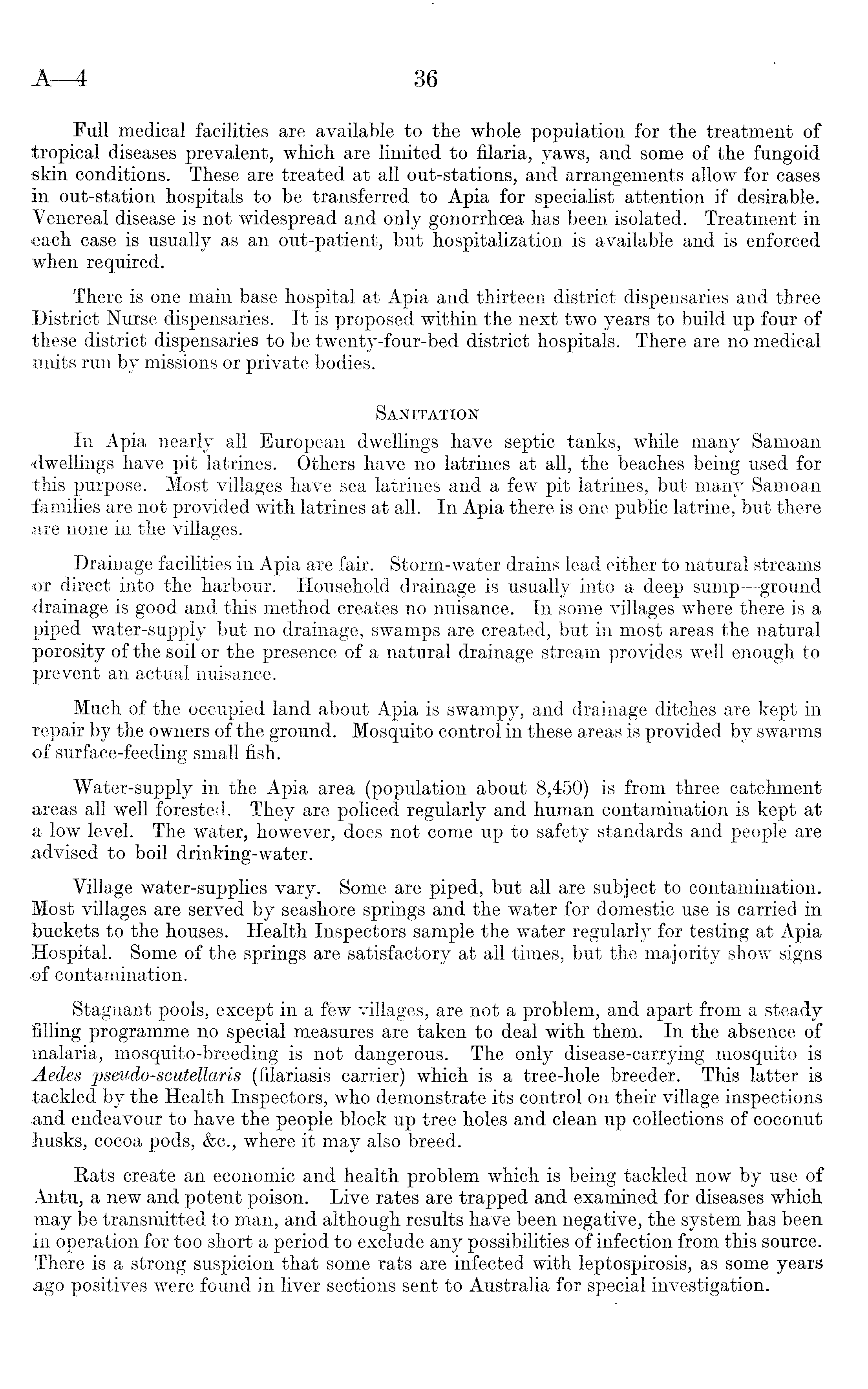 Full medical facilities are available to the whole population for the treatment of tropical diseases prevalent, which are limited to filaria, yaws, and some of the fungoid skin conditions. These are treated at all out-stations, and arrangements allow for cases in out-station hospitals to be transferred to Apia for specialist attention if desirable. Venereal disease is not widespread and only gonorrhoea has been isolated. Treatment in each case is usually as an out-patient, but hospitalization is available and is enforced when required. There is one main base hospital at Apia and thirteen district dispensaries and three District Nurse dispensaries. It is proposed within the next two years to build up four of these district dispensaries to be twenty-four-bed district hospitals. There are no medical units run by missions or private bodies. Sanitation In Apia nearly all European dwellings have septic tanks, while many Samoan -dwellings have pit latrines. Others have no latrines at all, the beaches being used for this purpose. Most villages have sea latrines and a few pit latrines, but many Samoan families are not provided with latrines at all. In Apia there is one public latrine, but there are none in the villages. Drainage facilities in Apia are fair. Storm-water drains lead either to natural streams or direct into the harbour. Household drainage is usually into a deep sump —ground ■drainage is good and this method creates no nuisance. In some villages where there is a piped water-supply but no drainage, swamps are created, but in most areas the natural porosity of the soil or the presence of a natural drainage stream provides well enough to prevent an actual nuisance. Much of the occupied land about Apia is swampy, and drainage ditches are kept in repair by the owners of the ground. Mosquito control in these areas is provided by swarms of surface-feeding small fish. Water-supply in the Apia area (population about 8,450) is from three catchment areas all well forested. They are policed regularly and human contamination is kept at a low level. The water, however, does not come up to safety standards and people are advised to boil drinking-water. Village water-supplies vary. Some are piped, but all are subject to contamination. Most villages are served by seashore springs and the water for domestic use is carried in buckets to the houses. Health Inspectors sample the water regularly for testing at Apia Hospital. Some of the springs are satisfactory at all times, but the majority show signs of contamination. Stagnant pools, except in a f&w villages, are not a problem, and apart from a steady filling programme no special measures are taken to deal with them. In the absence of malaria, mosquito-breeding is not dangerous. The only disease-carrying mosquito is Aedes pseudo-scutellaris (filariasis carrier) which is a tree-hole breeder. This latter is tackled by the Health Inspectors, who demonstrate its control on their village inspections and endeavour to have the people block up tree holes and clean up collections of coconut husks, cocoa pods, &c., where it may also breed. Eats create an economic and health problem which is being tackled now by use of Antu, a new and potent poison. Live rates are trapped and examined for diseases which may be transmitted to man, and although results have been negative, the system has been in operation for too short a period to exclude any possibilities of infection from this source. There is a strong suspicion that some rats are infected with leptospirosis, as some years ago positives were found in liver sections sent to Australia for special investigation.
