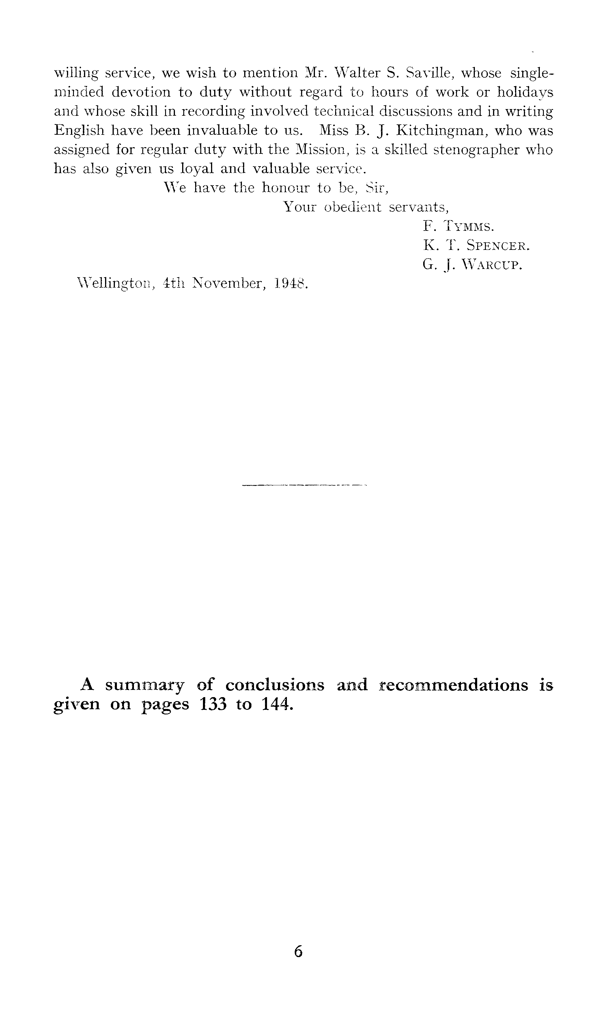 willing service, w.e wish to mention Mr. Walter S. Saville, whose singleminded devotion to duty without regard to hours of work or holidays and whose skill in recording involved technical discussions and in writing English have been invaluable to us. Miss B. J. Kitchingman, who was assigned for regular duty with the Mission, is a skilled stenographer who has also given us loyal and valuable service. We have the honour to be, Sir, Your obedient servants, F. Tymms. K. T. Spencer. G. J. Warcup. Wellington, 4th November, 1948.