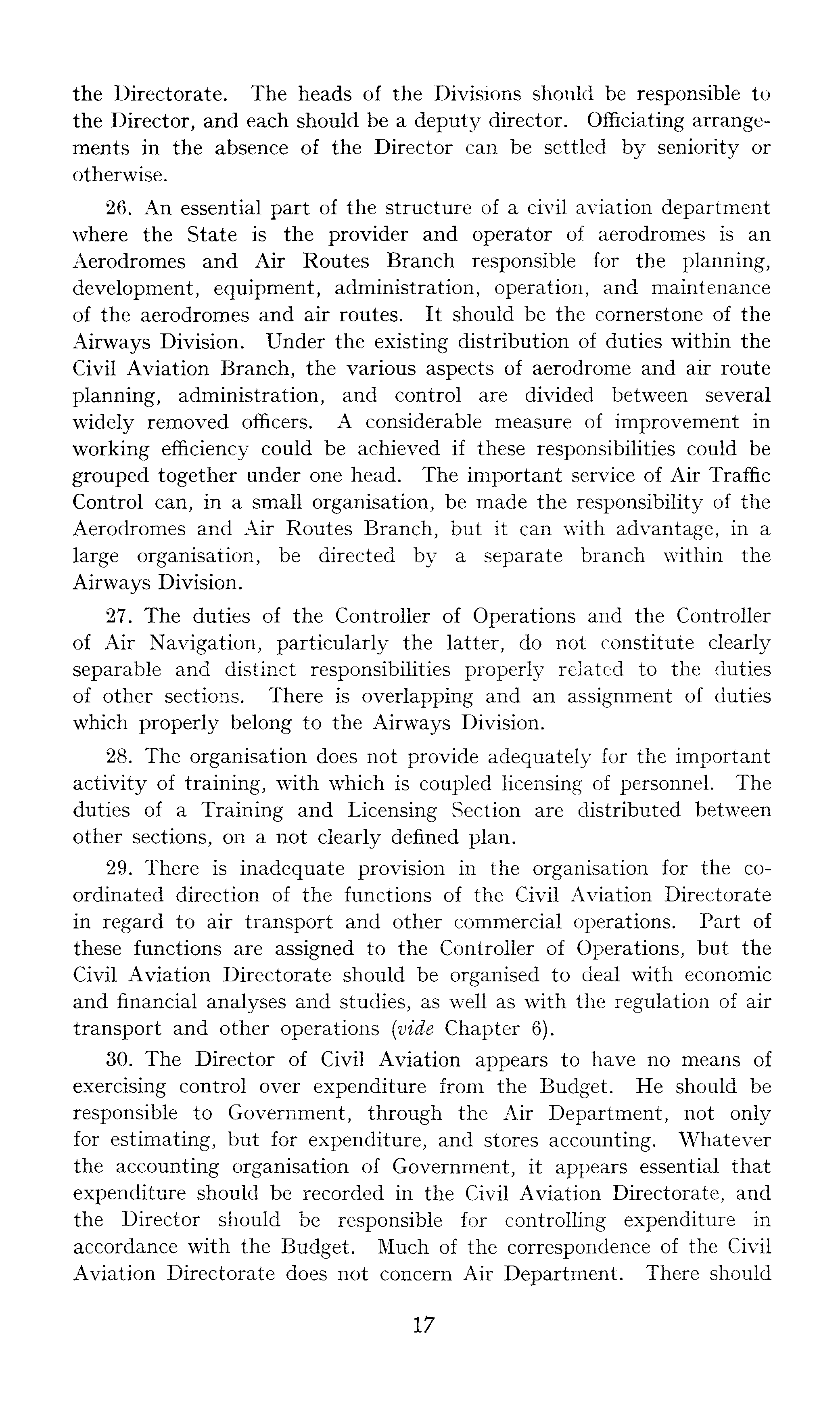 the Directorate. The heads of the Divisions should be responsible to the Director, and each should be a deputy director. Officiating arrangements in the absence of the Director can be settled by seniority or otherwise. 26. An essential part of the structure of a civil aviation department where the State is the provider and operator of aerodromes is an Aerodromes and Air Routes Branch responsible for the planning, development, equipment, administration, operation, and maintenance of the aerodromes and air routes. It should be the cornerstone of the Airways Division. Under the existing distribution of duties within the Civil Aviation Branch, the various aspects of aerodrome and air route planning, administration, and control are divided between several widely removed officers. A considerable measure of improvement in working efficiency could be achieved if these responsibilities could be grouped together under one head. The important service of Air Traffic Control can, in a small organisation, be made the responsibility of the Aerodromes and Air Routes Branch, but it can with advantage, in a large organisation, be directed by a separate branch within the Airways Division. 27. The duties of the Controller of Operations and the Controller of Air Navigation, particularly the latter, do not constitute clearly separable and distinct responsibilities properly related to the duties of other sections. There is overlapping and an assignment of duties which properly belong to the Airways Division. 28. The organisation does not provide adequately for the important activity of training, with which is coupled licensing of personnel. The duties of a Training and Licensing Section are distributed between other sections, on a not clearly defined plan. 29. There is inadequate provision in the organisation for the coordinated direction of the functions of the Civil Aviation Directorate in regard to air transport and other commercial operations. Part of these functions are assigned to the Controller of Operations, but the Civil Aviation Directorate should be organised to deal with economic and financial analyses and studies, as well as with the regulation of air transport and other operations {vide Chapter 6). 30. The Director of Civil Aviation appears to have no means of exercising control over expenditure from the Budget. He should be responsible to Government, through the Air Department, not only for estimating, but for expenditure, and stores accounting. Whatever the accounting organisation of Government, it appears essential that expenditure should be recorded in the Civil Aviation Directorate, and the Director should be responsible for controlling expenditure in accordance with the Budget. Much of the correspondence of the Civil Aviation Directorate does not concern Air Department. There should