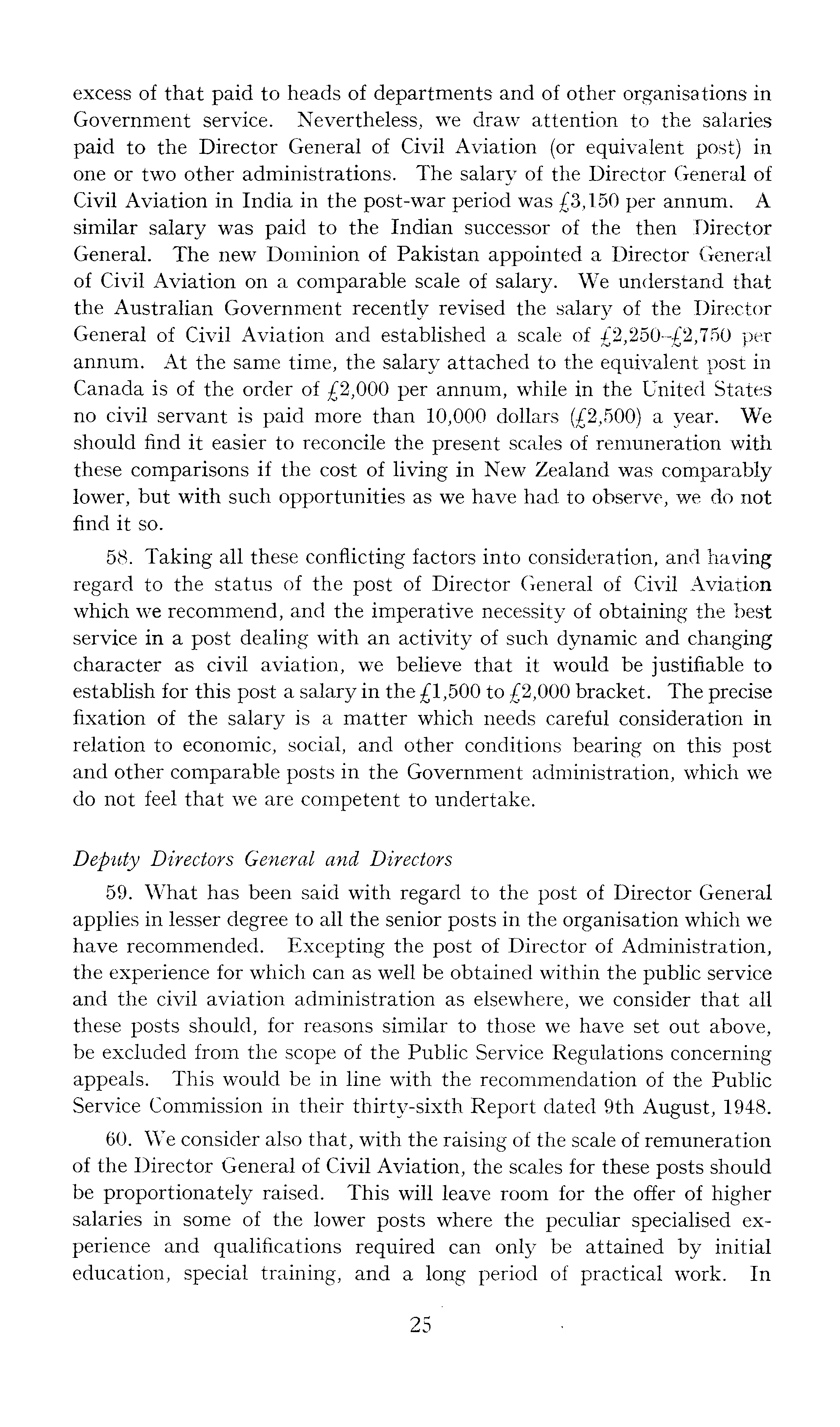 excess of that paid to heads of departments and of other organisations in Government service. Nevertheless, we draw attention to the salaries paid to the Director General of Civil Aviation (or equivalent post) in one or two other administrations. The salary of the Director General of Civil Aviation in India in the post-war period was £3,150 per annum. A similar salary was paid to the Indian successor of the then Director General. The new Dominion of Pakistan appointed a Director General of Civil Aviation on a comparable scale of salary. We understand that the Australian Government recently revised the salary of the Director General of Civil Aviation and established a scale of £2,250-£2,750 per annum. At the same time, the salary attached to the equivalent post in Canada is of the order of £2,000 per annum, while in the United States no civil servant is paid more than 10,000 dollars (£2,500) a year. We should find it easier to reconcile the present scales of remuneration with these comparisons if the cost of living in New Zealand was comparably lower, but with such opportunities as we have had to observe, we do not find it so. 58. Taking all these conflicting factors into consideration, and having regard to the status of the post of Director General of Civil Aviation which we recommend, and the imperative necessity of obtaining the best service in a post dealing with an activity of such dynamic and changing character as civil aviation, we believe that it would be justifiable to establish for this post a salary in the £1,500 to £2,000 bracket. The precise fixation of the salary is a matter which needs careful consideration in relation to economic, social, and other conditions bearing on this post and other comparable posts in the Government administration, which we do not feel that we are competent to undertake. Deputy Directors General and Directors 59. What has been said with regard to the post of Director General applies in lesser degree to all the senior posts in the organisation which we have recommended. Excepting the post of Director of Administration, the experience for which can as well be obtained within the public service and the civil aviation administration as elsewhere, we consider that all these posts should, for reasons similar to those we have set out above, be excluded from the scope of the Public Service Regulations concerning appeals. This would be in line with the recommendation of the Public Service Commission in their thirty-sixth Report dated 9th August, 1948. 60. We consider also that, with the raising of the scale of remuneration of the Director General of Civil Aviation, the scales for these posts should be proportionately raised. This will leave room for the offer of higher salaries in some of the lower posts where the peculiar specialised experience and qualifications required can only be attained by initial education, special training, and a long period of practical work. In