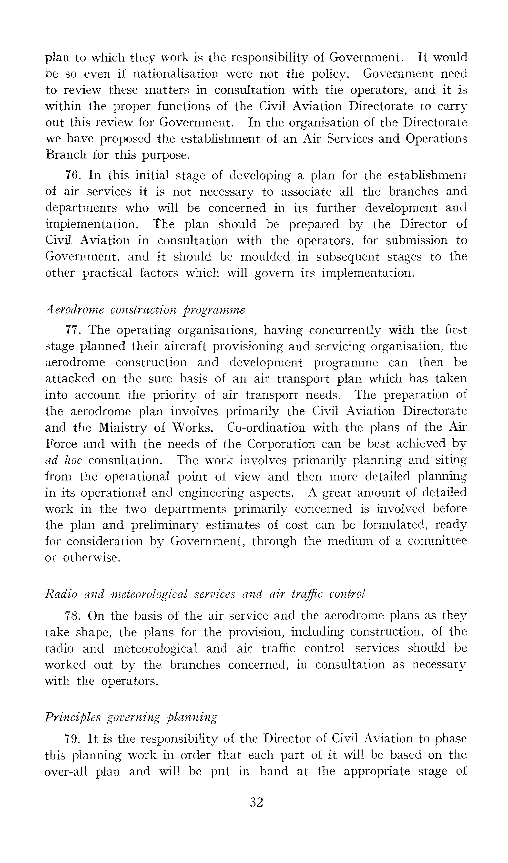 plan to which they work is the responsibility of Government. It would be so even if nationalisation were not the policy. Government need to review these matters in consultation with the operators, and it is within the proper functions of the Civil Aviation Directorate to carry out this review for Government. In the organisation of the Directorate we have proposed the establishment of an Air Services and Operations Branch for this purpose. 76. In this initial stage of developing a plan for the establishment of air services it is not necessary to associate all the branches and departments who will be concerned in its further development and implementation. The plan should be prepared by the Director of Civil Aviation in consultation with the operators, for submission to Government, and it should be moulded in subsequent stages to the other practical factors which will govern its implementation. Aerodrome construction programme 77. The operating organisations, having concurrently with the first stage planned their aircraft provisioning and servicing organisation, the aerodrome construction and development programme can then be attacked on the sure basis of an air transport plan which has taken into account the priority of air transport needs. The preparation of the aerodrome plan involves primarily the Civil Aviation Directorate and the Ministry of Works. Co-ordination with the plans of the Air Force and with the needs of the Corporation can be best achieved by ad hoc consultation. The work involves primarily planning and siting from the operational point of view and then more detailed planning in its operational and engineering aspects. A great amount of detailed work in the two departments primarily concerned is involved before the plan and preliminary estimates of cost can be formulated, ready for consideration by Government, through the medium of a committee or otherwise. Radio and meteorological services and air traffic control 78. On the basis of the air service and the aerodrome plans as they take shape, the plans for the provision, including construction, of the radio and meteorological and air traffic control services should be worked out by the branches concerned, in consultation as necessary with the operators. Principles governing planning 79. It is the responsibility of the Director of Civil Aviation to phase this planning work in order that each part of it will be based on the over-all plan and will be put in hand at the appropriate stage of