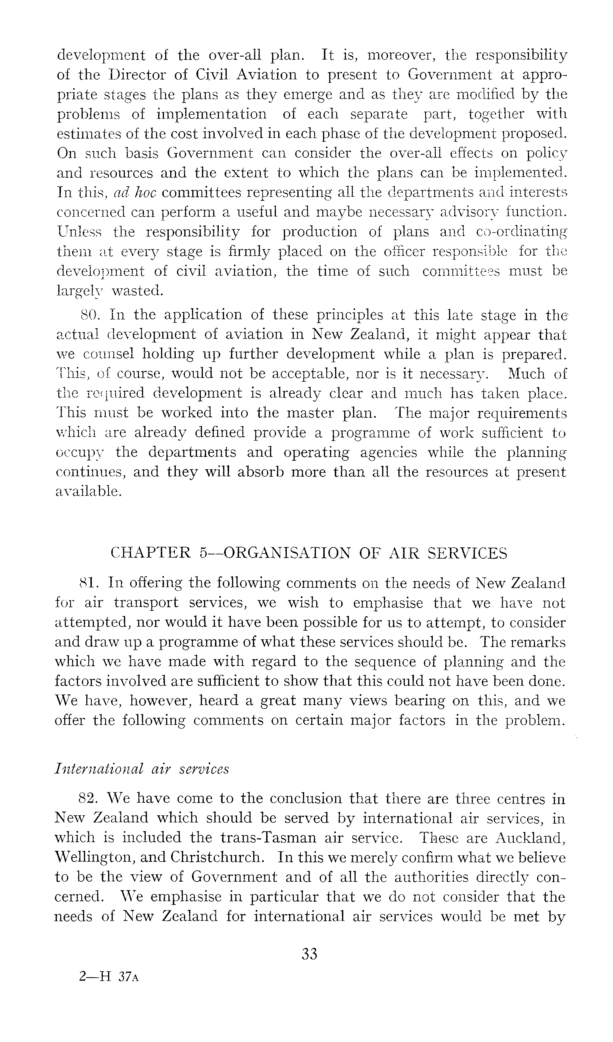development of the over-all plan. It is, moreover, the responsibility of the Director of Civil Aviation to present to Government at appropriate stages the plans as they emerge and as they are modified by the problems of implementation of each separate part, together with estimates of the cost involved in each phase of the development proposed. On such basis Government can consider the over-all effects on policy and resources and the extent to which the plans can be implemented. In this, ad hoc committees representing all the departments and interests concerned can perform a useful and maybe necessary advisory function. Unless the responsibility for production of plans and co-ordinating them at every stage is firmly placed on the officer responsible for the development of civil aviation, the time of such committees must be largely wasted. 80. In the application of these principles at this late stage in the actual development of aviation in New Zealand, it might appear that we counsel holding up further development while a plan is prepared. This, of course, would not be acceptable, nor is it necessary. Much of the required development is already clear and much has taken place. This must be worked into the master plan. The major requirements which are already defined provide a programme of work sufficient to occupy the departments and operating agencies while the planning continues, and they will absorb more than all the resources at present available. CHAPTER S—ORGANISATION OF AIR SERVICES 81. In offering the following comments on the needs of New Zealand for air transport services, we wish to emphasise that we have not attempted, nor would it have been possible for us to attempt, to consider and draw up a programme of what these services should be. The remarks which we have made with regard to the sequence of planning and the factors involved are sufficient to show that this could not have been done. We have, however, heard a great many views bearing on this, and we offer the following comments on certain major factors in the problem. International air services 82. We have come to the conclusion that there are three centres in New Zealand which should be served by international air services, in which is included the trans-Tasman air service. These are Auckland, Wellington, and Christchurch. In this we merely confirm what we believe to be the view of Government and of all the authorities directly concerned. We emphasise in particular that we do not consider that the needs of New Zealand for international air services would be met by