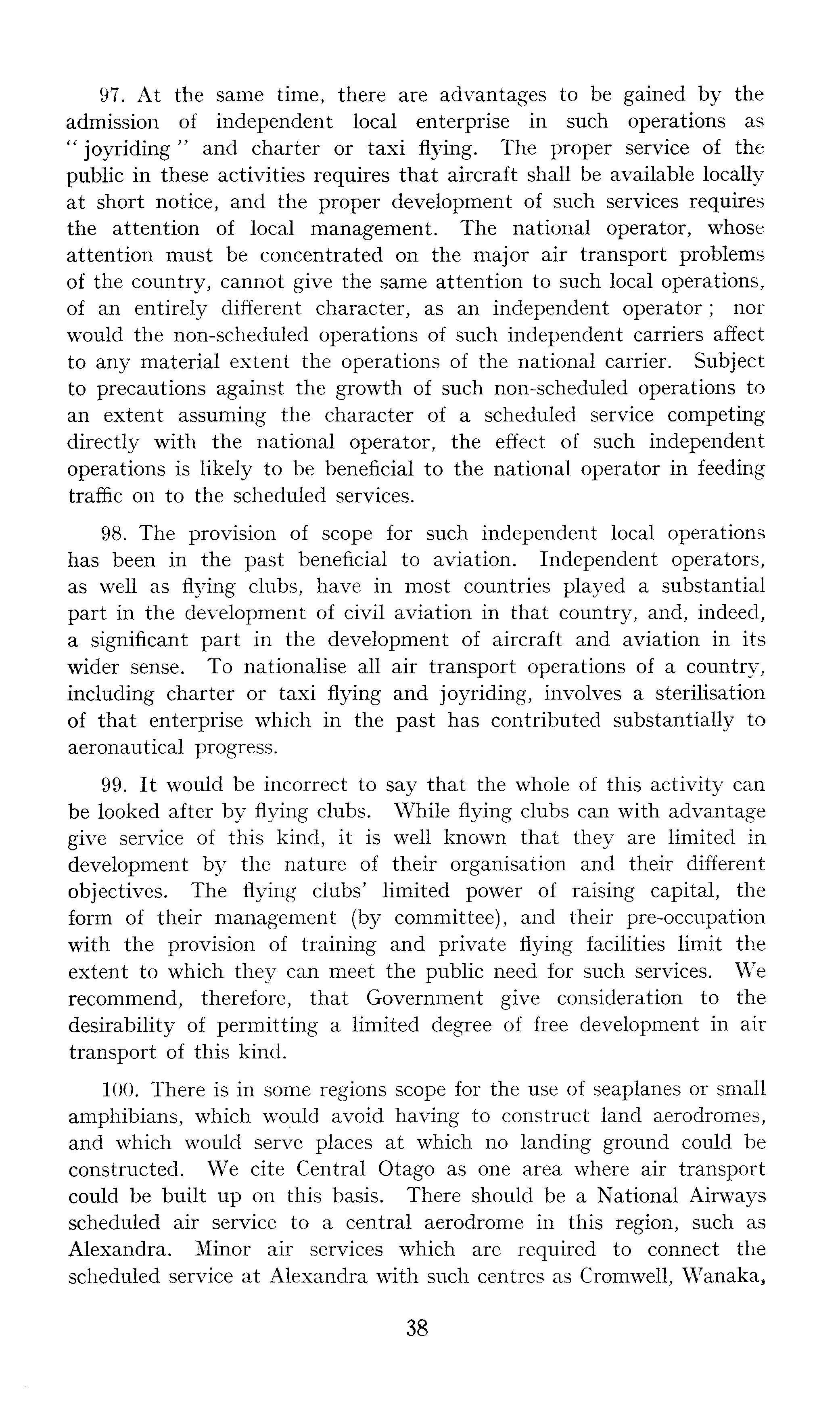 97. At the same time, there are advantages to be gained by the admission of independent local enterprise in such operations as " joyriding " and charter or taxi flying. The proper service of the public in these activities requires that aircraft shall be available locally at short notice, and the proper development of such services requires the attention of local management. The national operator, whose attention must be concentrated on the major air transport problems of the country, cannot give the same attention to such local operations, of an entirely different character, as an independent operator; nor would the non-scheduled operations of such independent carriers affect to any material extent the operations of the national carrier. Subject to precautions against the growth of such non-scheduled operations to an extent assuming the character of a scheduled service competing directly with the national operator, the effect of such independent operations is likely to be beneficial to the national operator in feeding traffic on to the scheduled services. 98. The provision of scope for such independent local operations has been in the past beneficial to aviation. Independent operators, as well as flying clubs, have in most countries played a substantial part in the development of civil aviation in that country, and, indeed, a significant part in the development of aircraft and aviation in its wider sense. To nationalise all air transport operations of a country, including charter or taxi flying and joyriding, involves a sterilisation of that enterprise which in the past has contributed substantially to aeronautical progress. 99. It would be incorrect to say that the whole of this activity can be looked after by flying clubs. While flying clubs can with advantage give service of this kind, it is well known that they are limited in development by the nature of their organisation and their different objectives. The flying clubs' limited power of raising capital, the form of their management (by. committee), and their pre-occupation with the provision of training and private flying facilities limit the extent to which they can meet the public need for such services. We recommend, therefore, that Government give consideration to the desirability of permitting a limited degree of free development in air transport of this kind. 100. There is in some regions scope for the use of seaplanes or small amphibians, which would avoid having to construct land aerodromes, and which would serve places at which no landing ground could be constructed. We cite Central Otago as one area where air transport could be built up on this basis. There should be a National Airways scheduled air service to a central aerodrome in this region, such as Alexandra. Minor air services which are required to connect the scheduled service at Alexandra with such centres as Cromwell, Wanaka,