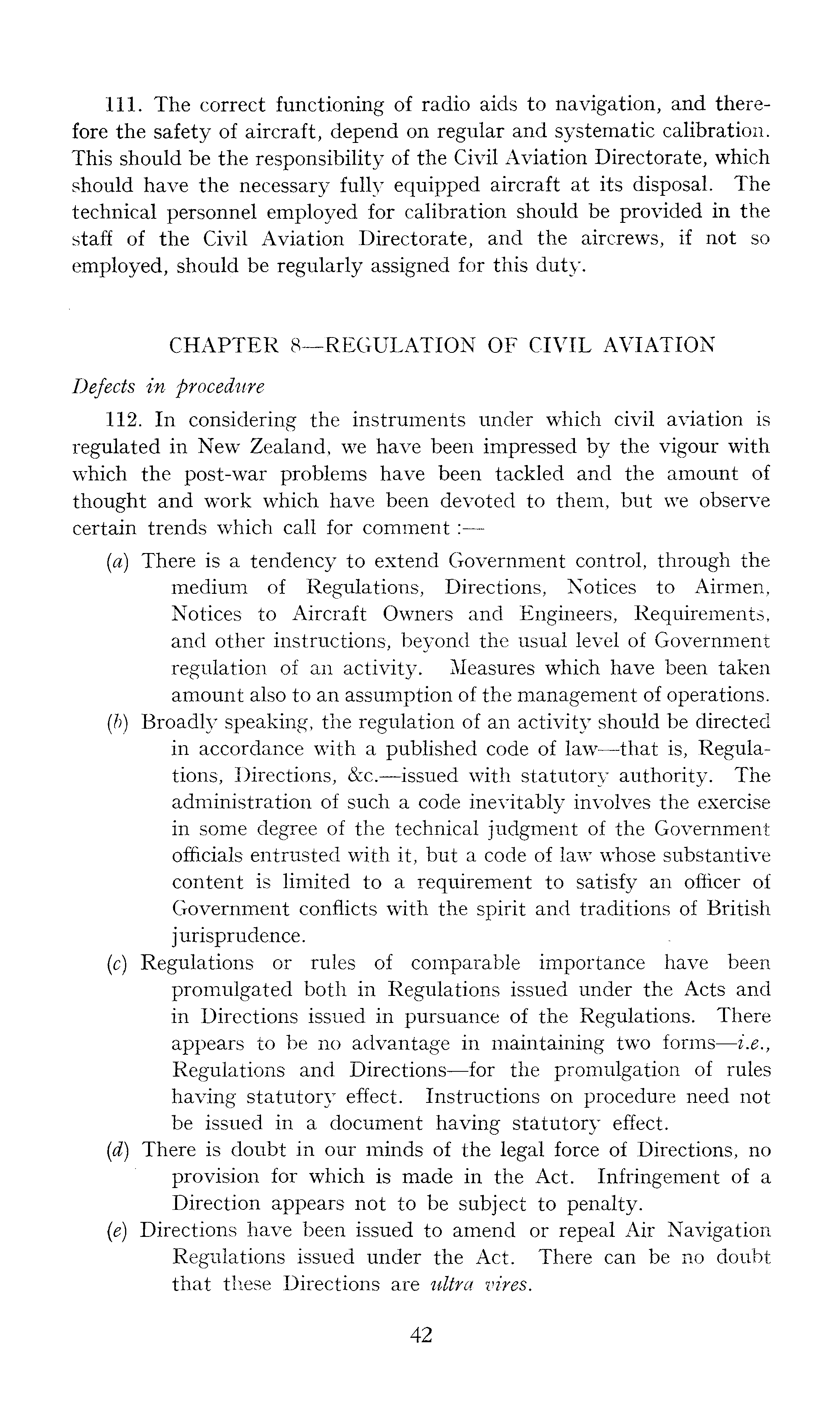 111. The correct functioning of radio aids to navigation, and therefore the safety of aircraft, depend on regular and systematic calibration. This should be the responsibility of the Civil Aviation Directorate, which should have the necessary fully equipped aircraft at its disposal. The technical personnel employed for calibration should be provided in the staff of the Civil Aviation Directorate, and the aircrews, if not so employed, should be regularly assigned for this duty. CHAPTER B—REGULATION OF CIVIL AVIATION Defects in procedure 112. In considering the instruments under which civil aviation is regulated in New Zealand, we have been impressed by the vigour with which the post-war problems have been tackled and the amount of thought and work which have been devoted to them, but we observe certain trends which call for comment: — (a) There is a tendency to extend Government control, through the medium of Regulations, Directions, Notices to Airmen, Notices to Aircraft Owners and Engineers, Requirements, and other instructions, beyond the usual level of Government regulation of an activity. Measures which have been taken amount also to an assumption of the management of operations. (b) Broadly speaking, the regulation of an activity should be directed in accordance with a published code of law —that is, Regulations, Directions, &c. —issued with statutory authority. The administration of such a code inevitably involves the exercise in some degree of the technical judgment of the Government officials entrusted with it, but a code of law whose substantive content is limited to a requirement to satisfy an officer of Government conflicts with the spirit and traditions of British jurisprudence. (c) Regulations or rules of comparable importance have been promulgated both in Regulations issued under the Acts and in Directions issued in pursuance of the Regulations. There appears to be no advantage in maintaining two forms—i.e., Regulations and Directions —for the promulgation of rules having statutory effect. Instructions on procedure need not be issued in a document having statutory effect. (d) There is doubt in our minds of the legal force of Directions, no provision for which is made in the Act. Infringement of a Direction appears not to be subject to penalty. (e) Directions have been issued to amend or repeal Air Navigation Regulations issued under the Act. There can be no doubt that these Directions are ultra vires.