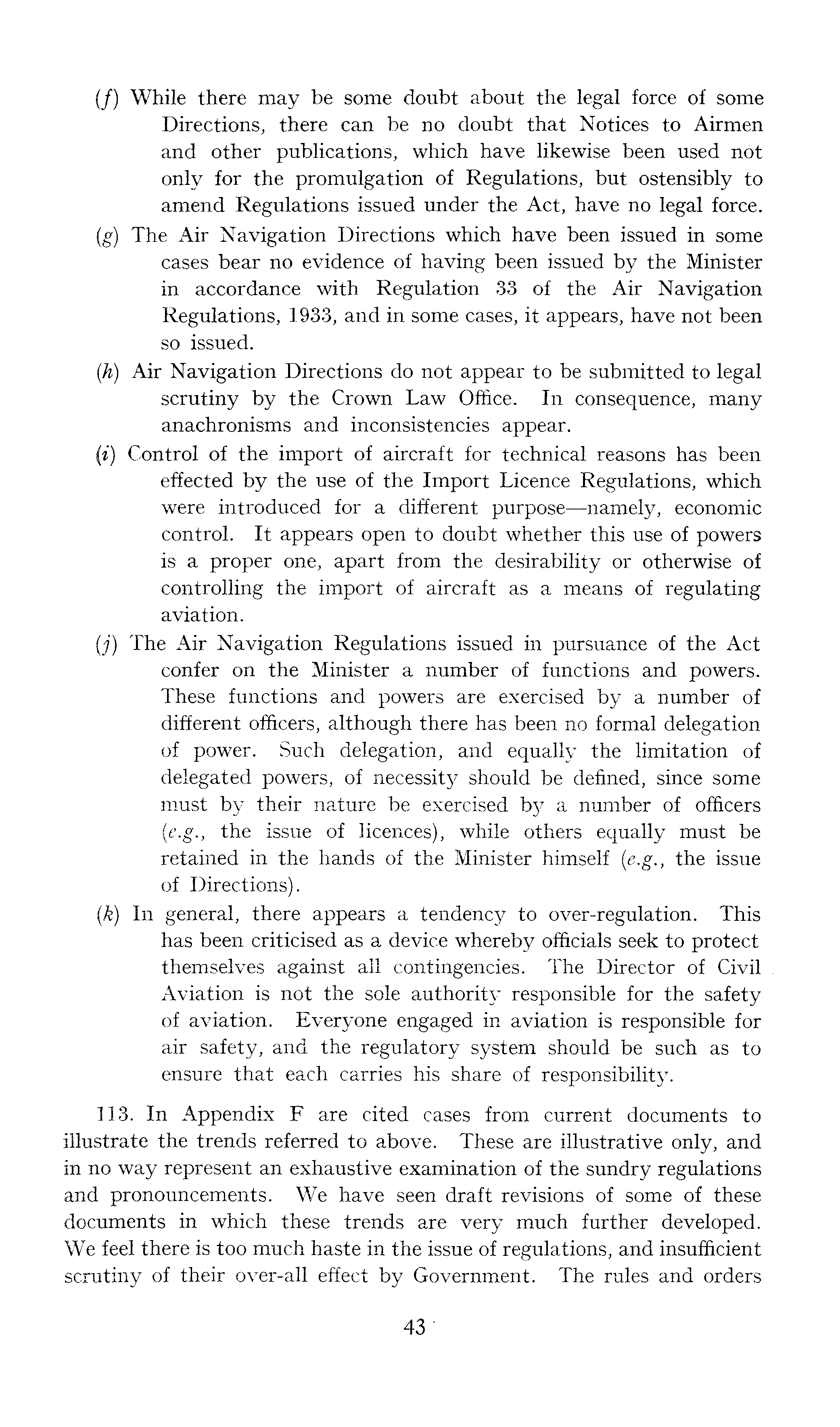 {/) While there may be some doubt about the legal force of some Directions, there can be no doubt that Notices to Airmen and other publications, which have likewise been used not only for the promulgation of Regulations, but ostensibly to amend Regulations issued under the Act, have no legal force. (g) The Air Navigation Directions which have been issued in some cases bear no evidence of having been issued by the Minister in accordance with Regulation 33 of the Air Navigation Regulations, 1933, and in some cases, it appears, have not been so issued. (h) Air Navigation Directions do not appear to be submitted to legal scrutiny by the Crown Law Office. In consequence, many anachronisms and inconsistencies appear. (i) Control of the import of aircraft for technical reasons has been effected by the use of the Import Licence Regulations, which were introduced for a different purpose —namely, economic control. It appears open to doubt whether this use of powers is a proper one, apart from the desirability or otherwise of controlling the import of aircraft as a means of regulating aviation. (j) The Air Navigation Regulations issued in pursuance of the Act confer on the Minister a number of functions and powers. These functions and powers are exercised by a number of different officers, although there has been no formal delegation of power. Such delegation, and equally the limitation of delegated powers, of necessity should be defined, since some must by their nature be exercised by a number of officers (e.g., the issue of licences), while others equally must be retained in the hands of the Minister himself (e.g., the issue of Directions). (k) In general, there appears a tendency to over-regulation. This has been criticised as a device whereby officials seek to protect themselves against all contingencies. The Director of Civil Aviation is not the sole authority responsible for the safety of aviation. Everyone engaged in aviation is responsible for air safety, and the regulatory system should be such as to ensure that each carries his share of responsibility. 113. In Appendix F are cited cases from current documents to illustrate the trends referred to above. These are illustrative only, and in no way represent an exhaustive examination of the sundry regulations and pronouncements. We have seen draft revisions of some of these documents in which these trends are very much further developed. We feel there is too much haste in the issue of regulations, and insufficient scrutiny of their over-all effect by Government. The rules and orders