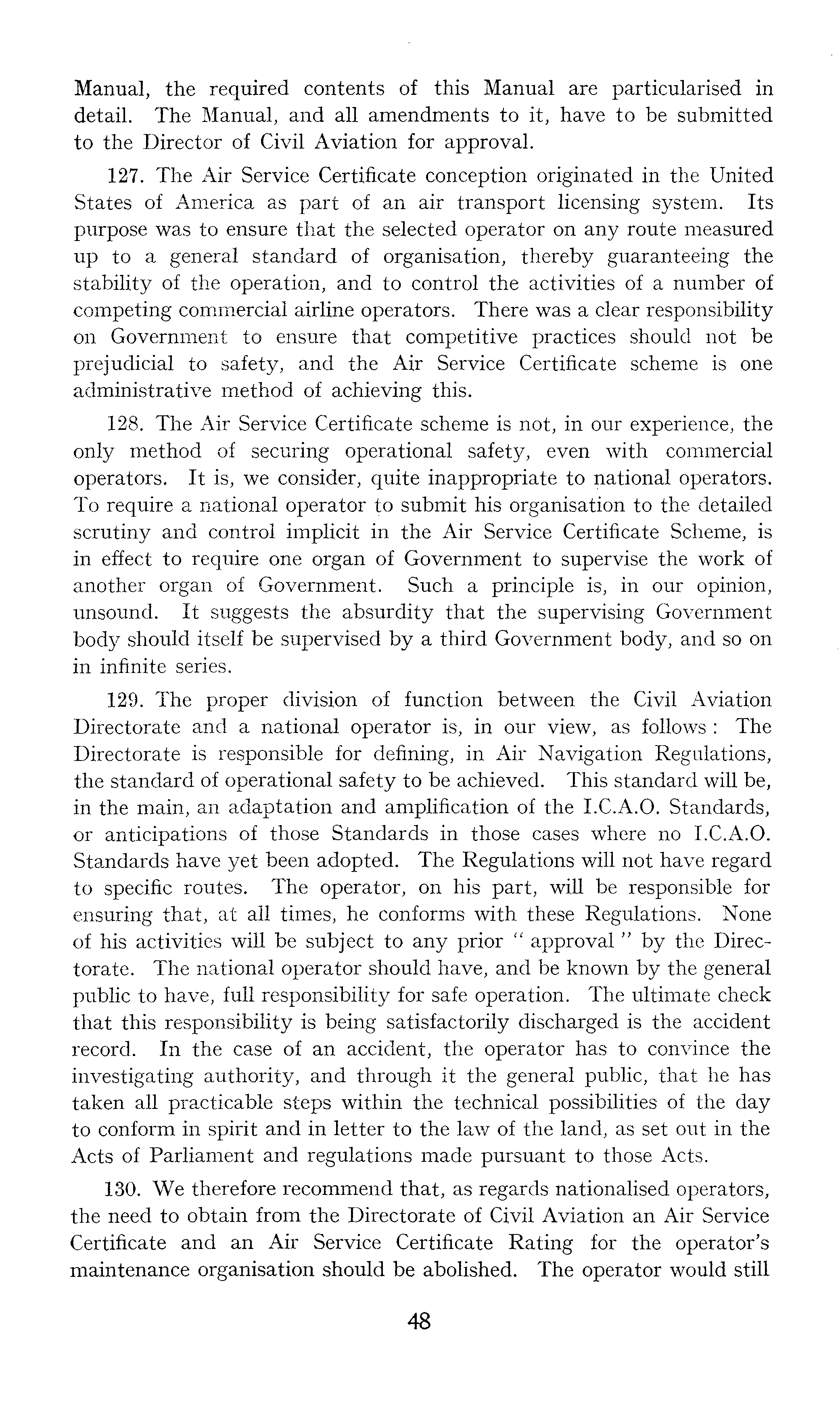 Manual, the required contents of this Manual are particularised in detail. The Manual, and all amendments to it, have to be submitted to the Director of Civil Aviation for approval. 127. The Air Service Certificate conception originated in the United States of America as part of an air transport licensing system. Its purpose was to ensure that the selected operator on any route measured up to a general standard of organisation, thereby guaranteeing the stability of the operation, and to control the activities of a number of competing, commercial airline operators. There was a clear responsibility on Government to ensure that competitive practices should not be prejudicial to safety, and the Air Service Certificate scheme is one administrative method of achieving this. 128. The Air Service Certificate scheme is not, in our experience, the only method of securing operational safety, even with commercial operators. It is, we consider, quite, inappropriate to national operators. To require a national operator to submit his organisation to the detailed scrutiny and control implicit in the Air Service Certificate Scheme, is in effect to require one organ of Government to supervise the work of another organ of Government. Such a principle is, in our opinion, unsound. It suggests the absurdity that the supervising Government body should itself be supervised by a third Government body, and so on in infinite series. 129. The proper division of function between the Civil Aviation Directorate and a national operator is, in our view, as follows : The Directorate is responsible for defining, in Air Navigation Regulations, the standard of operational safety to be achieved. This standard will be, in the main, an adaptation and amplification of the 1.C.A.0. Standards, or anticipations of those Standards in those cases where no 1.C.A.0. Standards have yet been adopted. The Regulations will not have regard to specific routes. The operator, on his part, will be responsible for ensuring that, at all times, he conforms with these Regulations. None of his activities will be subject to any prior " approval" by the Directorate. The national operator should have, and be known by the general public to have, full responsibility for safe operation. The ultimate check that this responsibility is being satisfactorily discharged is the accident record. In the case of an accident, the operator has to convince the investigating authority, and through it the general public, that he has taken all practicable steps within the technical possibilities of the day to conform in spirit and in letter to the law of the land, as set out in the Acts of Parliament and regulations made pursuant to those Acts. 130. We therefore recommend that, as regards nationalised operators, the need to obtain from the Directorate of Civil Aviation an Air Service Certificate and an Air Service Certificate Rating for the operator's maintenance organisation should be abolished. The operator would still