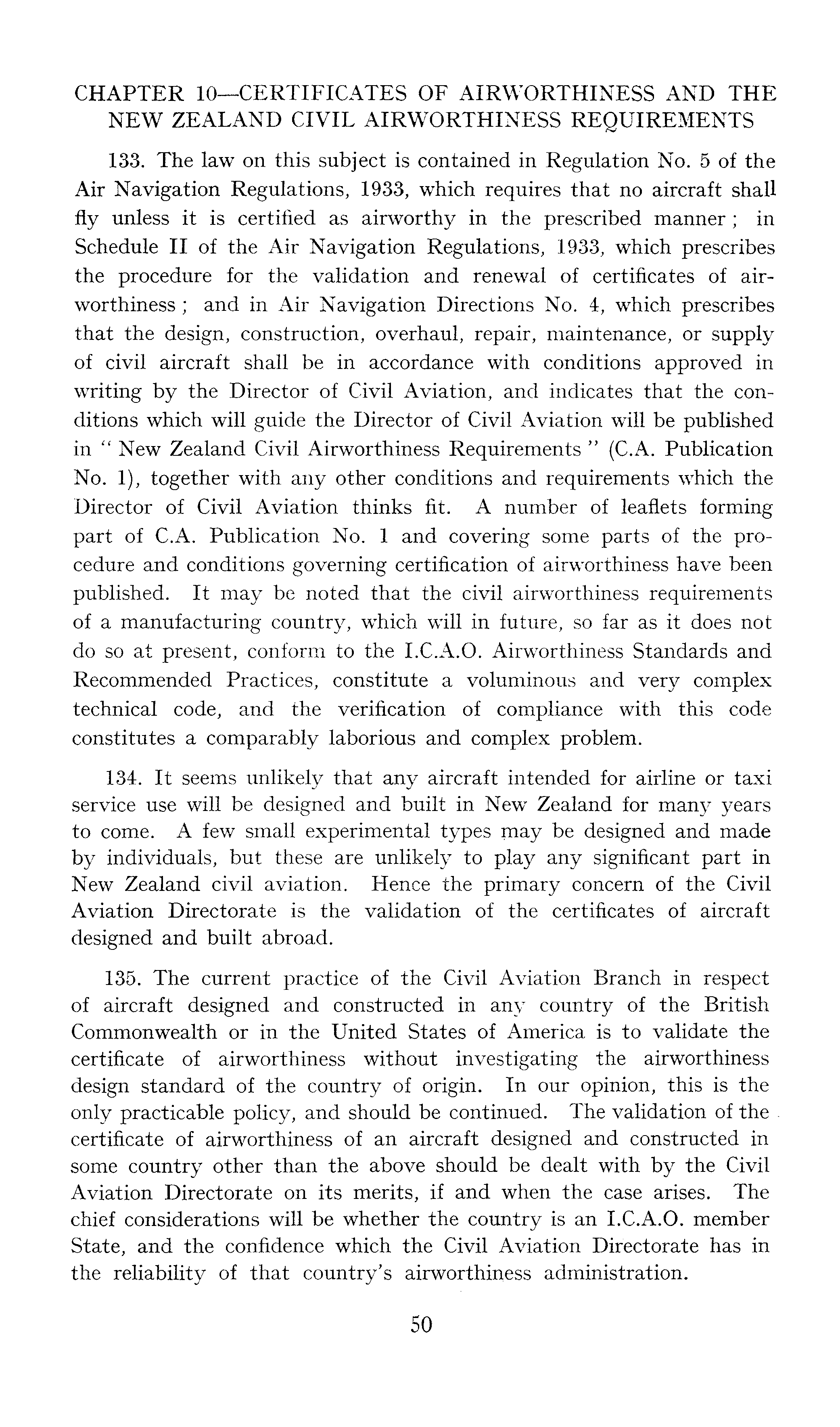 CHAPTER 10—CERTIFICATES OF AIRWORTHINESS AND THE NEW ZEALAND CIVIL AIRWORTHINESS REQUIREMENTS 133. The law on this subject is contained in Regulation No. 5 of the Air Navigation Regulations, 1933, which requires that no aircraft shall fly unless it is certified as airworthy in the prescribed manner; in Schedule II of the Air Navigation Regulations, 1933, which prescribes the procedure for the validation and renewal of certificates of airworthiness ; and in Air Navigation Directions No. 4, which prescribes that the design, construction, overhaul, repair, maintenance, or supply of civil aircraft shall be in accordance with conditions approved in writing by the Director of Civil Aviation, and indicates that the conditions which will guide the Director of Civil Aviation will be published in " New Zealand Civil Airworthiness Requirements " (C.A. Publication No. 1), together with any other conditions and requirements which the Director of Civil Aviation thinks fit. A number of leaflets forming part of C.A. Publication No. 1 and covering some parts of the procedure and conditions governing certification of airworthiness have been published. It may be noted that the civil airworthiness requirements of a manufacturing country, which will in future, so far as it does not do so at present, conform to the 1.C.A.0. Airworthiness Standards and Recommended Practices, constitute a voluminous and very complex technical code, and the verification of compliance with this code constitutes a comparably laborious and complex problem. 134. It seems unlikely that any aircraft intended for airline or taxi service use will be designed and built in New Zealand for many years to come. A few small experimental types may be designed and made by individuals, but these are unlikely to play any significant part in New Zealand civil aviation. Hence the primary concern of the Civil Aviation Directorate is the validation of the certificates of aircraft designed and built abroad. 135. The current practice of the Civil Aviation Branch in respect of aircraft designed and constructed in any country of the British Commonwealth or in the United States of America is to validate the certificate of airworthiness without investigating the airworthiness design standard of the country of origin. In our opinion, this is the only practicable policy, and should be continued. The validation of the . certificate of airworthiness of an aircraft designed and constructed in some country other than the above should be dealt with by the Civil Aviation Directorate on its merits, if and when the case arises. The chief considerations will be whether the country is an 1.C.A.0. member State, and the confidence which the Civil Aviation Directorate has in the reliability of that country's airworthiness administration.