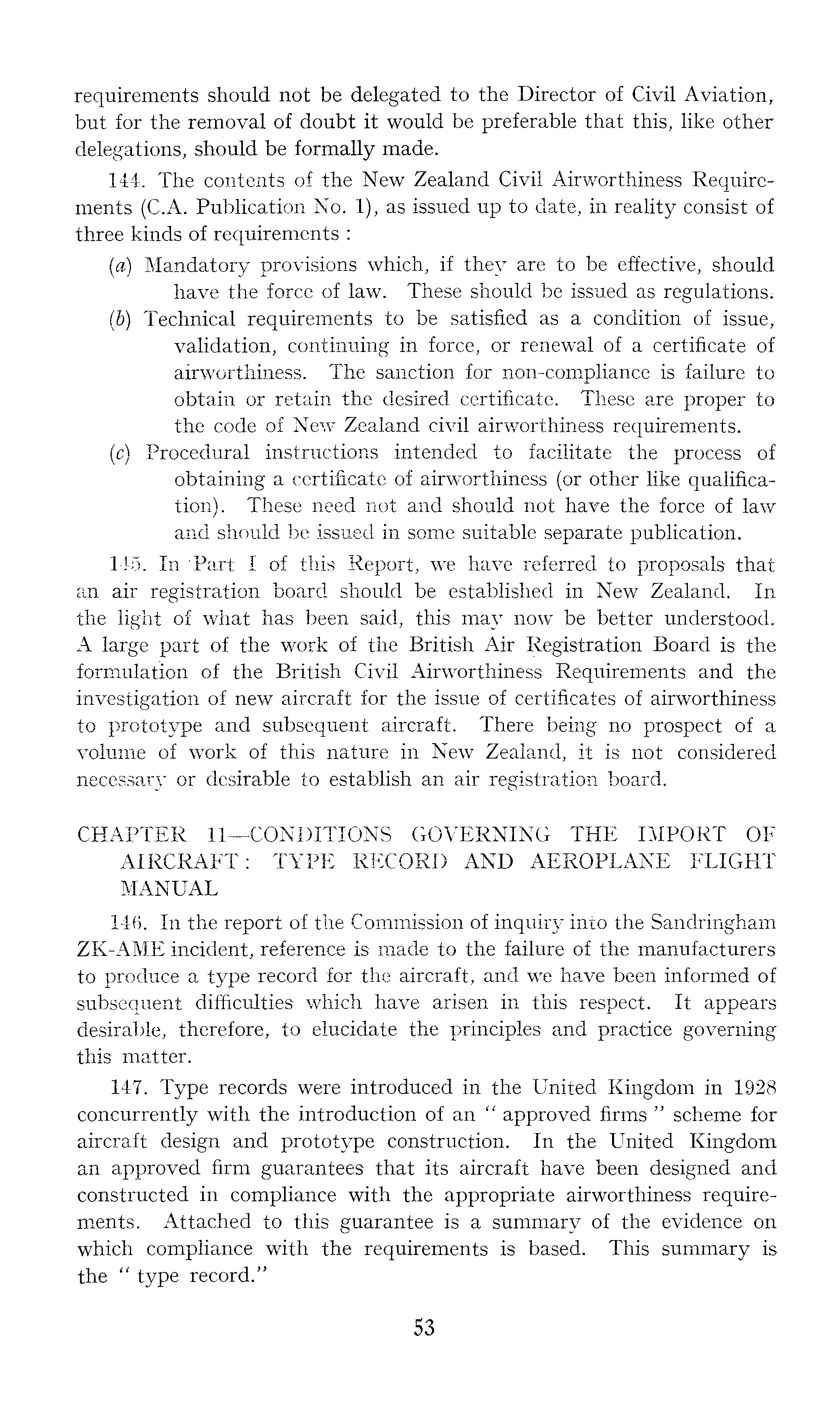 requirements should not be delegated to the Director of Civil Aviation, but for the removal of doubt it would be preferable that this, like other delegations, should be formally made. 144. The contents of the New Zealand Civil Airworthiness Requirements (C.A. Publication No. 1), as issued up to date, in reality consist of three kinds of requirements : (i a) Mandatory provisions which, if they are to be effective, should have the force of law. These should be issued as regulations; (b) Technical requirements to be satisfied as a condition of issue, validation, continuing in force, or renewal of a certificate of airworthiness. The sanction for non-compliance is failure to obtain or retain the desired certificate. These are proper to the code of New Zealand civil airworthiness requirements. (c) Procedural instructions intended to facilitate the process of obtaining a certificate of airworthiness (or other like qualification). These need not and should not have the force of law and should be issued in some suitable separate publication. 145. In Part I of this Report, we have referred to proposals that an air registration board should be established in New Zealand. In the light of what has been said, this may now be better understood. A large part of the work of the British Air Registration Board is the formulation of the British Civil Airworthiness Requirements and the investigation of new aircraft for the issue of certificates of airworthiness to prototype and subsequent aircraft. There being no prospect of a volume of work of this nature in New Zealand, it is not considered necessary or desirable to establish an air registration board. CHAPTER 11—CONDITIONS GOVERNING THE IMPORT OF AIRCRAFT: TYPE RECORD AND AEROPLANE FLIGHT MANUAL 146. In the report of the Commission of inquiry into the Sandringham ZK-AME incident, reference is made to the failure of the manufacturers to produce a type record for the aircraft, and we have been informed of subsequent difficulties which have arisen in this respect. It appears desirable, therefore, to elucidate the principles and practice governing this matter. 147. Type records were introduced in the United Kingdom in 1928 concurrently with the introduction of an " approved firms " scheme for aircraft design and prototype construction. In the United Kingdom an approved firm guarantees that its aircraft have been designed and constructed in compliance with the appropriate airworthiness requirements. Attached to this guarantee is a summary of the evidence on which compliance with the requirements is based. This summary is the " type record."