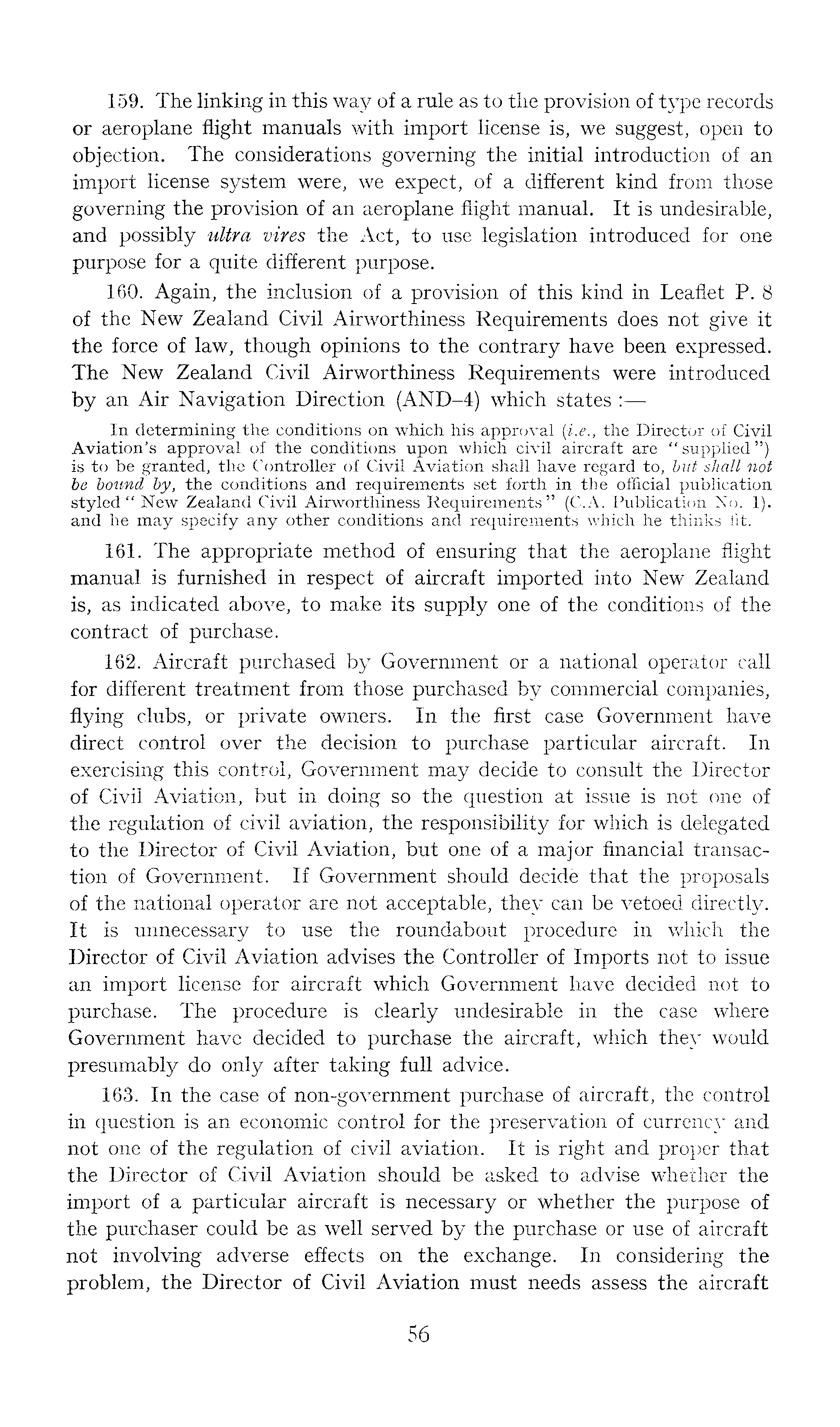 159. The linking in this way of a rale as to the provision of type records or aeroplane flight manuals with import license is, we suggest, open to objection. The considerations governing the initial introduction of an import license system were, we expect, of a different kind from those governing the provision of an aeroplane flight manual. It is undesirable, and possibly ultra vires the Act, to use legislation introduced for one purpose for a quite different purpose. 160. Again, the inclusion of a provision of this kind in Leaflet P. 8 of the New Zealand Civil Airworthiness Requirements does not give it the force of law, though opinions to the contrary have been expressed. The New Zealand Civil Airworthiness Requirements were introduced by an Air Navigation Direction (AND-4) which states : In determining the conditions on which his approval (i.e., the Director of Civil Aviation's approval of the conditions upon which civil aircraft are "supplied") is to be granted, the Controller of Civil Aviation shall have regard to, but shall not be bound by, the conditions and requirements set forth in the official publication styled" New Zealand Civil Airworthiness Requirements" (CA. Publication No. 1). and he may specify any other conditions and requirements which he thinks fit. 161. The appropriate method of ensuring that the aeroplane flight manual is furnished in respect of aircraft imported into New Zealand is, as indicated above, to make its supply one of the conditions of the contract of purchase. 162. Aircraft purchased by Government or a national operator call for different treatment from those purchased by commercial companies, flying clubs, or private owners. In the first case Government have direct control over the decision to purchase particular aircraft. In exercising this control, Government may decide to consult the Director of Civil Aviation, but in doing so the question at issue is not one of the regulation of civil aviation, the responsibility for which is delegated to the Director of Civil Aviation, but one of a major financial transaction of Government. If Government should decide that the proposals of the national operator are not acceptable, they can be vetoed directly. It is unnecessary to use the roundabout procedure in which the Director of Civil Aviation advises the Controller of Imports not to issue an import license for aircraft which Government have decided not to purchase. The procedure is clearly undesirable in the case where Government have decided to purchase the aircraft, which they would presumably do only after taking full advice. 163. In the case of non-government purchase of aircraft, the control in question is an economic control for the preservation of currency and not one of the regulation of civil aviation. It is right and proper that the Director of Civil Aviation should be asked to advise whether the import of a particular aircraft is necessary or whether the purpose of the purchaser could be as well served by the purchase or use of aircraft not involving adverse effects on the exchange. In considering the problem, the Director of Civil Aviation must needs assess the aircraft