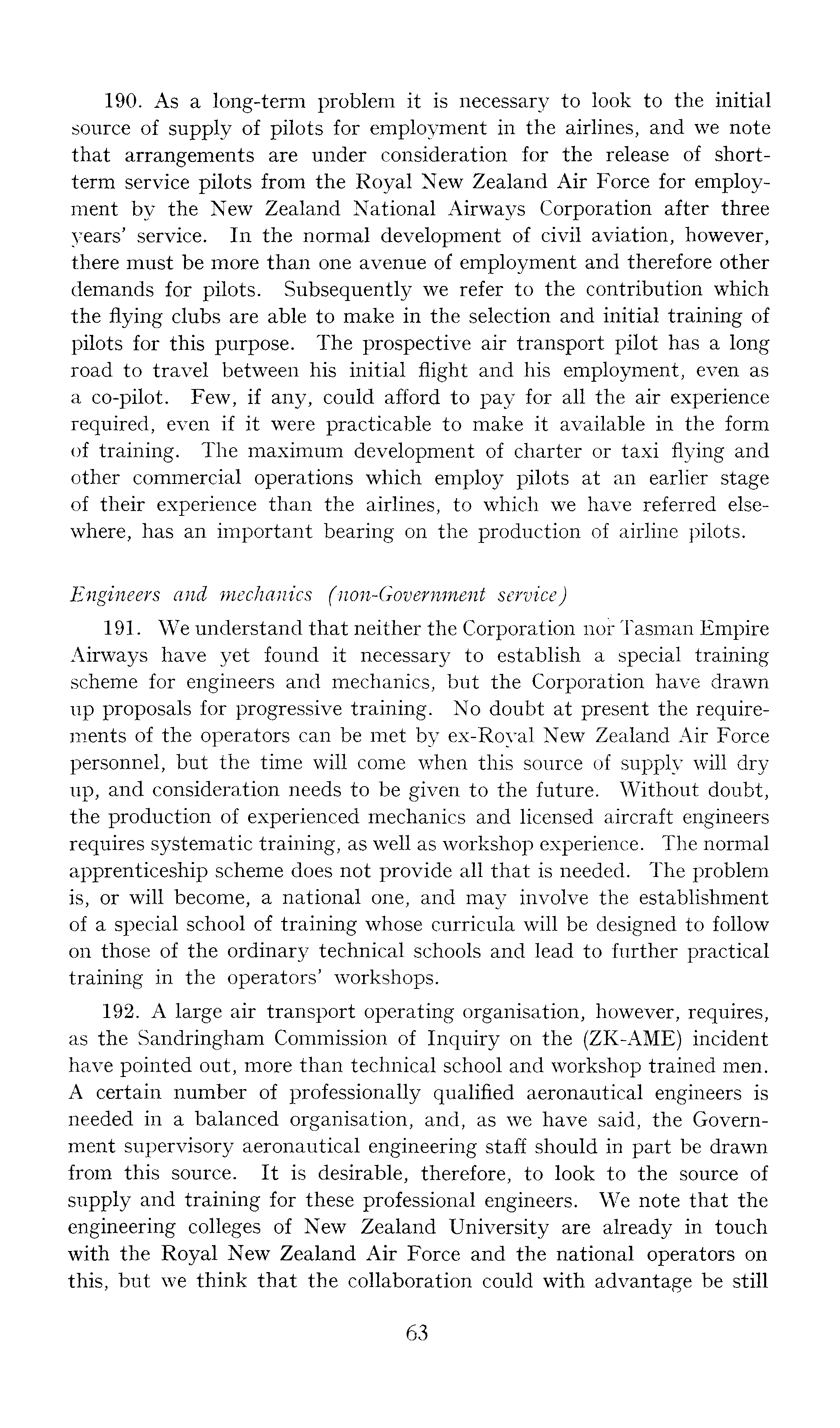 190. As a long-term problem it is necessary to look to the initial source of supply of pilots for employment in the airlines, and we note that arrangements are under consideration for the release of shortterm service pilots from the Royal New Zealand Air Force for employment by the New Zealand National Airways Corporation after three years' service. In the normal development of civil aviation, however, there must be more than one avenue of employment and therefore other demands for pilots. Subsequently we refer to the contribution which the flying clubs are able to make in the selection and initial training of pilots for this purpose. The prospective air transport pilot has a long road to travel between his initial flight and his employment, even as a co-pilot. Few, if any, could afford to pay for all the air experience required, even if it were practicable to make it available in the form of training. The maximum development of charter or taxi flying and other commercial operations which employ pilots at an earlier stage of their experience than the airlines, to which we have referred elsewhere, has an important bearing on the production of airline pilots. Engineers and mechanics (non-Government service) 191. We understand that neither the Corporation nor Tasman Empire Airways have yet found it necessary to establish a special training scheme for engineers and mechanics, but the Corporation have drawn up proposals for progressive training. No doubt at present the requirements of the operators can be met by ex-Royal New Zealand Air Force personnel, but the time will come when this source of supply will dry up, and consideration needs to be given to the future. Without doubt, the production of experienced mechanics and licensed aircraft engineers requires systematic training, as well as workshop experience. The normal apprenticeship scheme does not provide all that is needed. The problem is, or will become, a national one, and may involve the establishment of a special school of training whose curricula will be designed to follow on those of the ordinary technical schools and lead to further practical training in the operators' workshops. 192. A large air transport operating organisation, however, requires, as the Sandringham Commission of Inquiry on the (ZK-AME) incident have pointed out, more than technical school and workshop trained men. A certain number of professionally qualified aeronautical engineers is needed in a balanced organisation, and, as we have said, the Government supervisory aeronautical engineering staff should in part be drawn from this source. It is desirable, therefore, to look to the source of supply and training for these professional engineers. We note that the engineering colleges of New Zealand University are already in touch with the Royal New Zealand Air Force and the national operators on this, but we think that the collaboration could with advantage be still