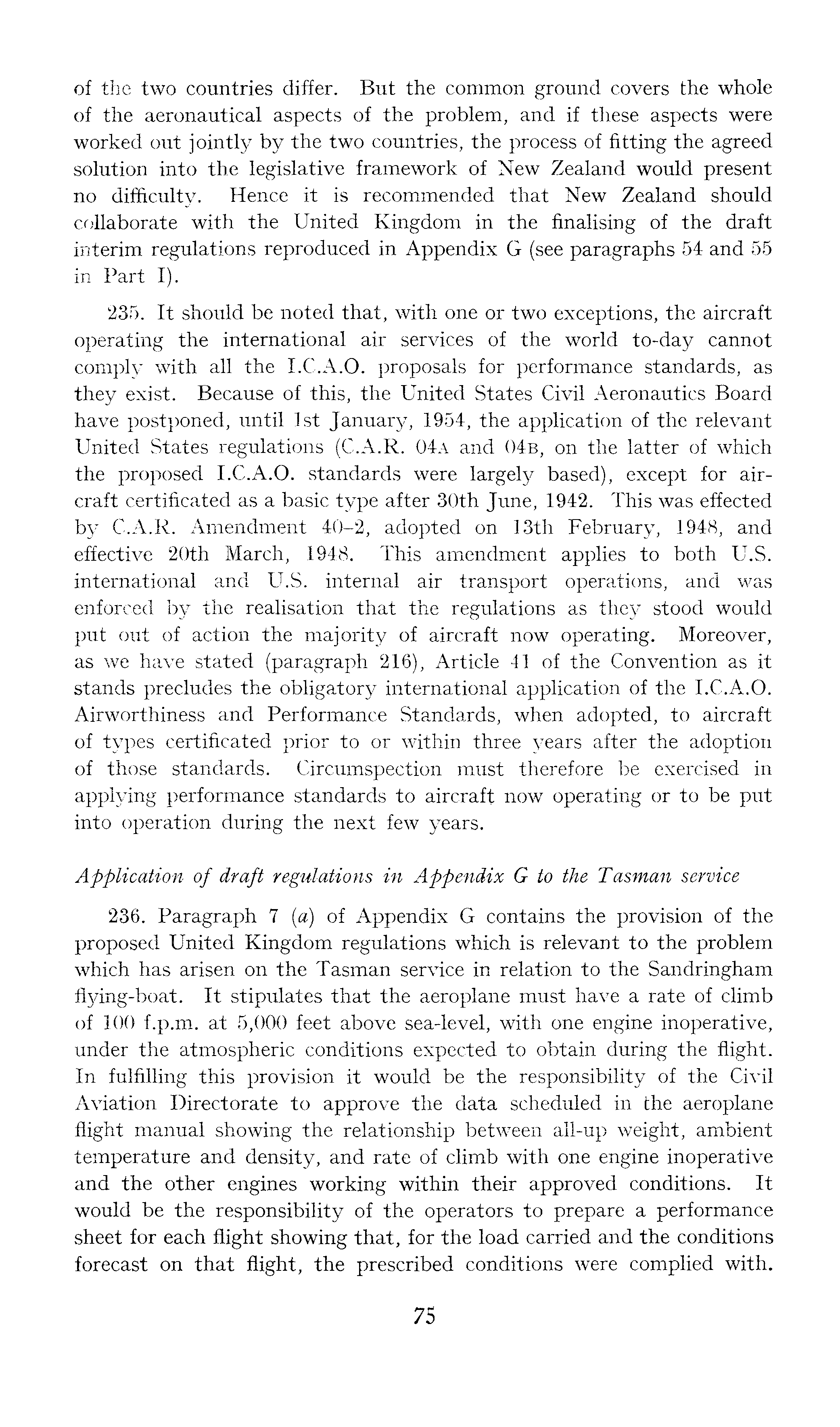 of the two countries differ. But the common ground covers the whole of the aeronautical aspects of the problem, and if these aspects were worked out jointly by the two countries, the process of fitting the agreed solution into the legislative framework of New Zealand would present no difficulty. Hence it is recommended that New Zealand should collaborate with the United Kingdom in the finalising of the draft interim regulations reproduced in Appendix G (see paragraphs 54 and 55 in* Part I). 235. It should be noted that, with one or two exceptions, the aircraft operating the international air services of the world to-day cannot comply with all the 1.C.A.0. proposals for performance standards, as they exist. Because of this, the United States Civil Aeronautics Board have postponed, until Ist January, 1954, the application of the relevant United States regulations (C.A.R. 04a and 04b, on the latter of which the proposed 1.C.A.0. standards were largely based), except for aircraft certificated as a basic type after 30th June, 1942. This was effected by C.A.R. Amendment 40-2, adopted on 13th February, 1948, and effective 20th March, 1948. This amendment applies to both U.S. international and U.S. internal air transport operations, and was enforced by the realisation that the regulations as they stood would put out of action the majority of aircraft now operating. Moreover, as we have stated (paragraph 216), Article 41 of the Convention as it stands precludes the obligatory international application of the 1.C.A.0. Airworthiness and Performance Standards, when adopted, to aircraft of types certificated prior to or within three years after the adoption of those standards. Circumspection must therefore be exercised in applying performance standards to aircraft now operating or to be put into operation during the next few years. Application of draft regulations in Appendix G to the Tasman service 236. Paragraph 7 {a) of Appendix G contains the provision of the proposed United Kingdom regulations which is relevant to the problem which has arisen on the Tasman service in relation to the Sandringham flying-boat. It stipulates that the aeroplane must have a rate of climb of 100 f.p.m. at 5,000 feet above sea-level, with one engine inoperative, under the atmospheric conditions expected to obtain during the flight. In fulfilling this provision it would be the responsibility of the Civil Aviation Directorate to approve the data scheduled in the aeroplane flight manual showing the relationship between all-up weight, ambient temperature and density, and rate of climb with one engine inoperative and the other engines working within their approved conditions. It would be the responsibility of the operators to prepare a performance sheet for each flight showing that, for the load carried and the conditions forecast on that flight, the prescribed conditions were complied with.