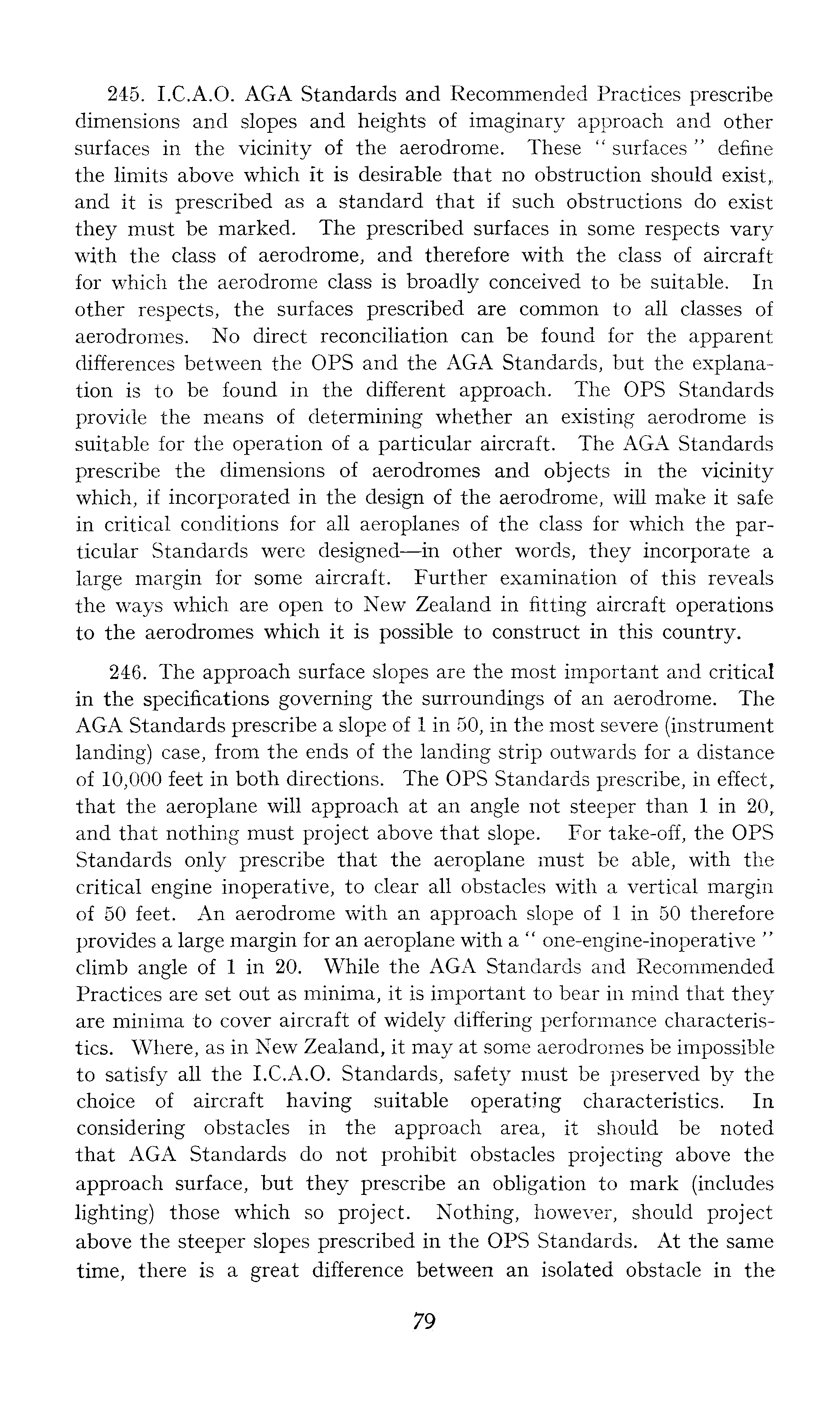 245. 1.C.A.0. AGA Standards and Recommended Practices prescribe dimensions and slopes and heights of imaginary approach and other surfaces in the vicinity of the aerodrome. These " surfaces " define the limits above which it is desirable that no obstruction should exist, and it is prescribed as a standard that if such obstructions do exist they must be marked. The prescribed surfaces in some respects vary with the class of aerodrome, and therefore with the class of aircraft for which the aerodrome class is broadly conceived to be suitable. In other respects, the surfaces prescribed are common to all classes of aerodromes. No direct reconciliation can be found for the apparent differences between the OPS and the AGA Standards, but the explanation is to be found in the different approach. The OPS Standards provide the means of determining whether an existing aerodrome is suitable for the operation of a particular aircraft. The AGA Standards prescribe the dimensions of aerodromes and objects in the vicinity which, if incorporated in the design of the aerodrome, will make it safe in critical conditions for all aeroplanes of the class for which the particular Standards were designed —in other words, they incorporate a large margin for some aircraft. Further examination of this reveals the ways which are open to New Zealand in fitting aircraft operations to the aerodromes which it is possible to construct in this country. 246. The approach surface slopes are the most important and critical in the specifications governing the surroundings of an aerodrome. The AGA Standards prescribe a slope of 1 in 50, in the most severe (instrument landing) case, from the ends of the landing strip outwards for a distance of 10,000 feet in both directions. The OPS Standards prescribe, in effect, that the aeroplane will approach at an angle not steeper than 1 in 20, and that nothing must project above that slope. For take-off, the OPS Standards only prescribe that the aeroplane must be able, with the critical engine inoperative, to clear all obstacles with a vertical margin of 50 feet. An aerodrome with an approach slope of 1 in 50 therefore provides a large margin for an aeroplane with a " one-engine-inoperative " climb angle of 1 in 20. While the AGA Standards and Recommended Practices are set out as minima, it is important to bear in mind that they are minima to cover aircraft of widely differing performance characteristics. Where, as in New Zealand, it may at some aerodromes be impossible to satisfy all the 1.C.A.0. Standards, safety must be preserved by the choice of aircraft having suitable operating characteristics. In considering obstacles in the approach area, it should be noted that AGA Standards do not prohibit obstacles projecting above the approach surface, but they prescribe an obligation to mark (includes lighting) those which so project. Nothing, however, should project above the steeper slopes prescribed in the OPS Standards. At the same time, there is a great difference between an isolated obstacle in the