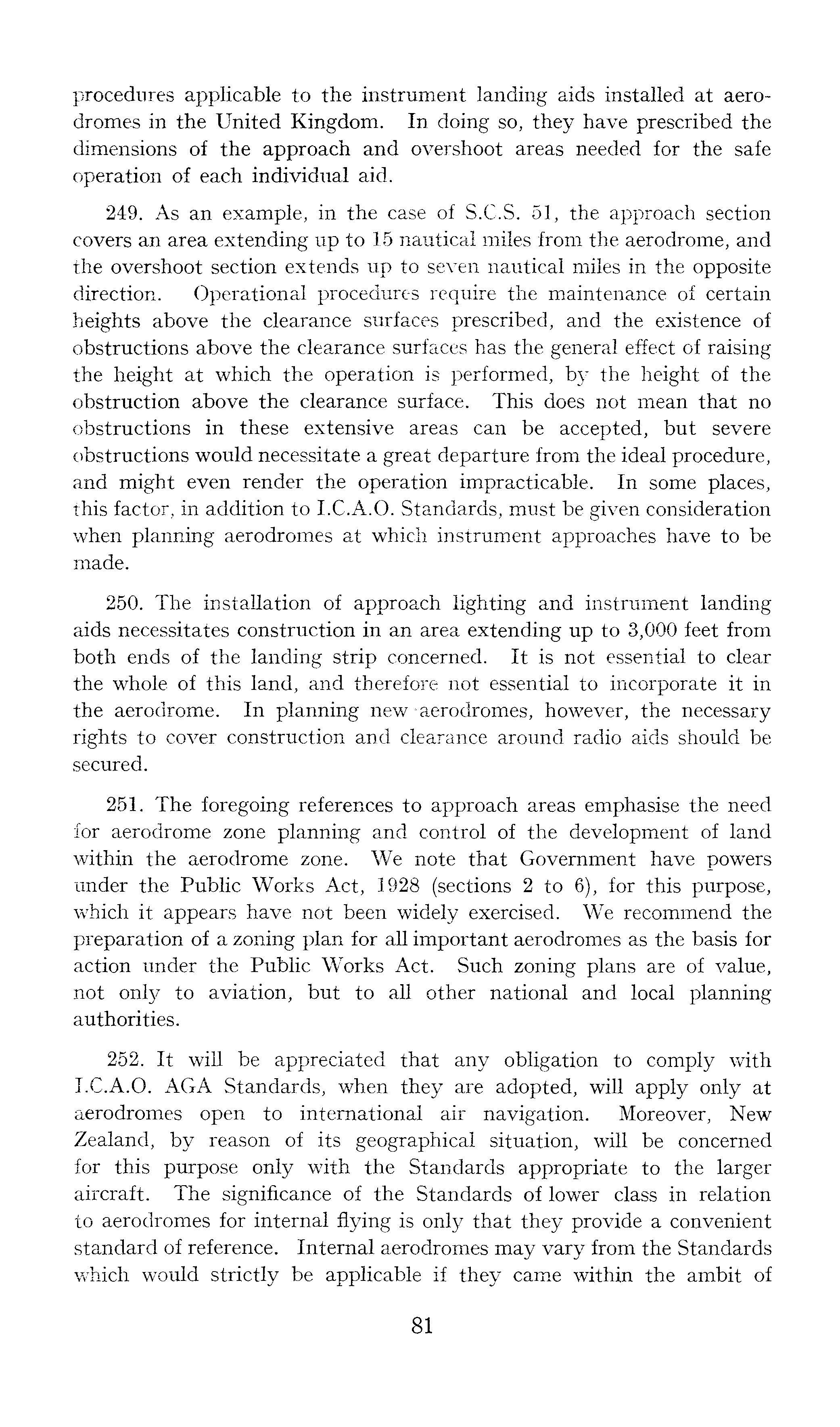procedures applicable to the instrument landing aids installed at aerodromes in the United Kingdom. In doing so, they have prescribed the dimensions of the approach and overshoot areas needed for the safe operation of each individual aid. 249. As an example, in the case of S.C.S. 51, the approach section covers an area extending up to 15 nautical miles from the aerodrome, and the overshoot section extends up to seven nautical miles in the opposite direction. Operational procedures require the maintenance of certain heights above the clearance surfaces prescribed, and the existence of obstructions above the clearance surfaces has the general effect of raising the height at which the operation is performed, by the height of the obstruction above the clearance surface. This does not mean that no obstructions in these extensive areas can be accepted, but severe obstructions would necessitate a great departure from the ideal procedure, and might even render the operation impracticable. In some places, this factor, in addition to 1.C.A.0. Standards, must be given consideration when planning aerodromes at which instrument approaches have to be made. 250. The installation of approach lighting and instrument landing aids necessitates construction in an area extending up to 3,000 feet from both ends of the landing strip concerned. It is not essential to clear the whole of this land, and therefore not essential to incorporate it in the aerodrome. In planning new -aerodromes, however, the necessary rights to cover construction and clearance around radio aids should be secured. 251. The foregoing references to approach areas emphasise the need for aerodrome zone planning and control of the development of land within the aerodrome zone. We note that Government have powers under the Public Works Act, 1928 (sections 2 to 6), for this purpose, which it appears have not been widely exercised. We recommend the preparation of a zoning plan for all important aerodromes as the basis for action under the Public Works Act. Such zoning plans are of value, not only to aviation, but to all other national and local planning authorities. 252. It will be appreciated that any obligation to comply with 1.C.A.0. AGA Standards, when they are adopted, will apply only at aerodromes open to international air navigation. Moreover, New Zealand, by reason of its geographical situation, will be concerned for this purpose only with the Standards appropriate to the larger aircraft. The significance of the Standards of lower class in relation to aerodromes for internal flying is only that they provide a convenient standard of reference. Internal aerodromes may vary from the Standards which would strictly be applicable if they came within the ambit of