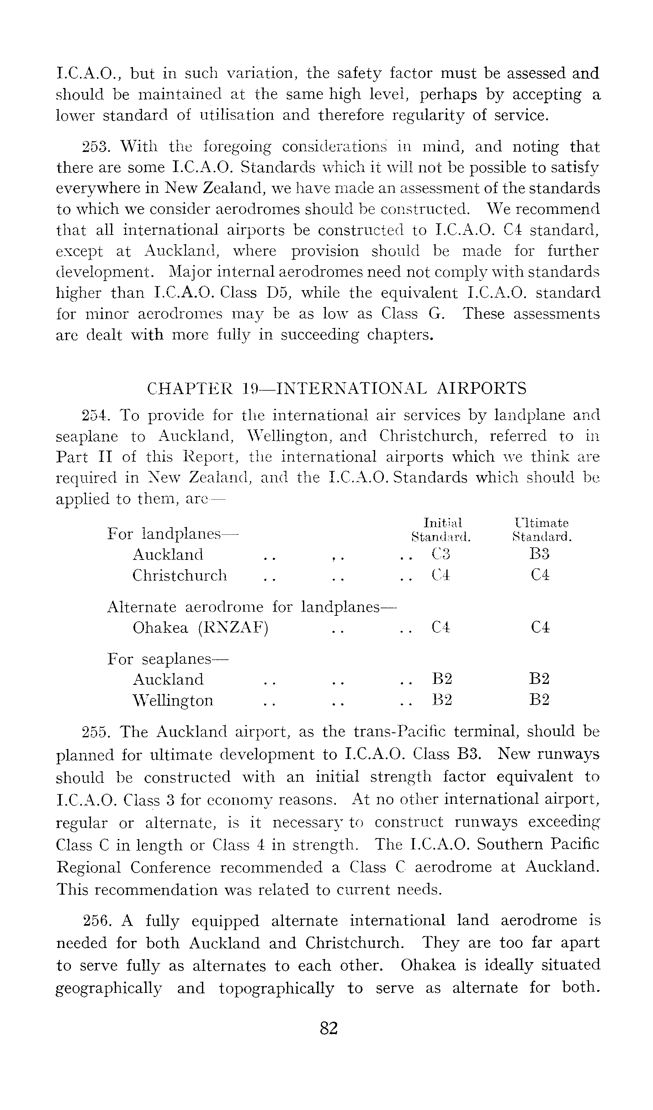 1.C.A.0., but in such variation, the safety factor must be assessed and should be maintained at the same high level, perhaps by accepting a lower standard of utilisation and therefore regularity of service. 253. With the foregoing considerations in mind, and noting that there are some 1.C.A.0. Standards which it will not be possible to satisfy everywhere in New Zealand, we have made an assessment of the standards to which we consider aerodromes should be constructed. We recommend that all international airports be constructed to 1.C.A.0. C 4 standard, except at Auckland, where provision should be made for further development. Major internal aerodromes need not comply with standards higher than 1.C.A.0. Class D 5, while the equivalent 1.C.A.0. standard for minor aerodromes may be as low as Class G. These assessments are dealt with more fully in succeeding chapters. CHAPTER 19—INTERNATIONAL AIRPORTS 254. To provide for the international air services by landplane and seaplane to Auckland, Wellington, and Christchurch, referred to in Part II of this Report, the international airports which we think are required in New Zealand, and the 1.C.A.0. Standards which should be applied to them, are — Initial Ultimate For landplanes Standard. Standard. Auckland .. ~ C 3 B3 Christchurch .. .. C 4 C 4 Alternate aerodrome for landplanes — Ohakea (RNZAF) .. .. C 4 C 4 For seaplanes — Auckland .. .. .. B2 B2 Wellington .. .. .. B2 B2 255. The Auckland airport, as the trans-Pacific terminal, should be planned for ultimate development to 1.C.A.0. Class 83. New runways should be constructed with an initial strength factor equivalent to 1.C.A.0. Class 3 for economy reasons. At no other international airport, regular or alternate, is it necessary to construct runways exceeding Class Cin length or Class 4in strength. The 1.C.A.0. Southern Pacific Regional Conference recommended a Class C aerodrome at Auckland. This recommendation was related to current needs. 256. A fully equipped alternate international land aerodrome is needed for both Auckland and Christchurch. They are too far apart to serve fully as alternates to each other. Ohakea is ideally situated geographically and topographically to serve as alternate for both.